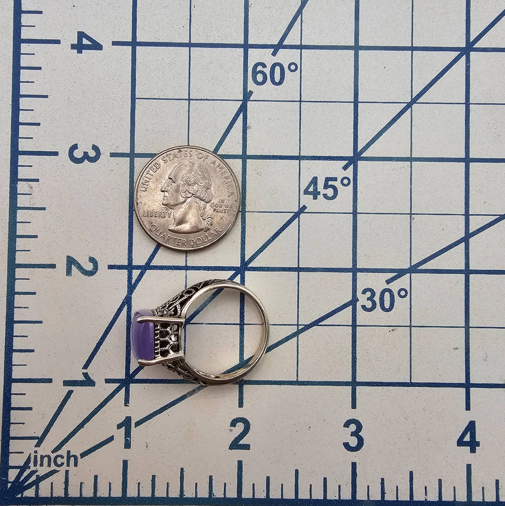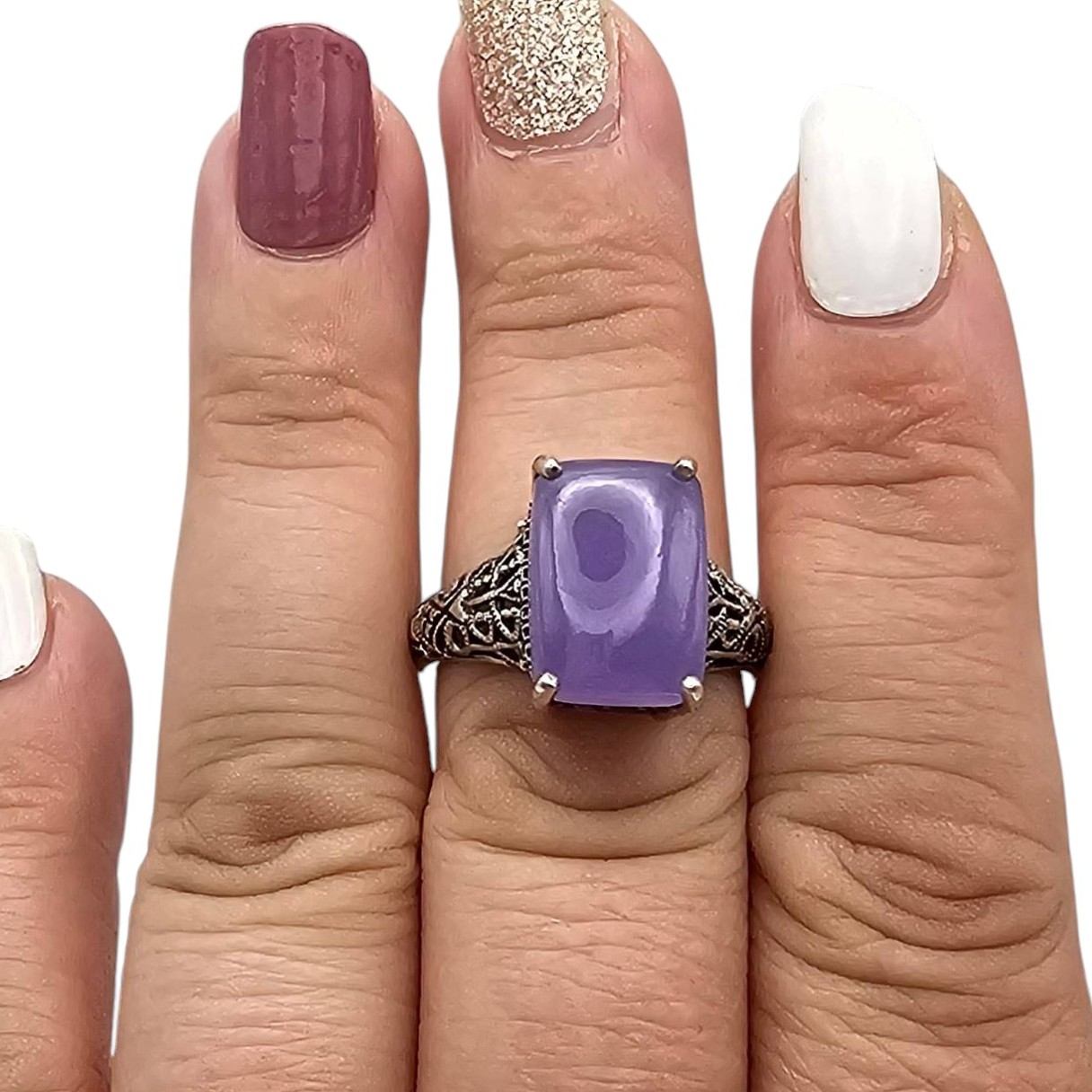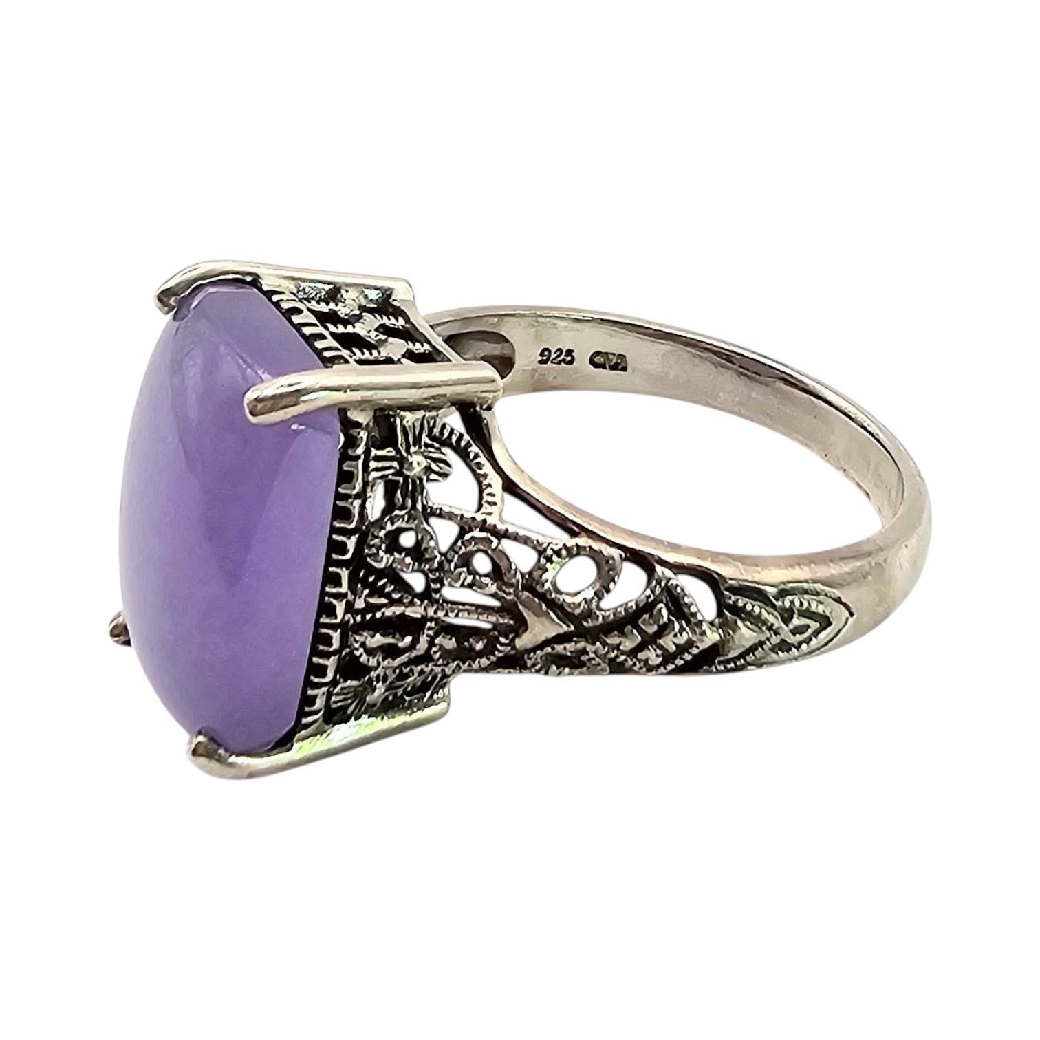 Sterling silver ring featuring an intricate band and a rectangular purple jade centerpiece. The ring is marked with 925, confirming its silver content. It is a size 8.5 and weighs 6 grams. The design includes filigree details on the band, enhancing its elegant appearance. Suitable for collectors or personal wear.