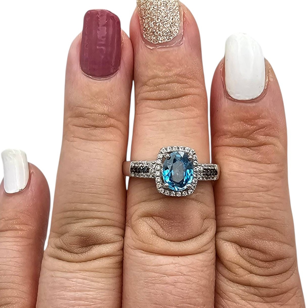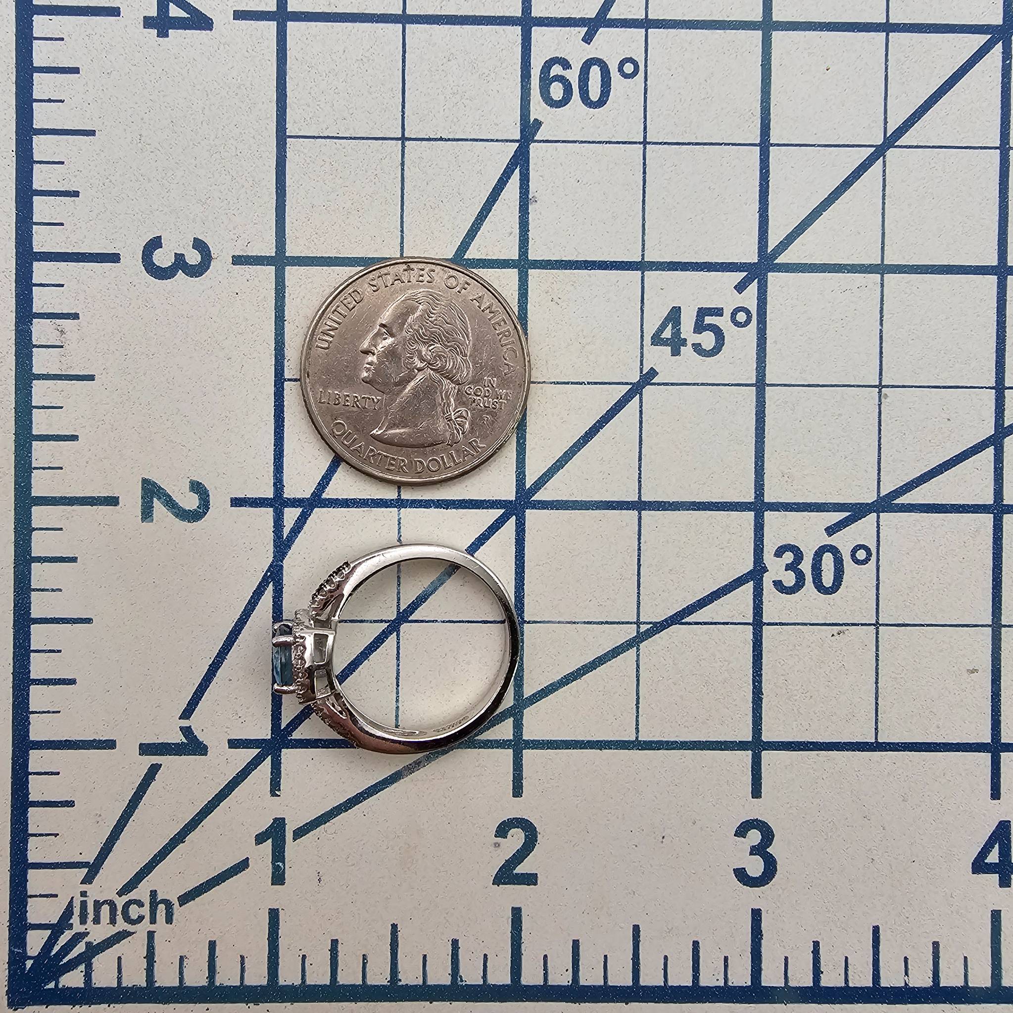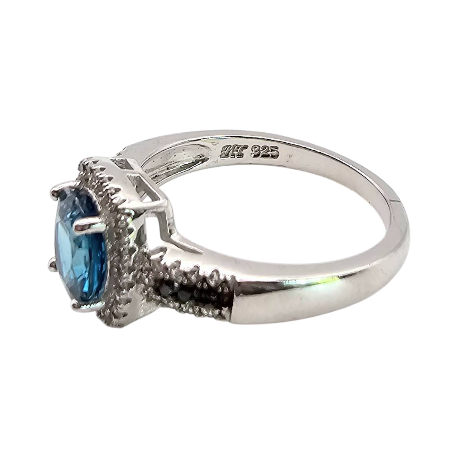 A sterling silver ring featuring a blue topaz at its center, surrounded by a halo of diamond accents. The ring weighs approximately 3.6 grams and is a size 7.5. The band showcases additional diamond accents on the sides of the center stone. The ring is in good condition with minimal signs of wear.