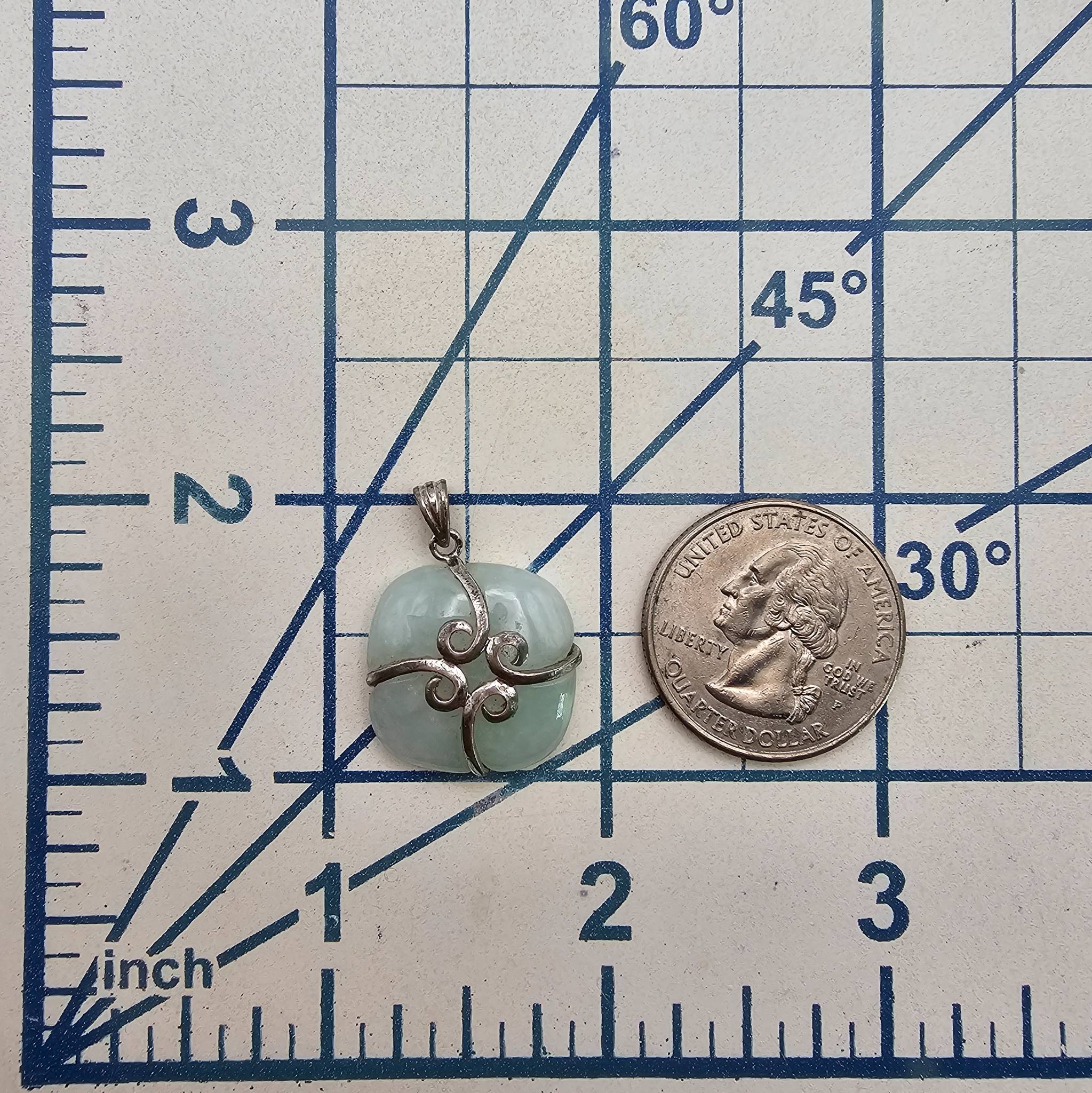A pendant featuring a pale green jade stone secured by a decorative sterling silver overlay design. The item weighs 4.6 grams and includes a small loop for attachment to a chain. Its size is shown relative to a standard U.S. quarter in the image and marked on a ruler. The pendant is in good overall condition.