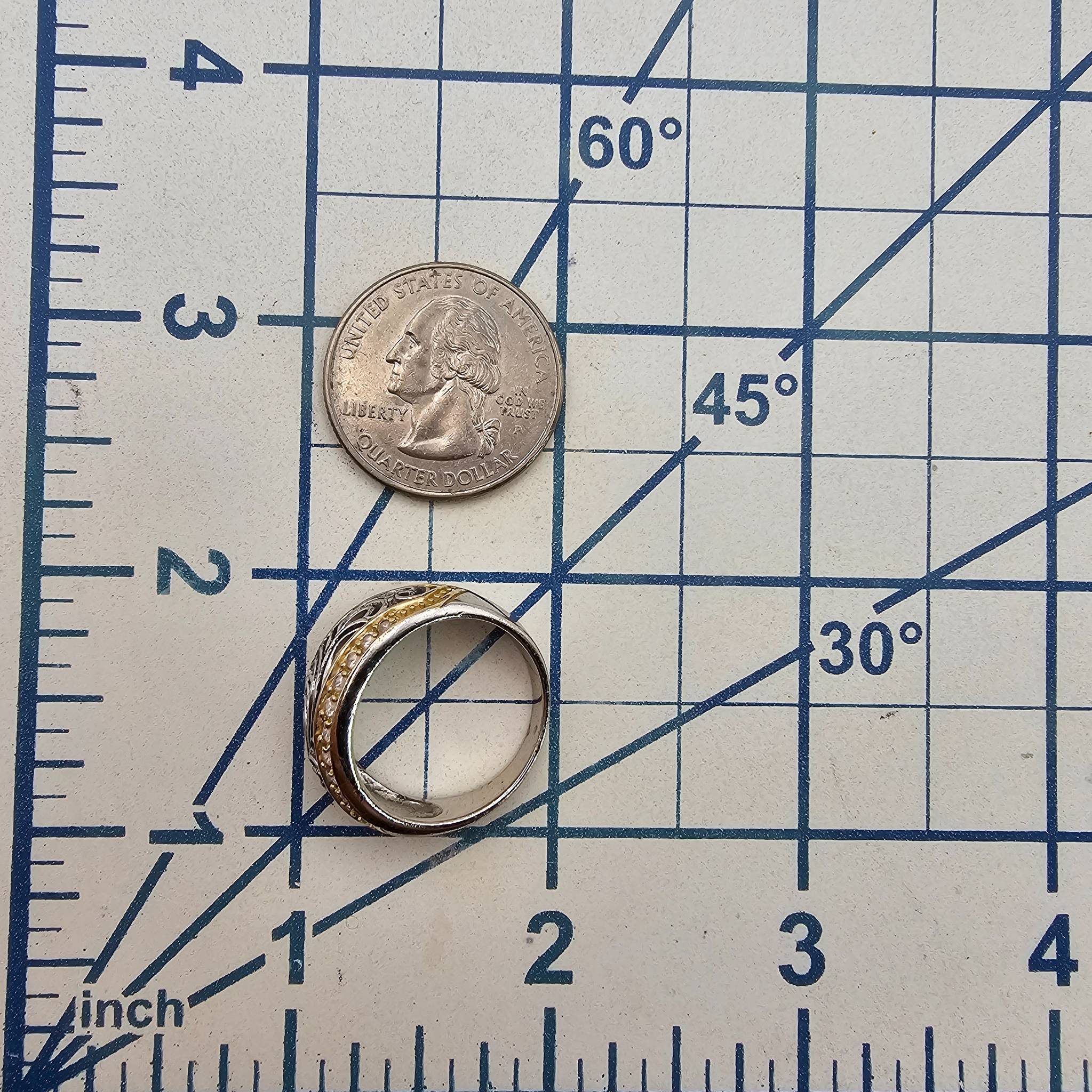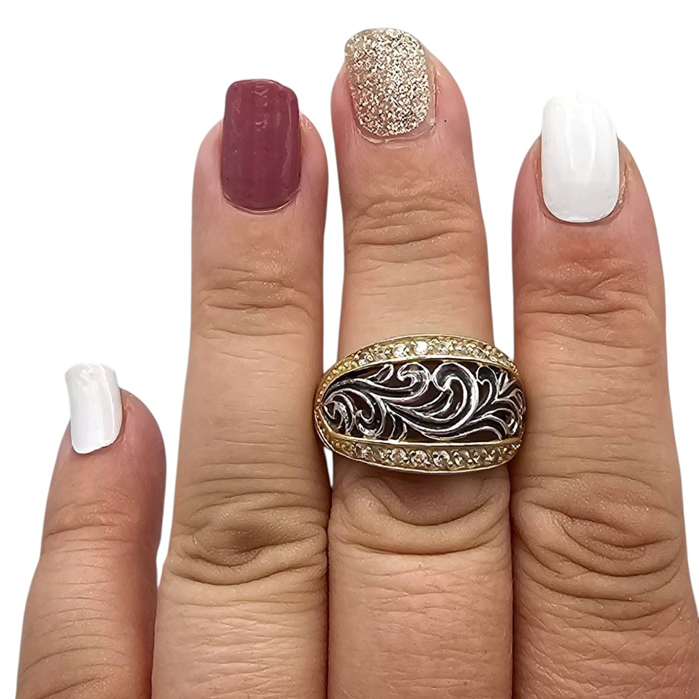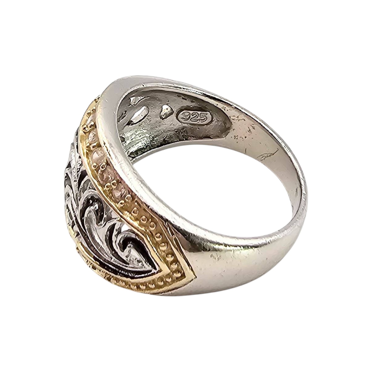 PK-designed sterling silver ring adorned with clear stones. The ring is crafted from sterling silver and features intricate patterns highlighted by gold-tone accents. The ring is a size 8.5 and weighs 6.4 grams. Includes an ornate design, providing a distinct and eye-catching appearance.