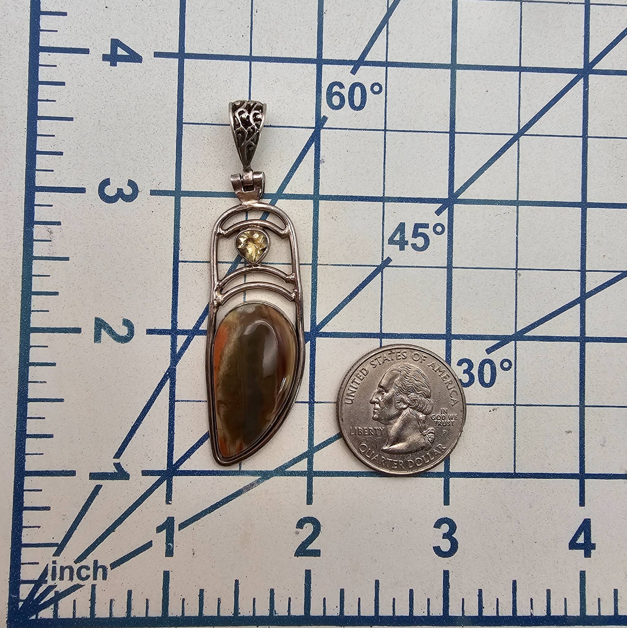 Jasper and amethyst pendant crafted in sterling silver, weighing 9.7 grams. Features a teardrop-shaped jasper stone set in an open sterling silver frame with a small amethyst stone accent. Includes an ornate silver bail for attaching to a chain. Measures approximately 3 inches in total length, as indicated by the scale.