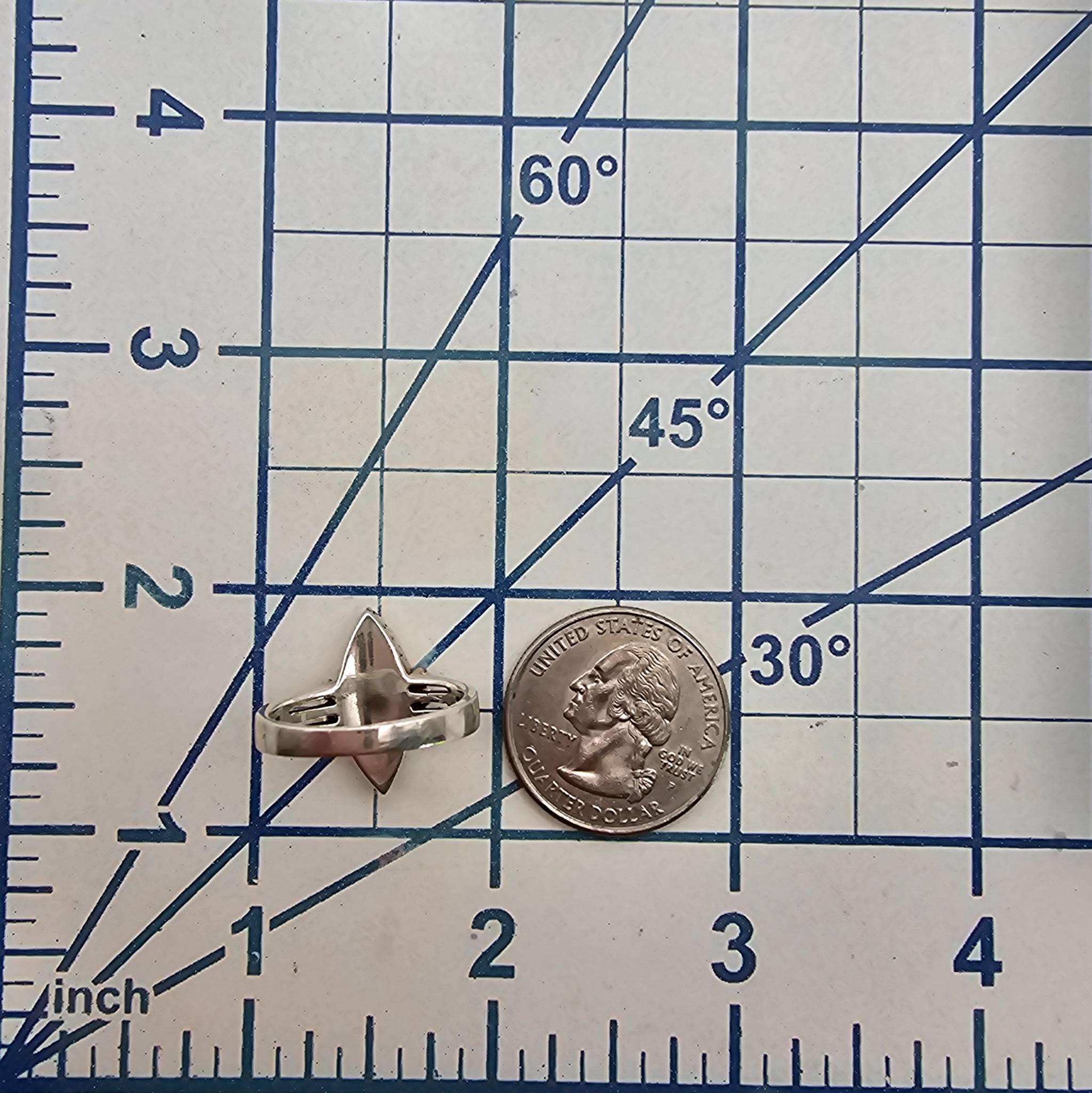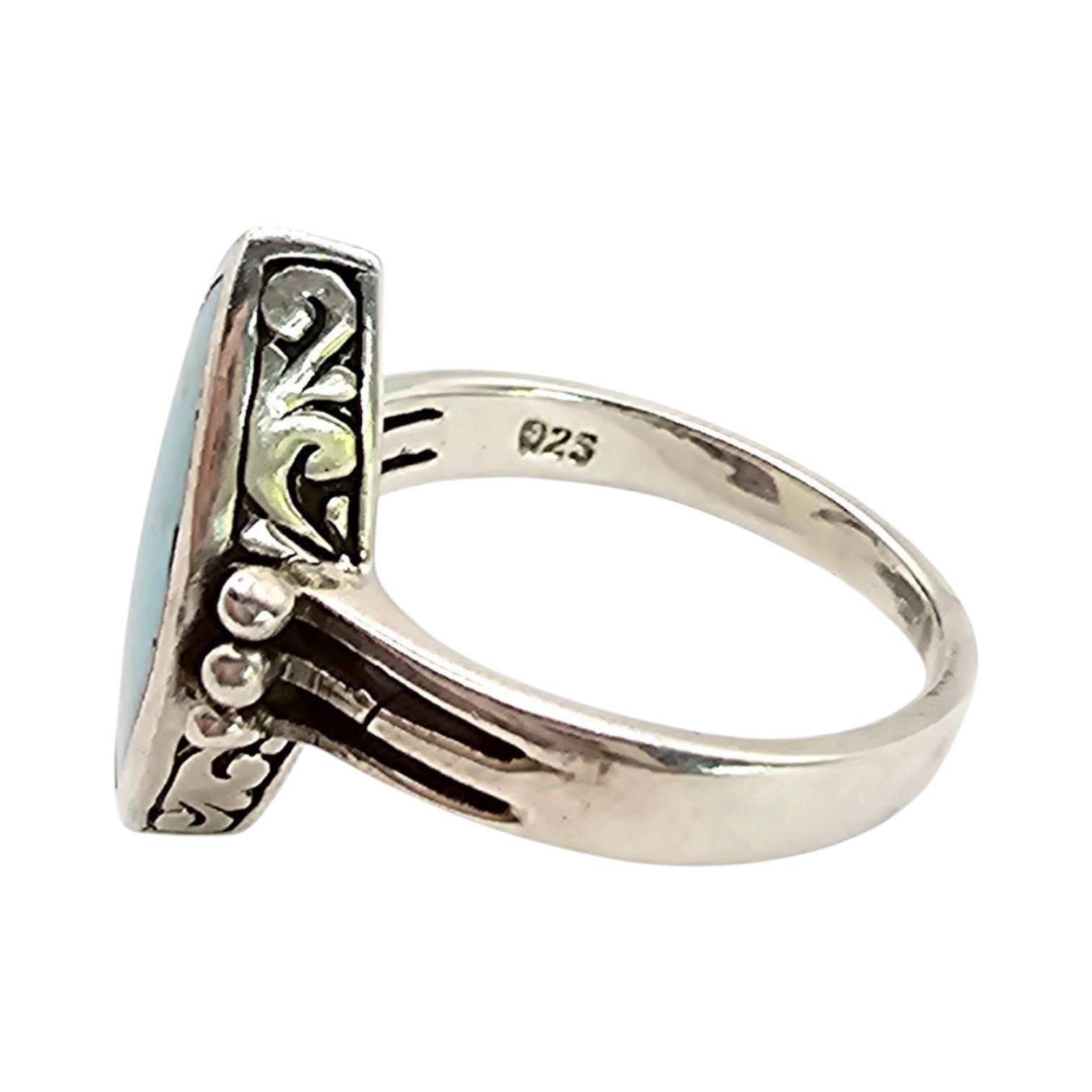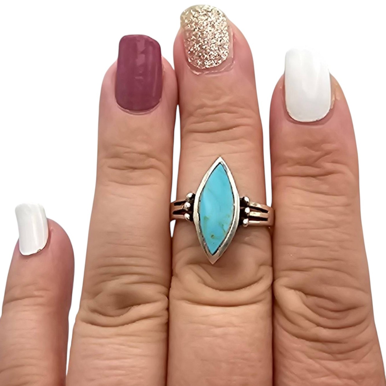 Sterling silver ring featuring a marquise-shaped turquoise stone. The band showcases delicate detailing with a split shank design. The ring is marked with 925, indicating sterling silver composition. Ring size is 7.25. A quarter shown for scale helps illustrate size.