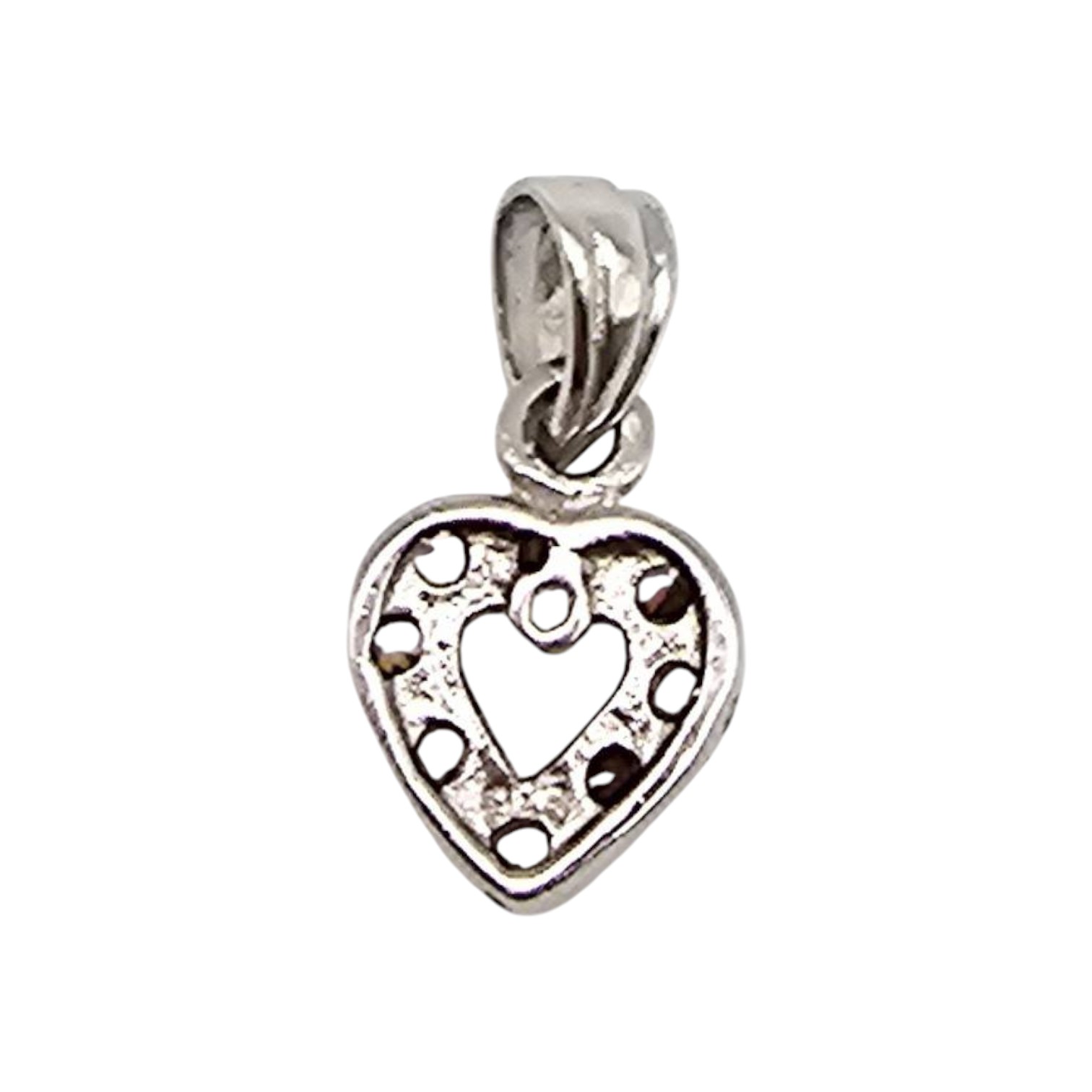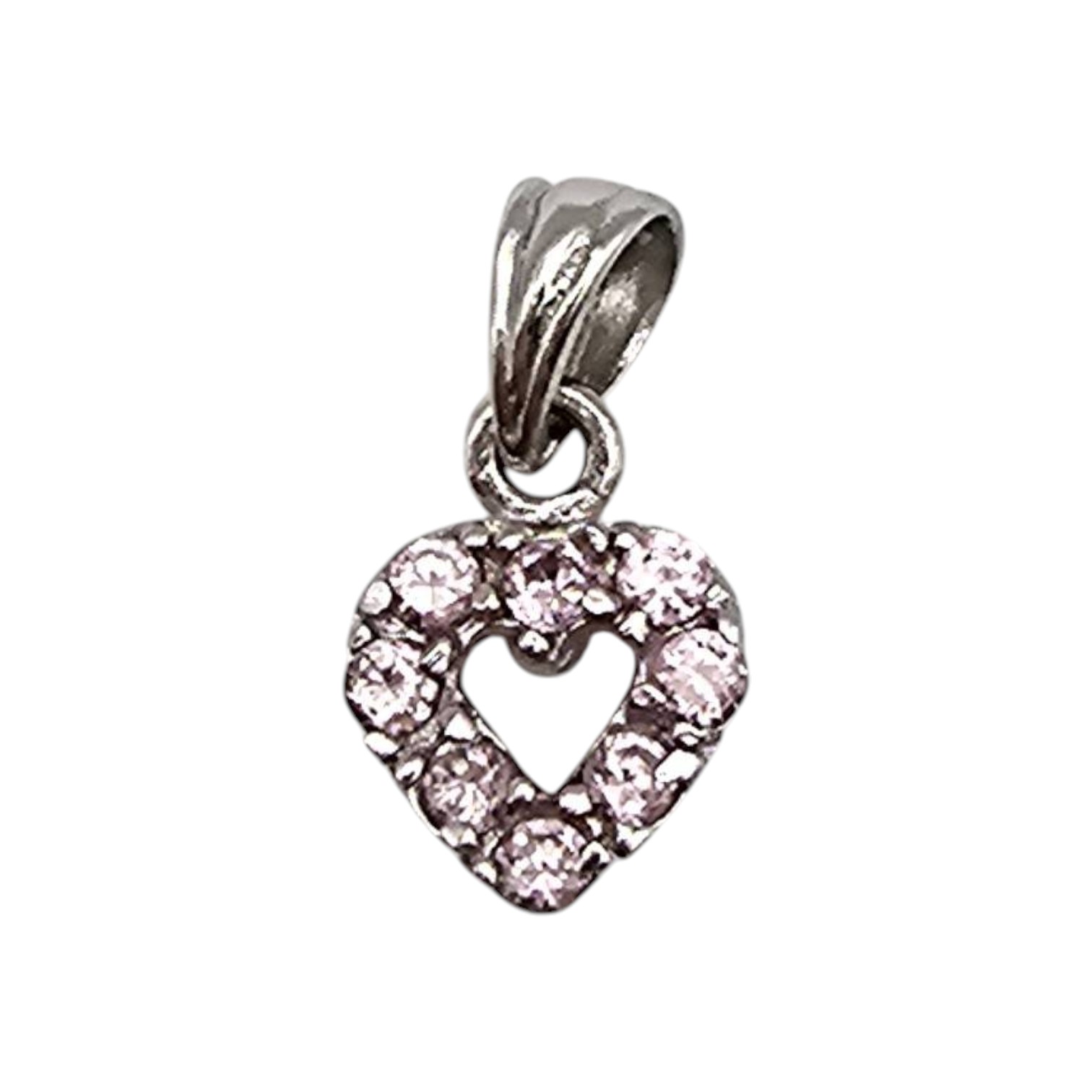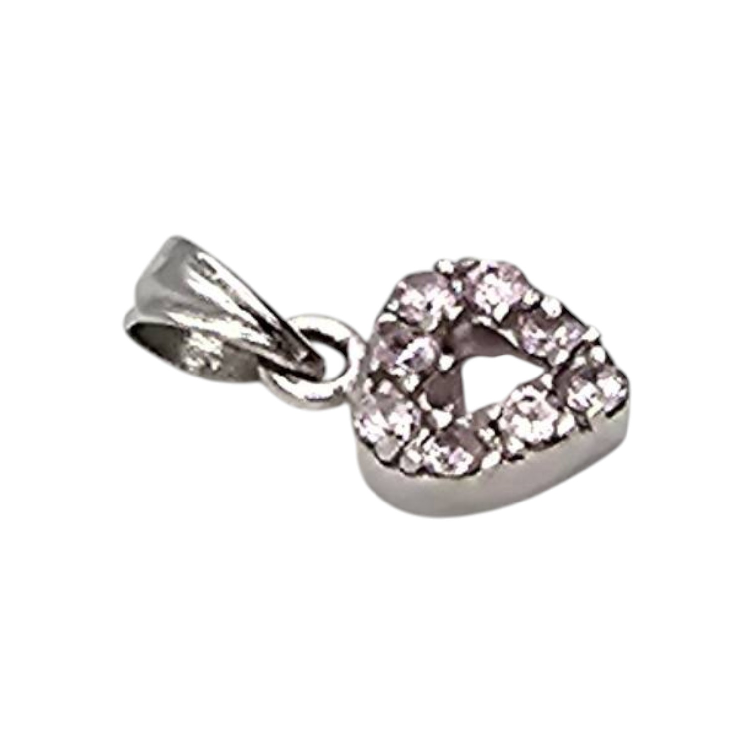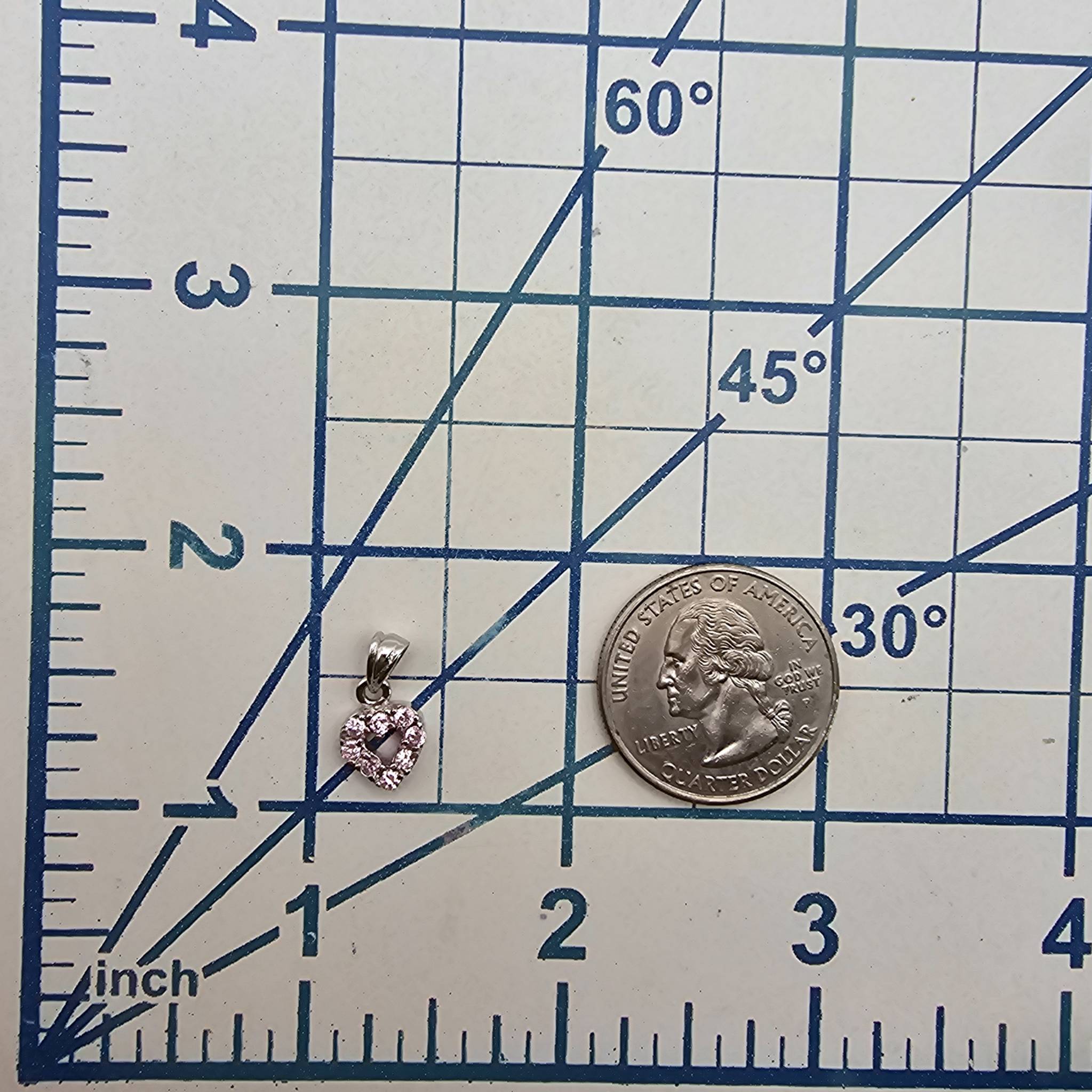 Sterling silver heart-shaped pendant featuring rhinestones and an open center design. Made of sterling silver and weighing 0.8 grams, this lightweight piece combines elegance and durability. The bail is attached securely for easy pairing with a chain. Compact in size, as shown in measurement scale image.