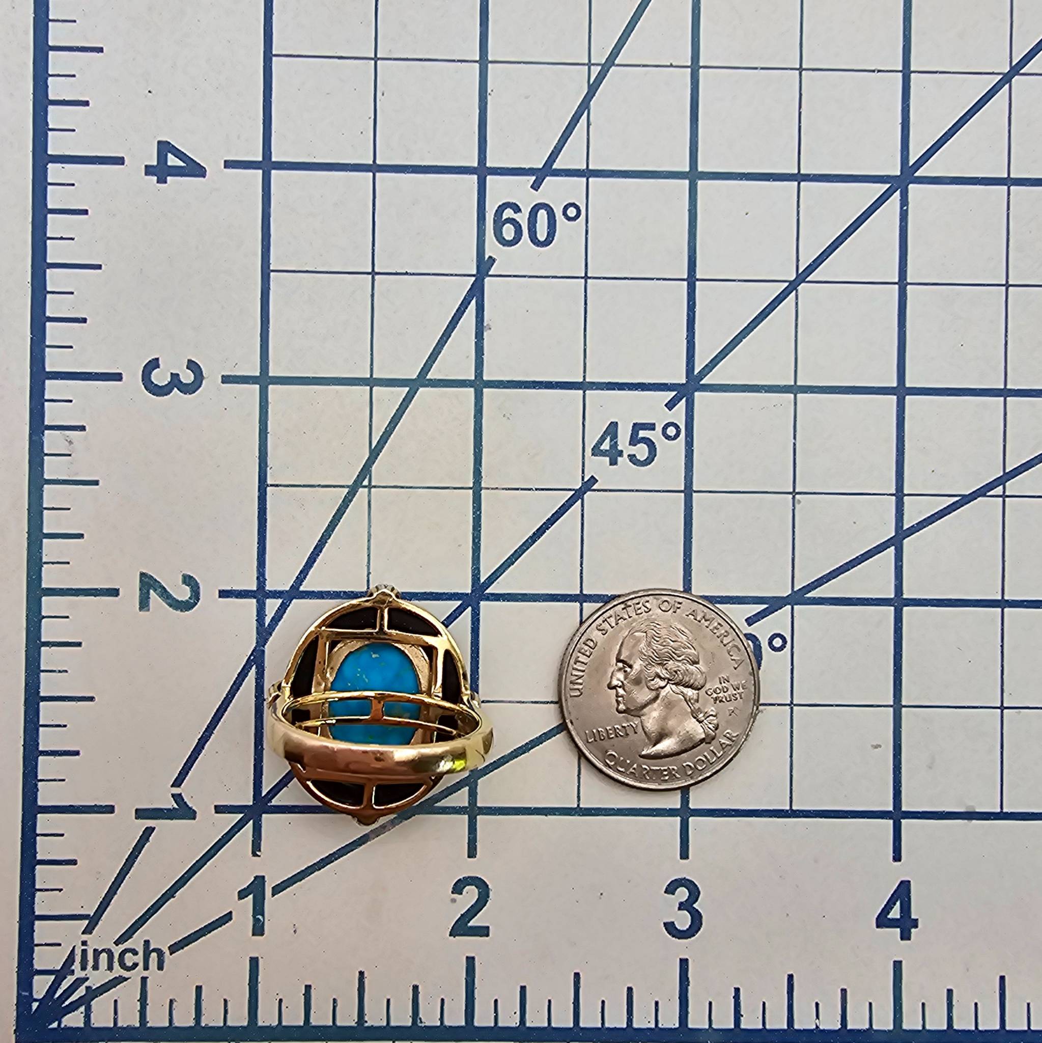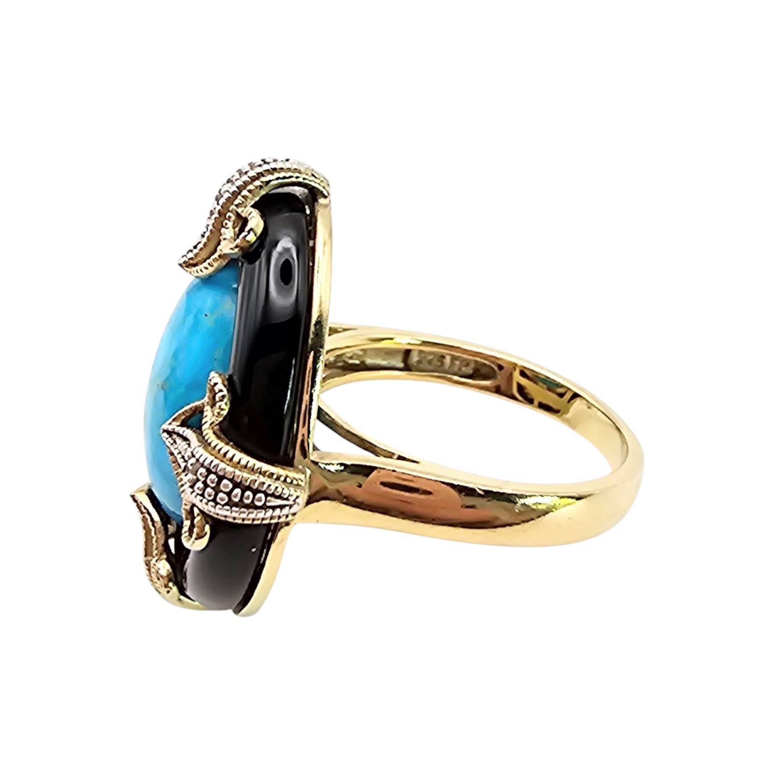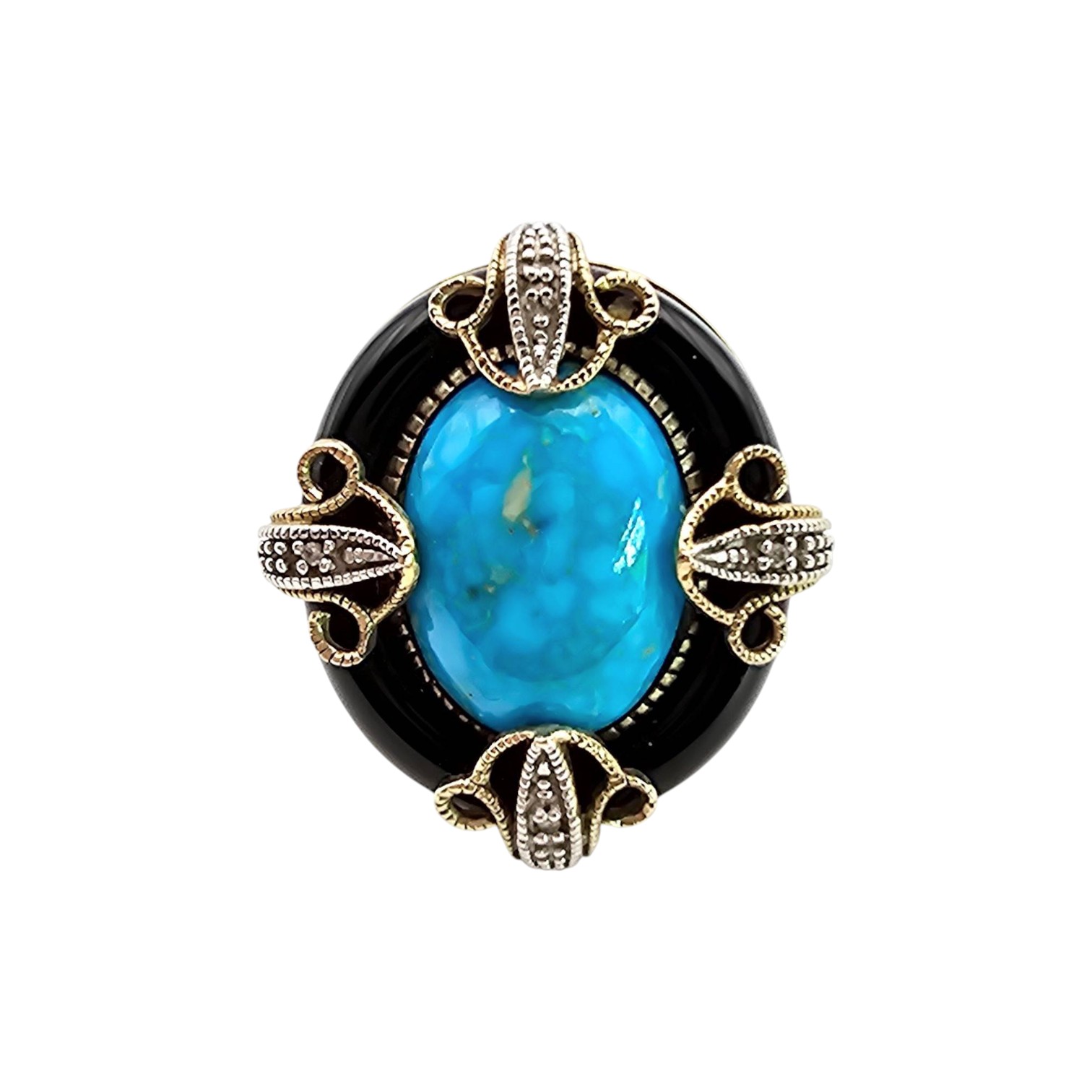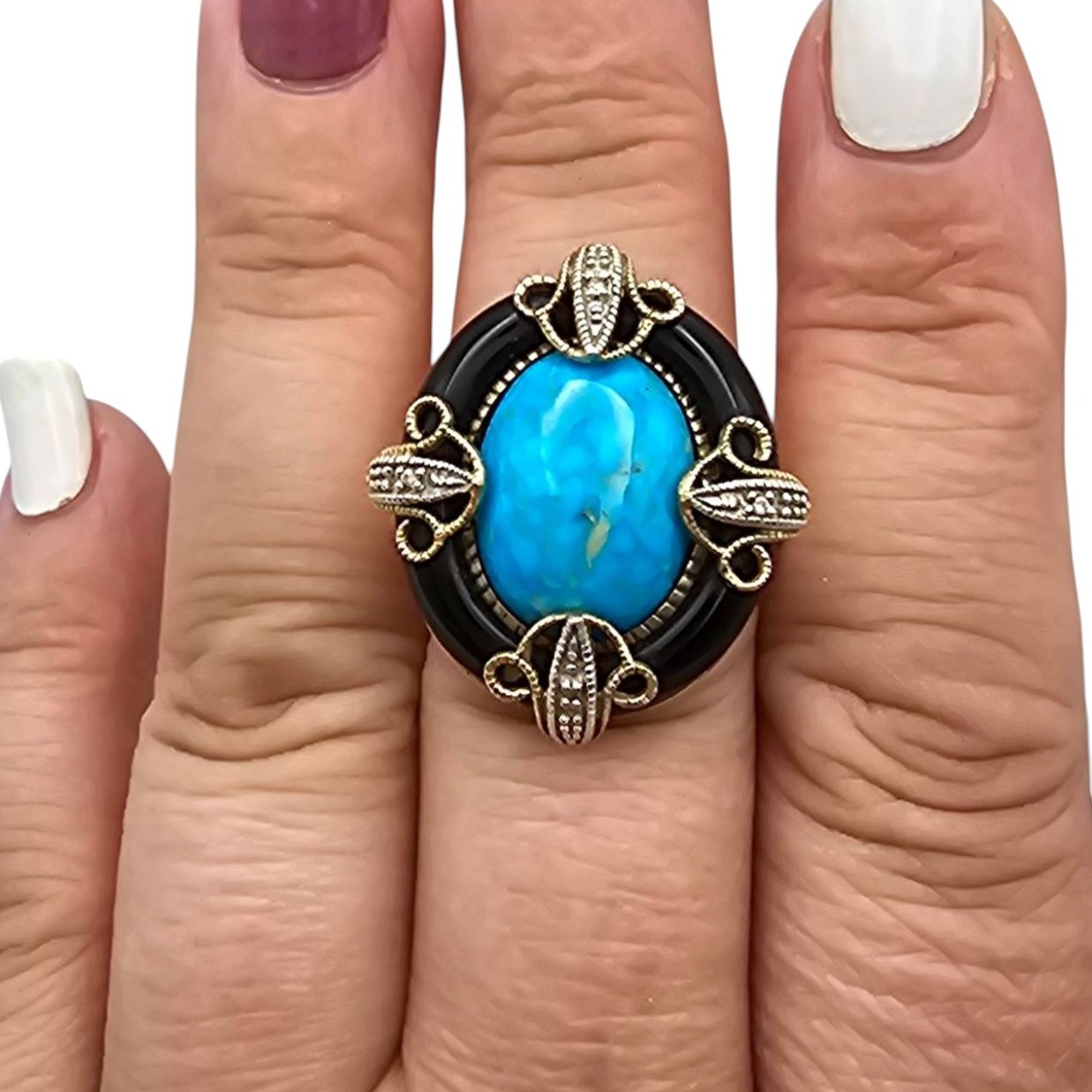 Sterling silver ring featuring a turquoise center stone surrounded by an onyx setting. The ring is decorated with intricate metalwork accents. Weighing 9.5 grams, it is a size 8.75. Beautiful craftsmanship enhances the visual appeal of this piece.
