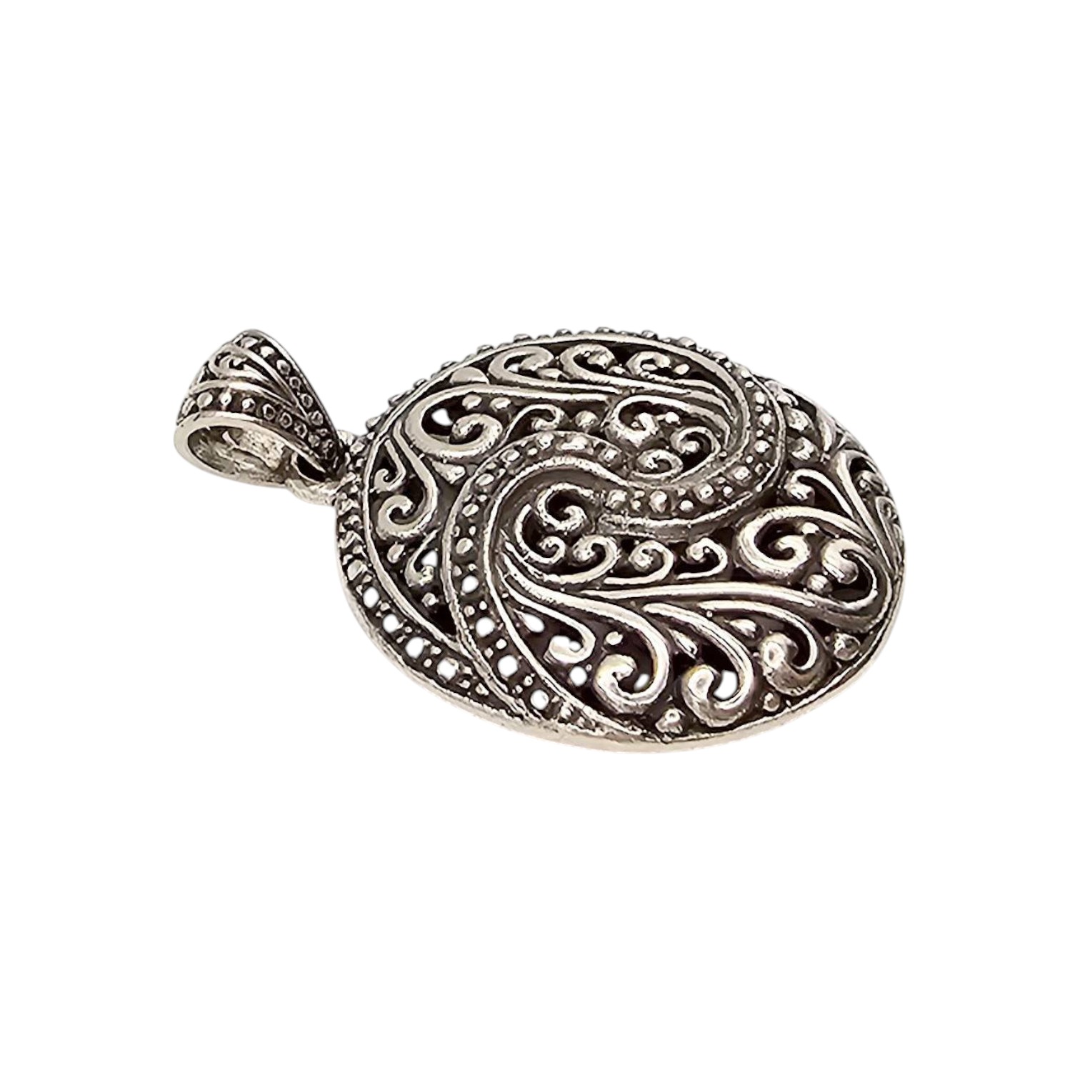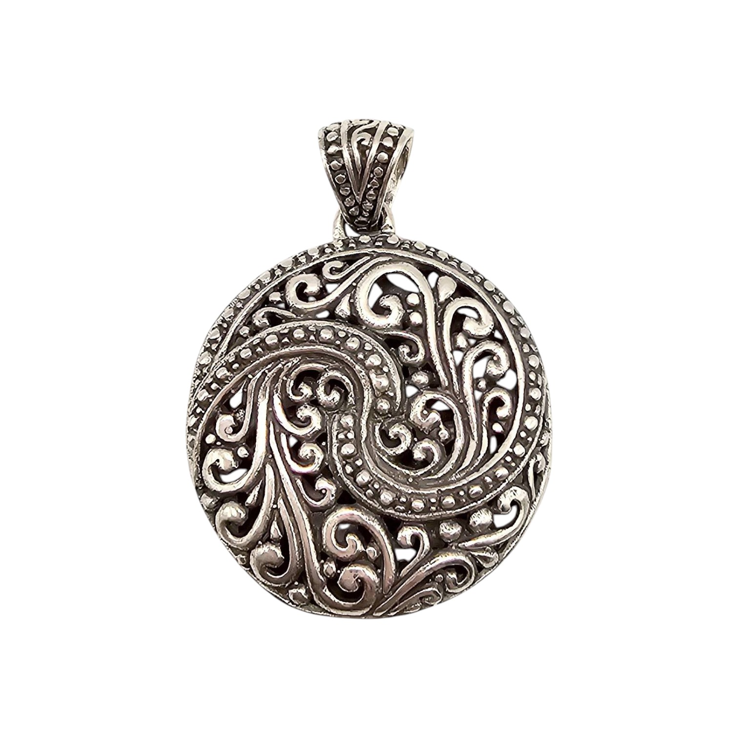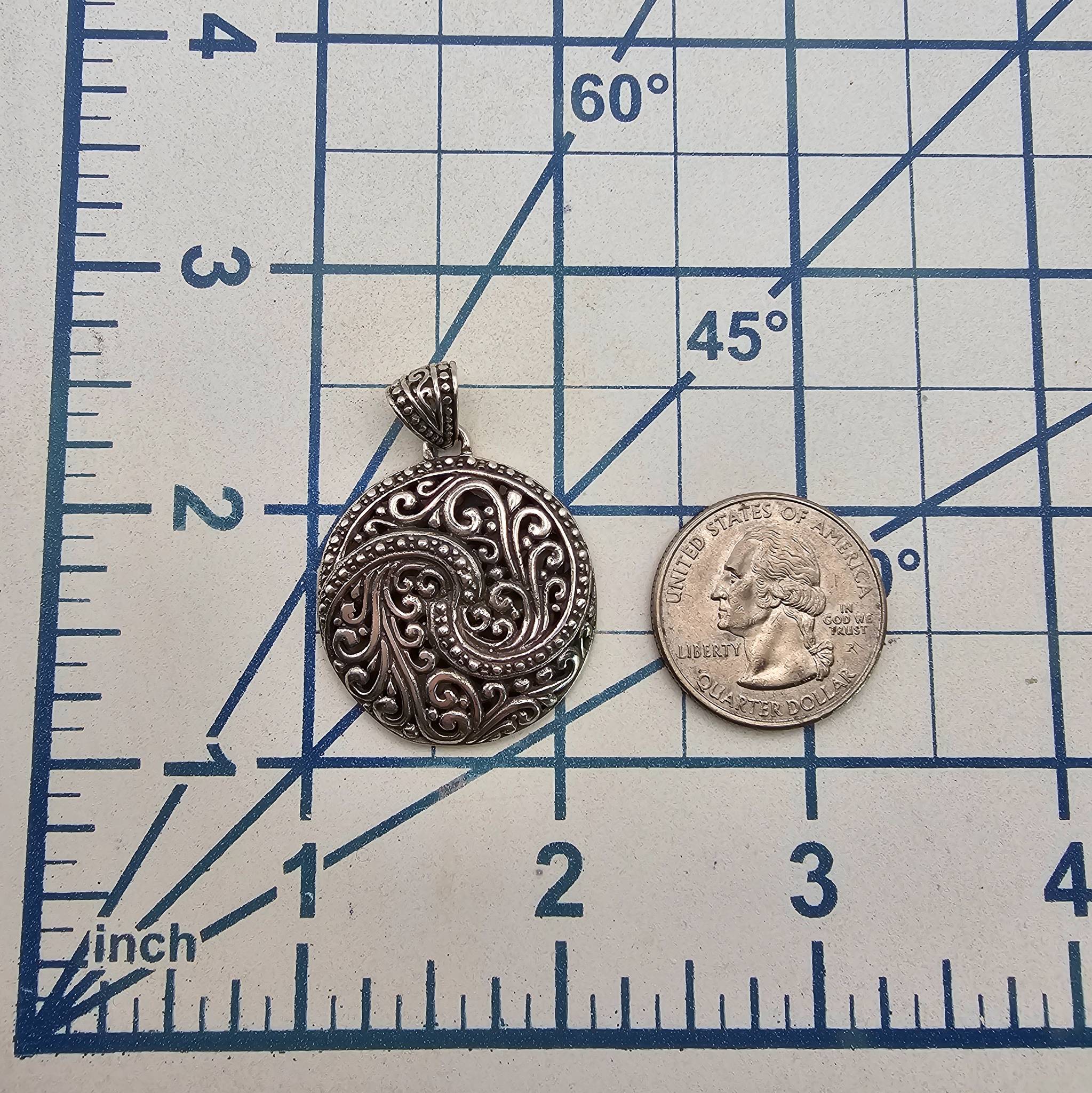 Sterling silver round pendant weighing 6.7 grams. Features an intricate swirling design on the front with textured detail, and an openwork design on the back. The pendant includes a patterned bail for attaching to a chain. The diameter of the pendant is approximately 1.5 inches.