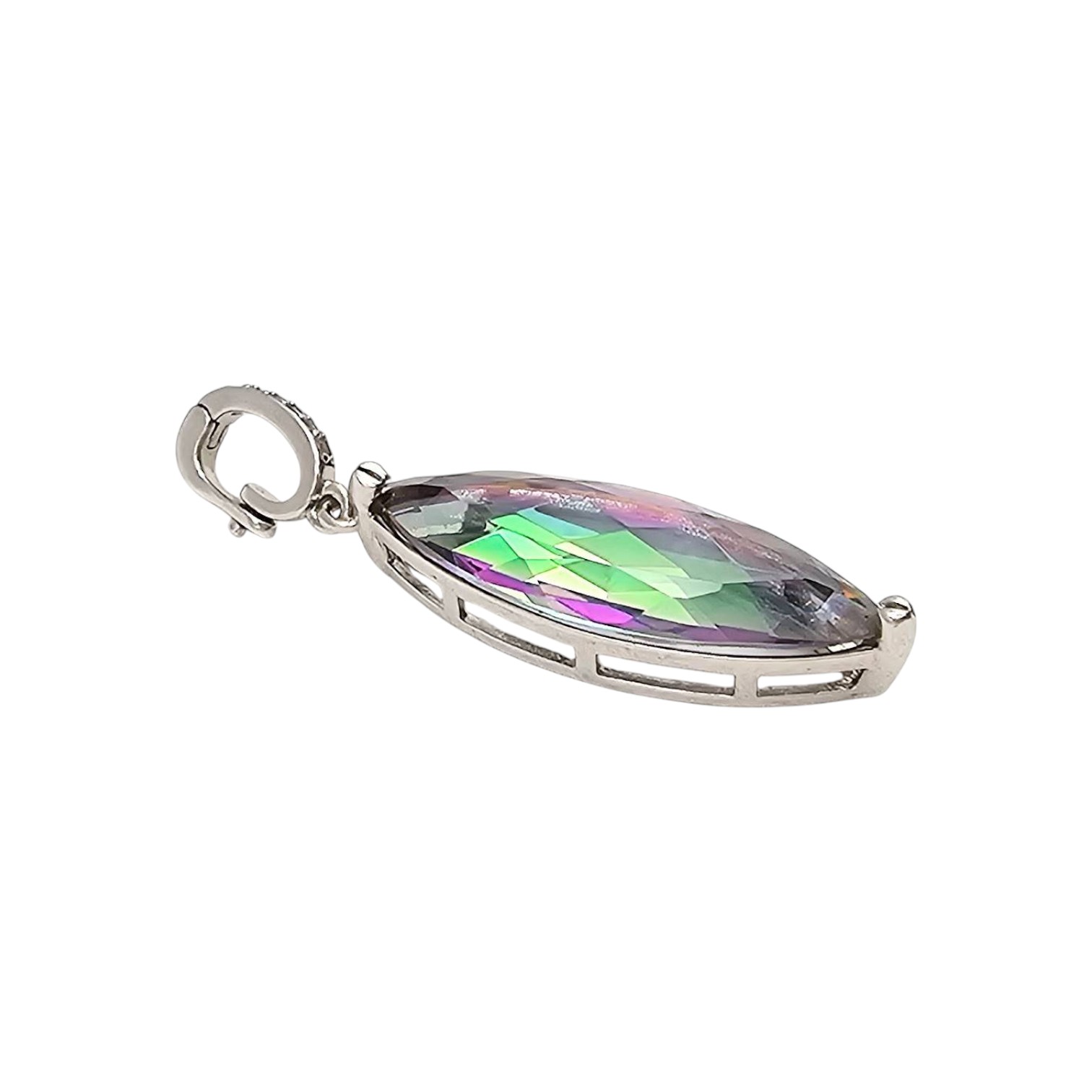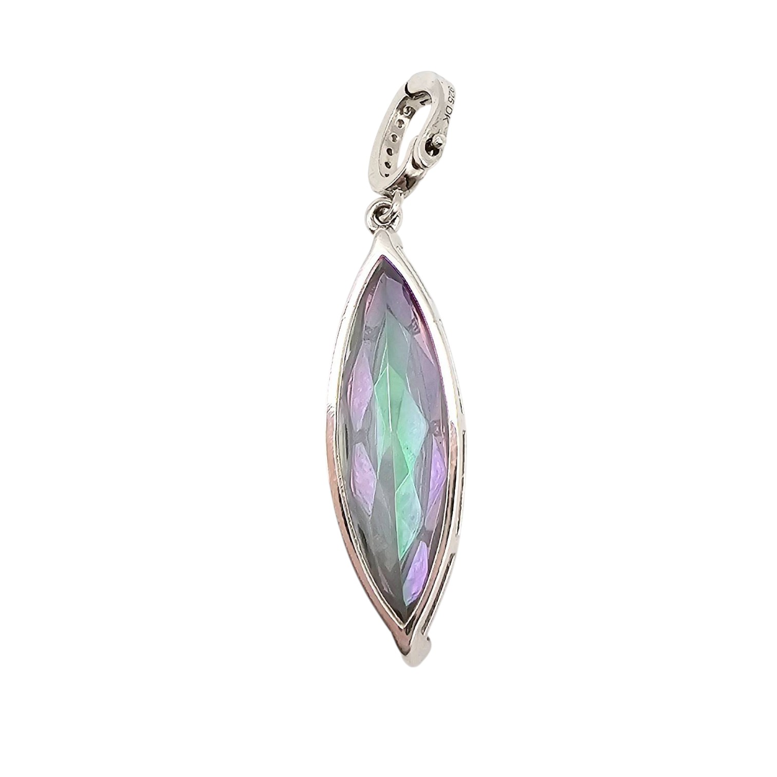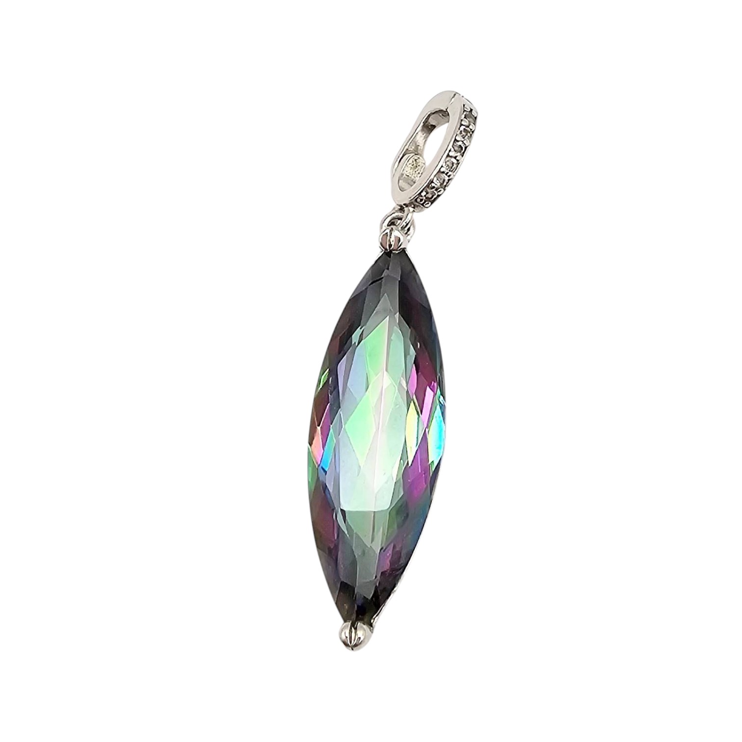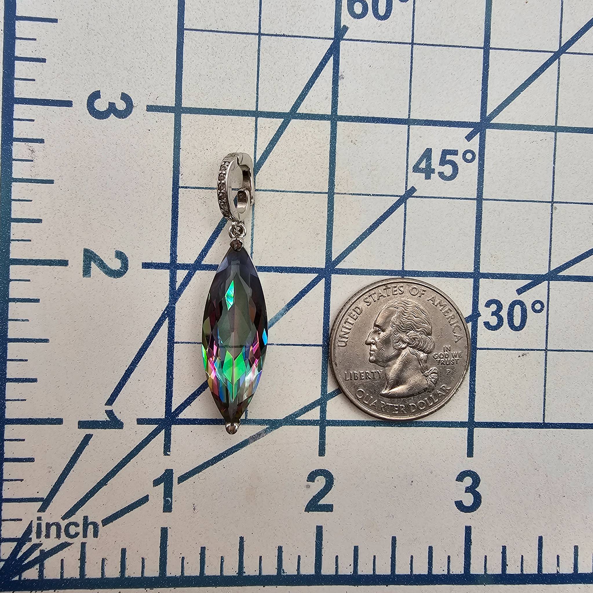Sterling silver pendant featuring a marquise-cut faceted tourmaline gemstone. The pendant weighs 4.2 grams and includes an ornate silver bail. The gemstone displays iridescent multicolored tones. Approximately 2 inches in total length, including the bail. Ideal for use with a chain or necklace (chain not included).