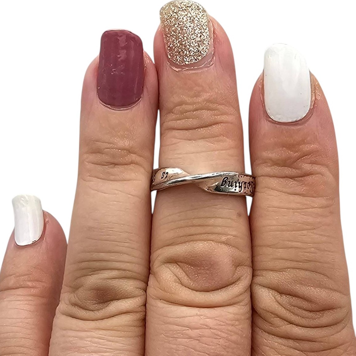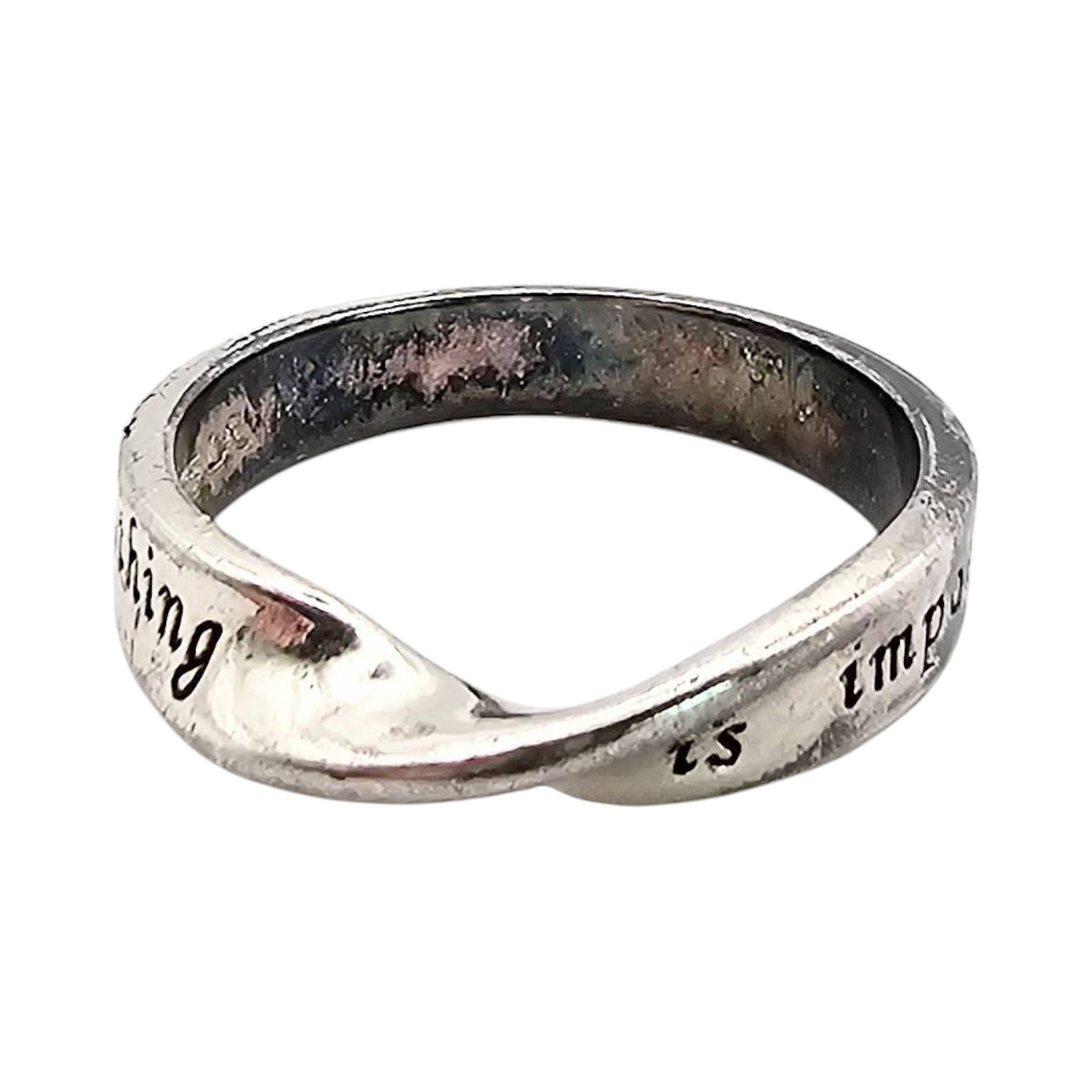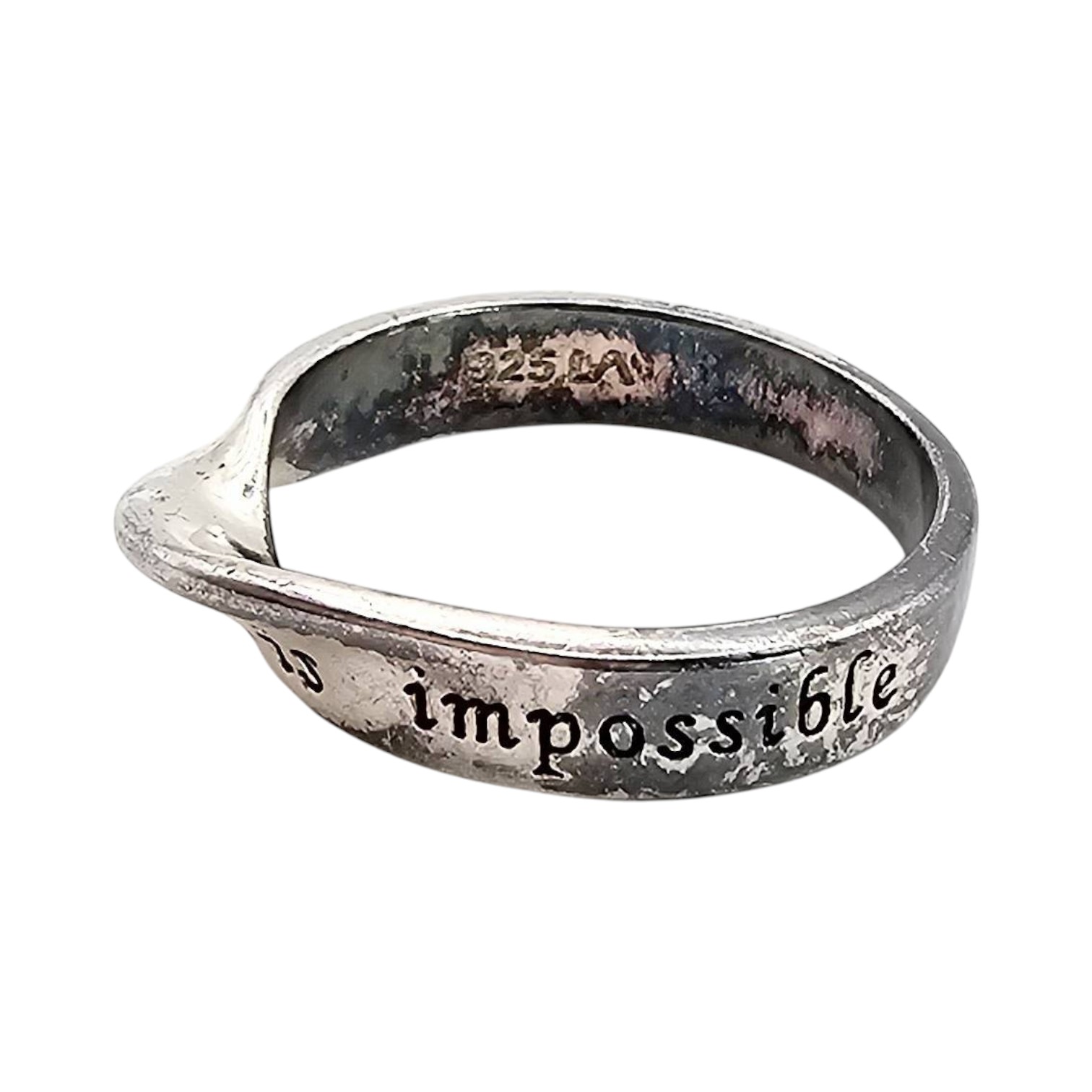 Sterling silver ring marked 925, weighing approximately 3.4g with a US size of 6.5. The ring features an inscription, “Nothing is impossible”, with a unique twisted design. The internal band also shows visible hallmarks confirming its sterling silver composition. In good overall condition with minor surface wear consistent with prior use.