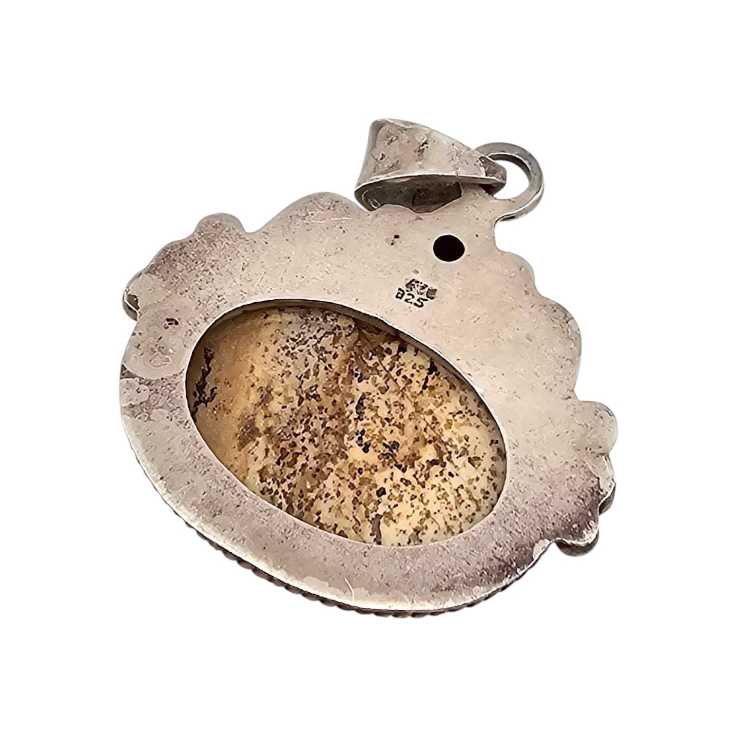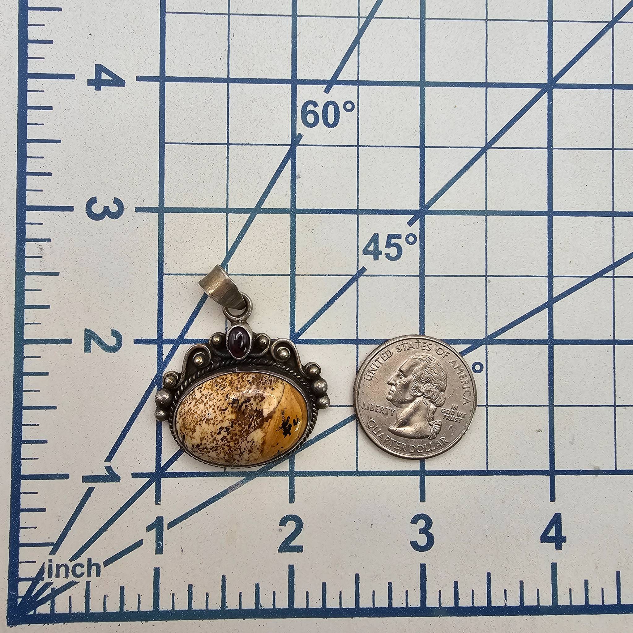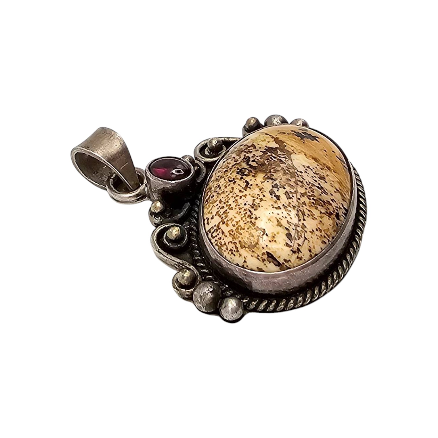 Sterling silver pendant featuring an oval jasper stone with a decorative garnet accent. The pendant is signed, includes ornate silver detailing, and weighs 12.2 grams. Measures approximately 2 inches in height including the bail. In good condition with standard surface wear consistent with age and use.