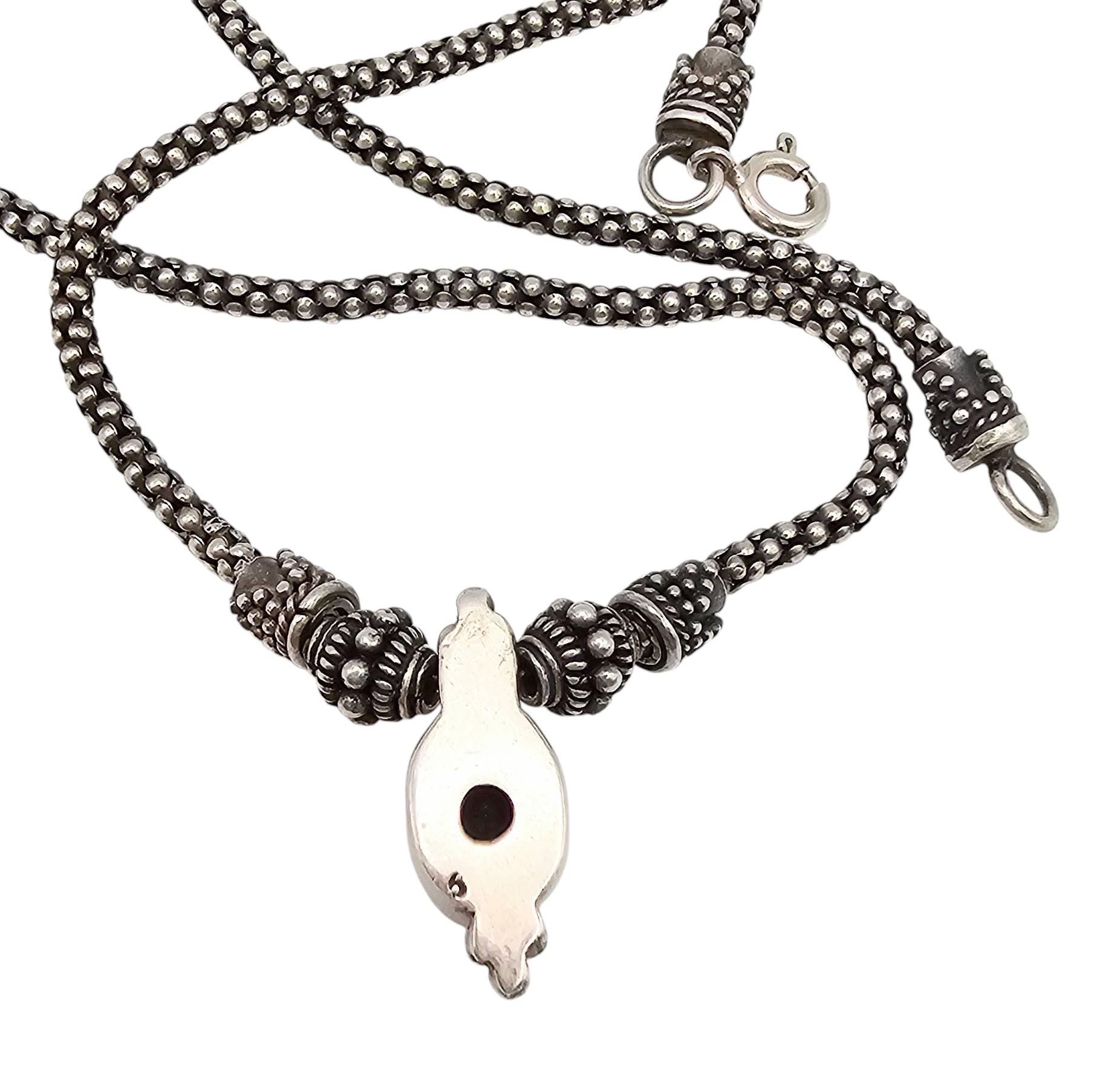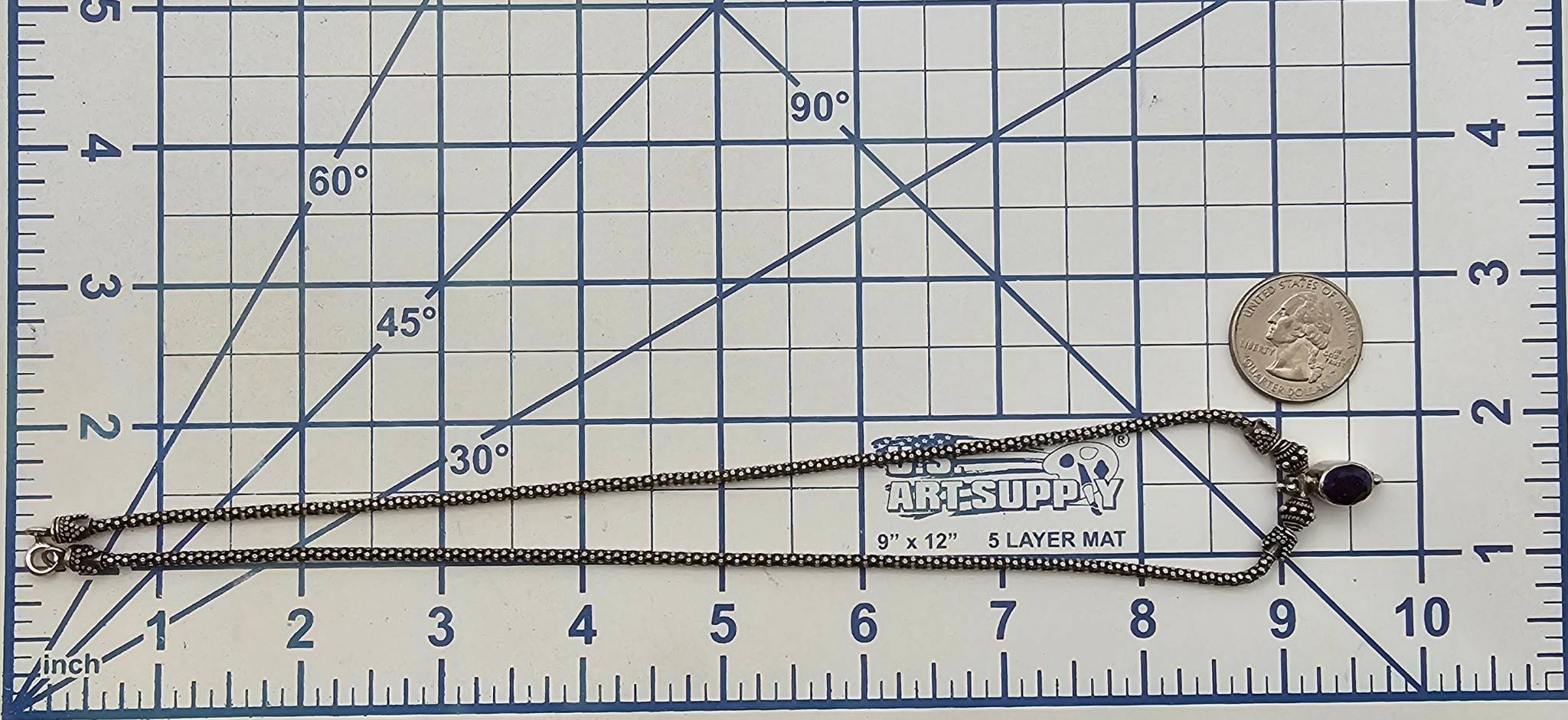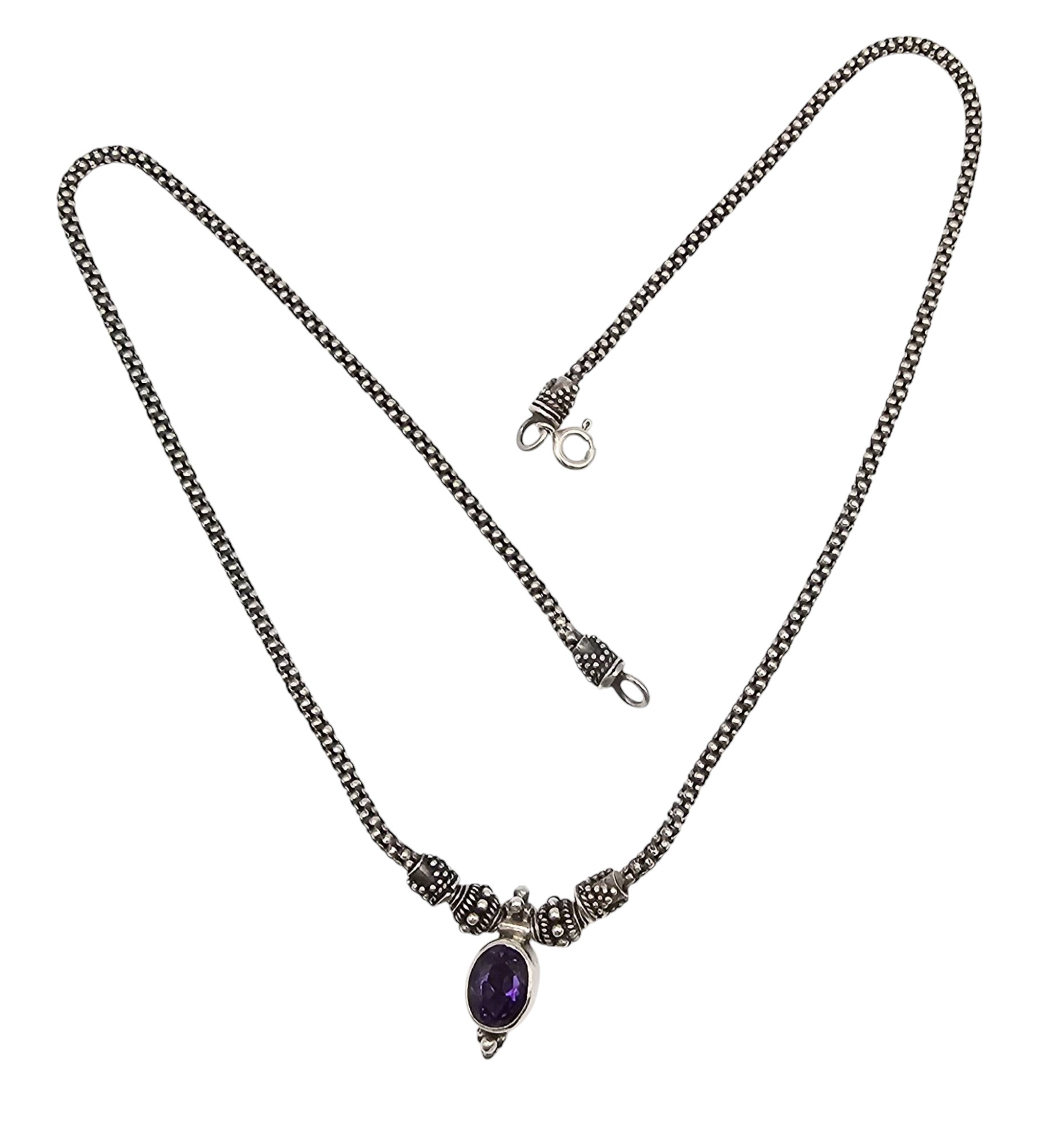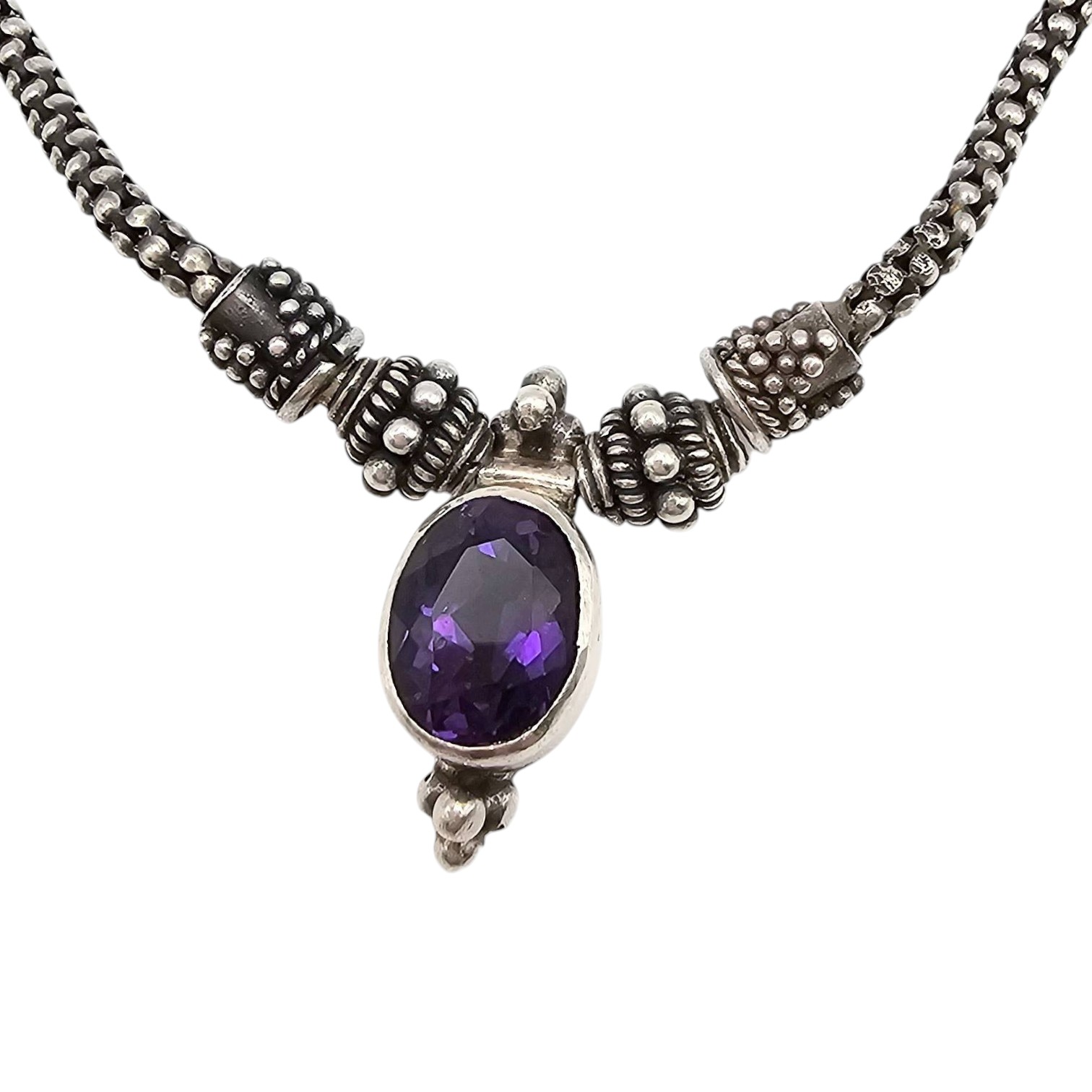 Sterling silver necklace featuring a central amethyst gemstone in an oval cut. The necklace weighs 11.7 grams and includes intricate bead details surrounding the amethyst center. The clasp is a secure hook style. Overall design showcases craftsmanship with a focus on the amethyst centerpiece.