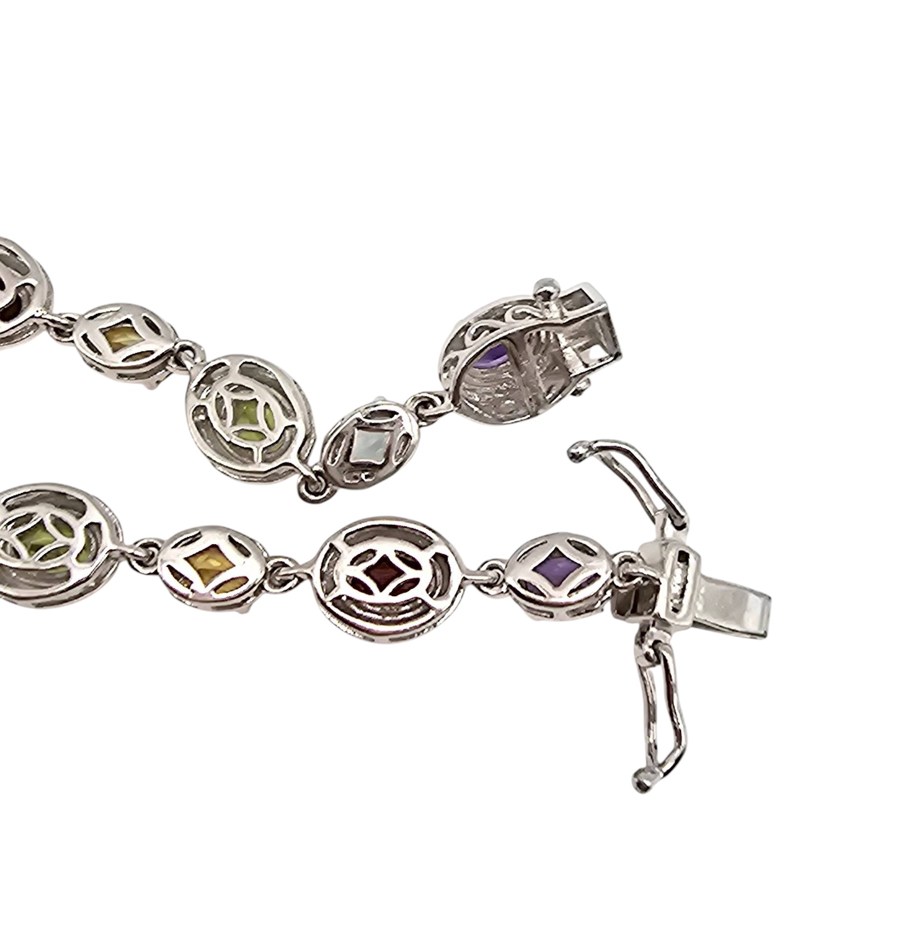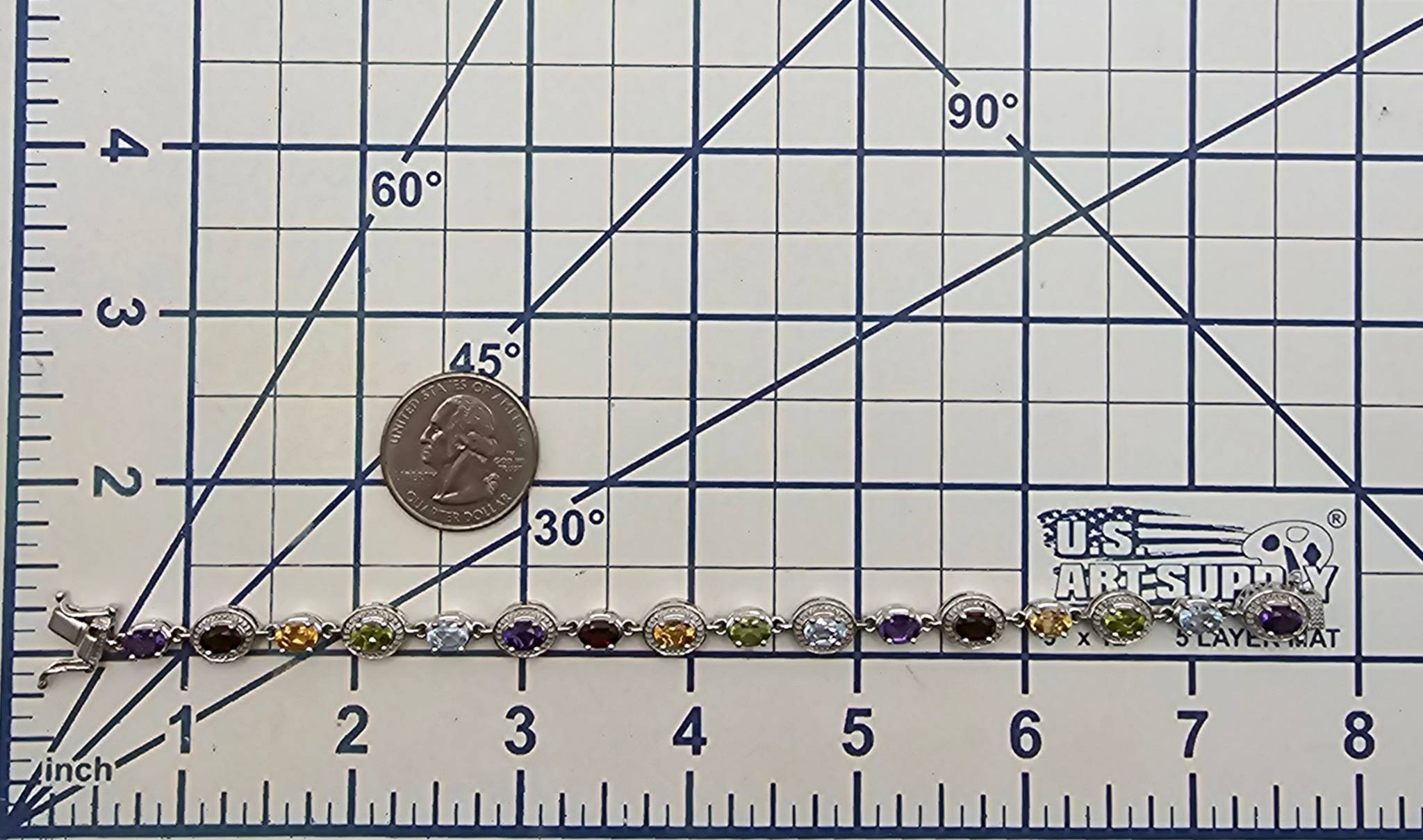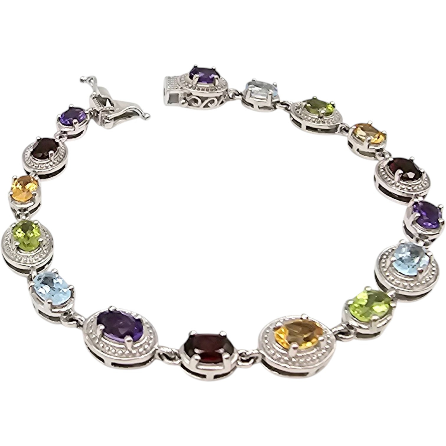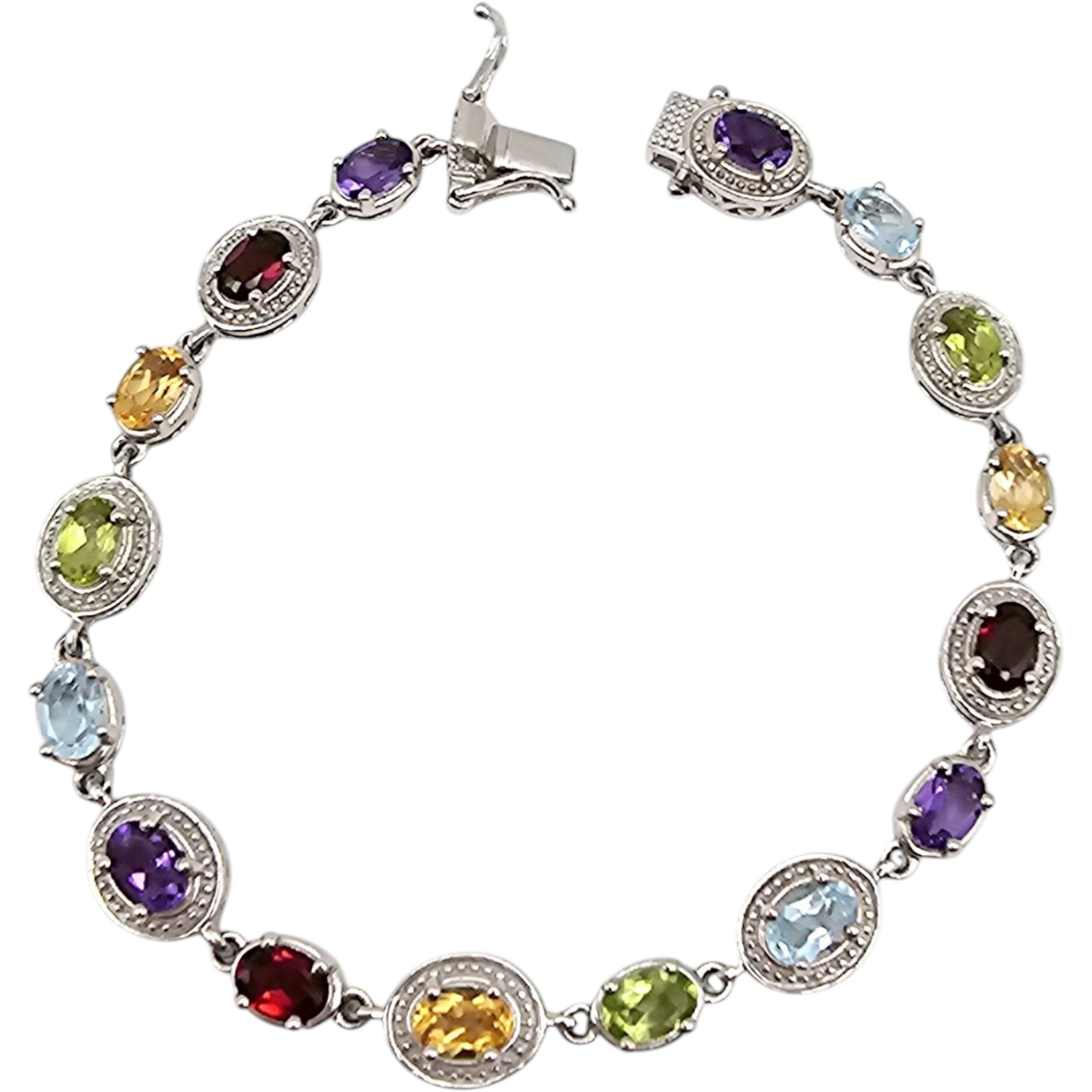 A tennis bracelet crafted from STS sterling silver, featuring a variety of multi-colored gemstones. The bracelet weighs 12.3 grams. The design showcases oval-shaped gemstones, securely set in sterling silver, with a secure clasp closure. Measures approximately 7.5 inches in length. The gemstones include amethyst, garnet, peridot, citrine, and blue topaz.