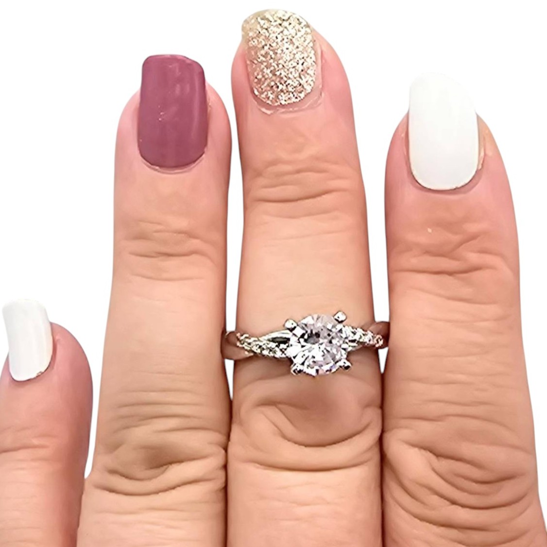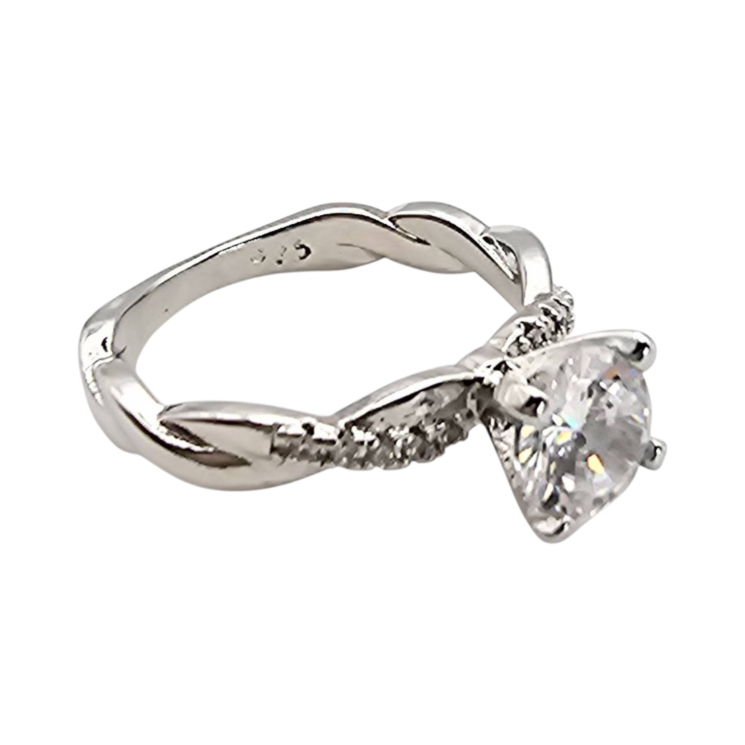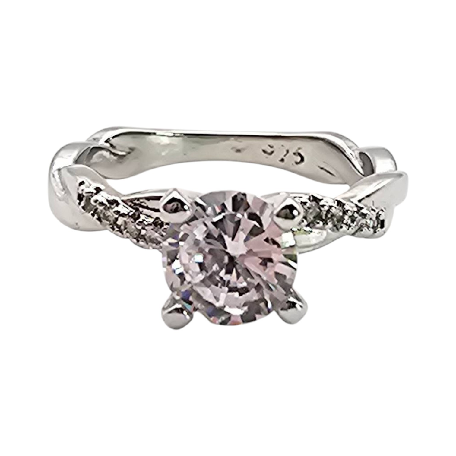 Sterling silver engagement-style ring featuring a round cubic zirconia (CZ) center stone and smaller CZ accents along a twist-style band. Marked ‘925’ indicating sterling silver composition. Size is 7.5, with a weight of 3.3 grams. Elegant design suitable for various occasions.