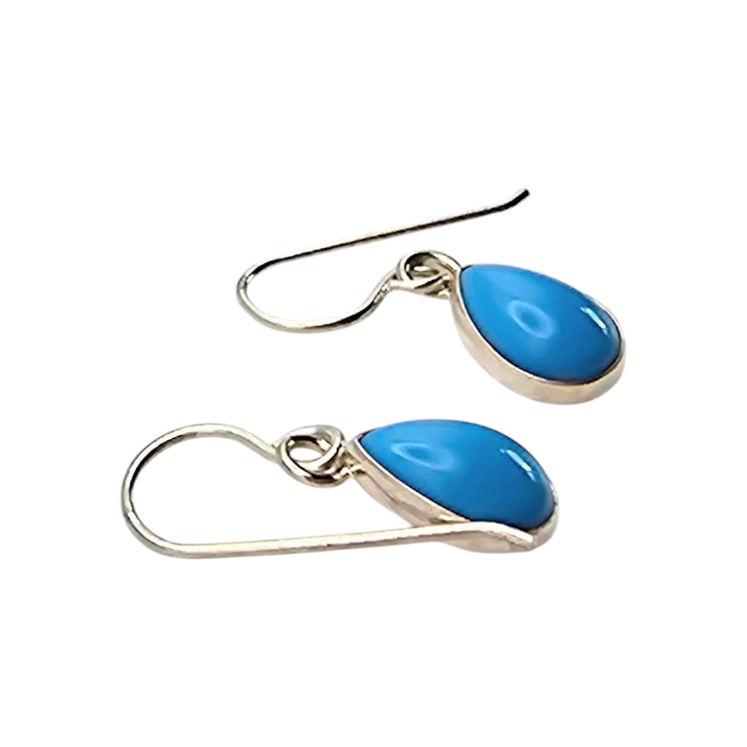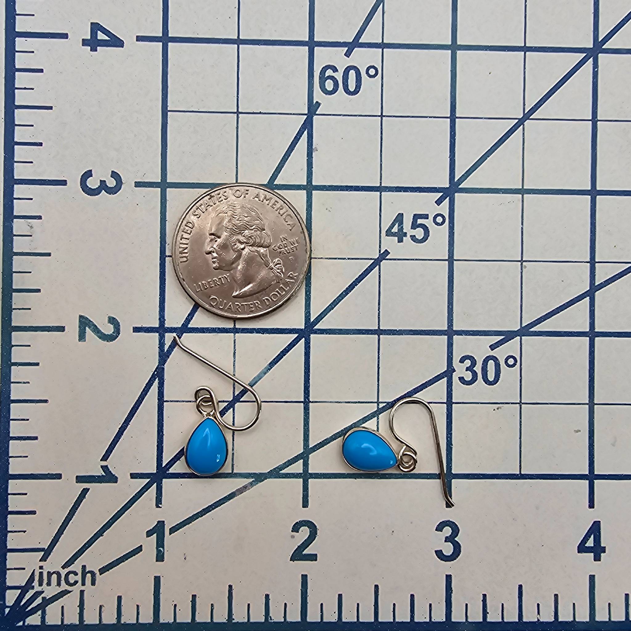Sterling silver drop earrings featuring teardrop-shaped turquoise stones. Marked 925 on the reverse side, confirming their sterling silver composition. Weighing approximately 1.4 grams, these lightweight earrings have a classic hook design for pierced ears. Approximate dimensions of the turquoise stones can be seen in the scale image.