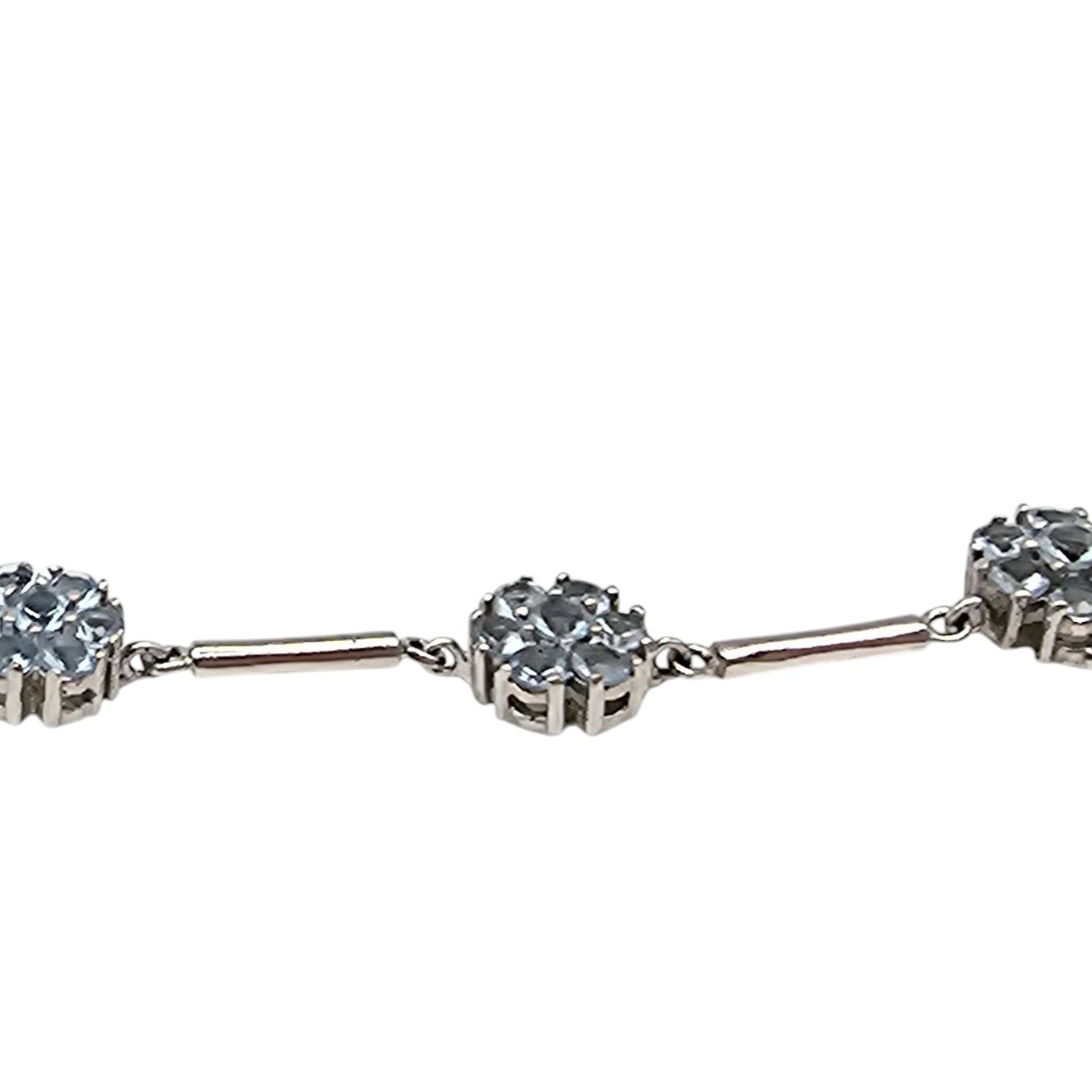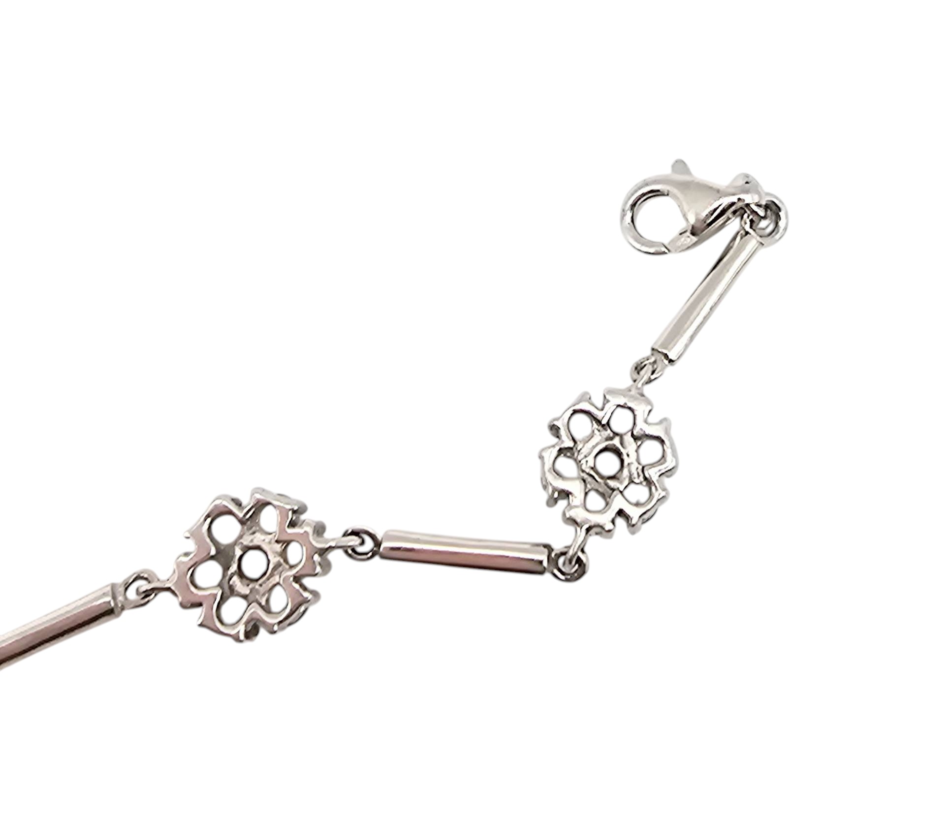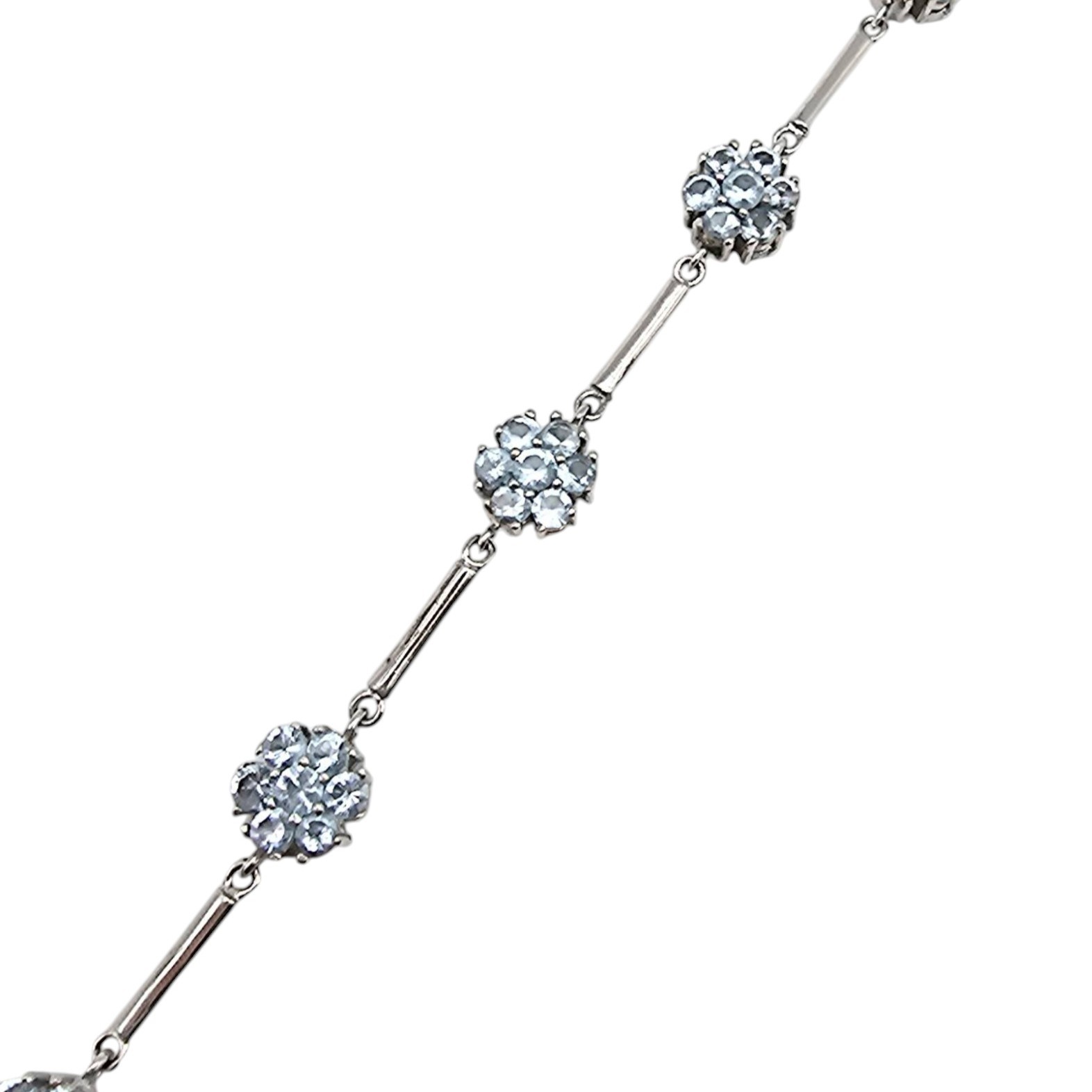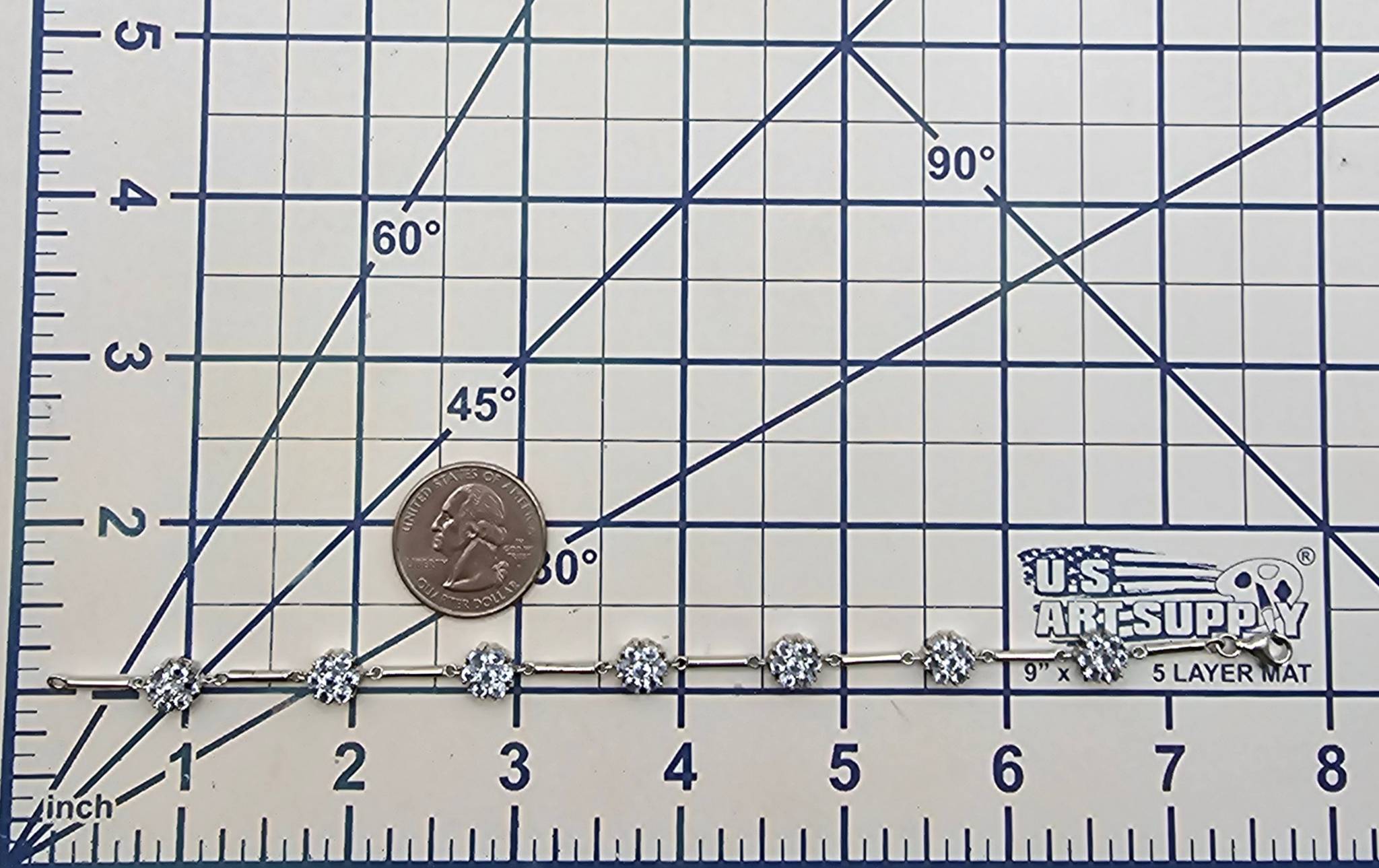 Sterling silver bracelet featuring rhinestone accents. The bracelet weighs 8 grams and includes a series of floral-inspired rhinestone settings connected by silver links. It is in good overall condition and has a lobster clasp closure. Measurements available on a standard ruler for reference.