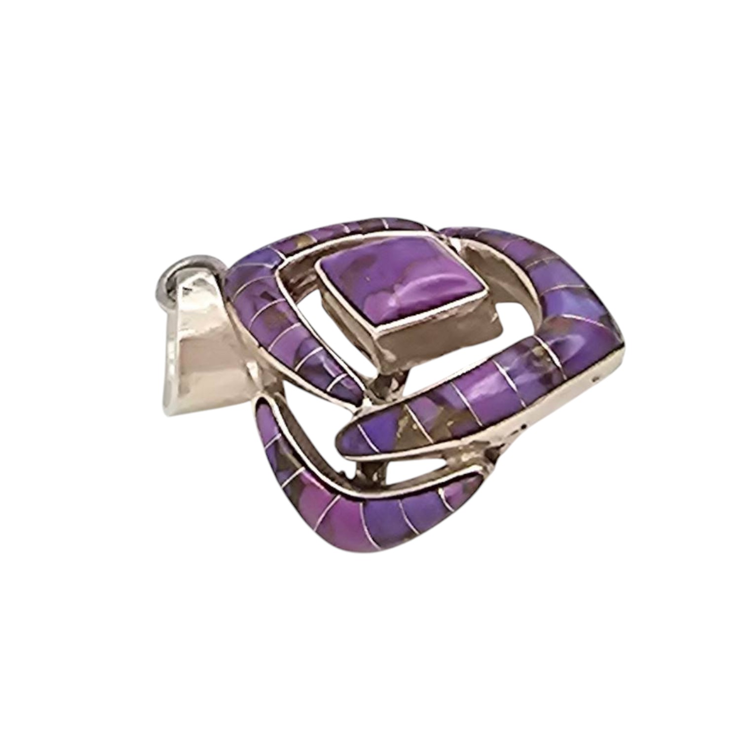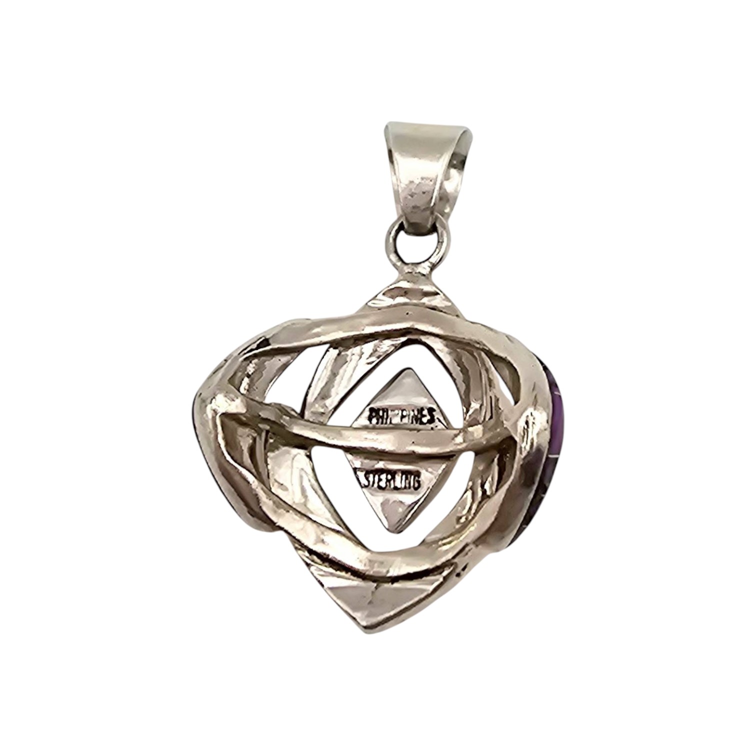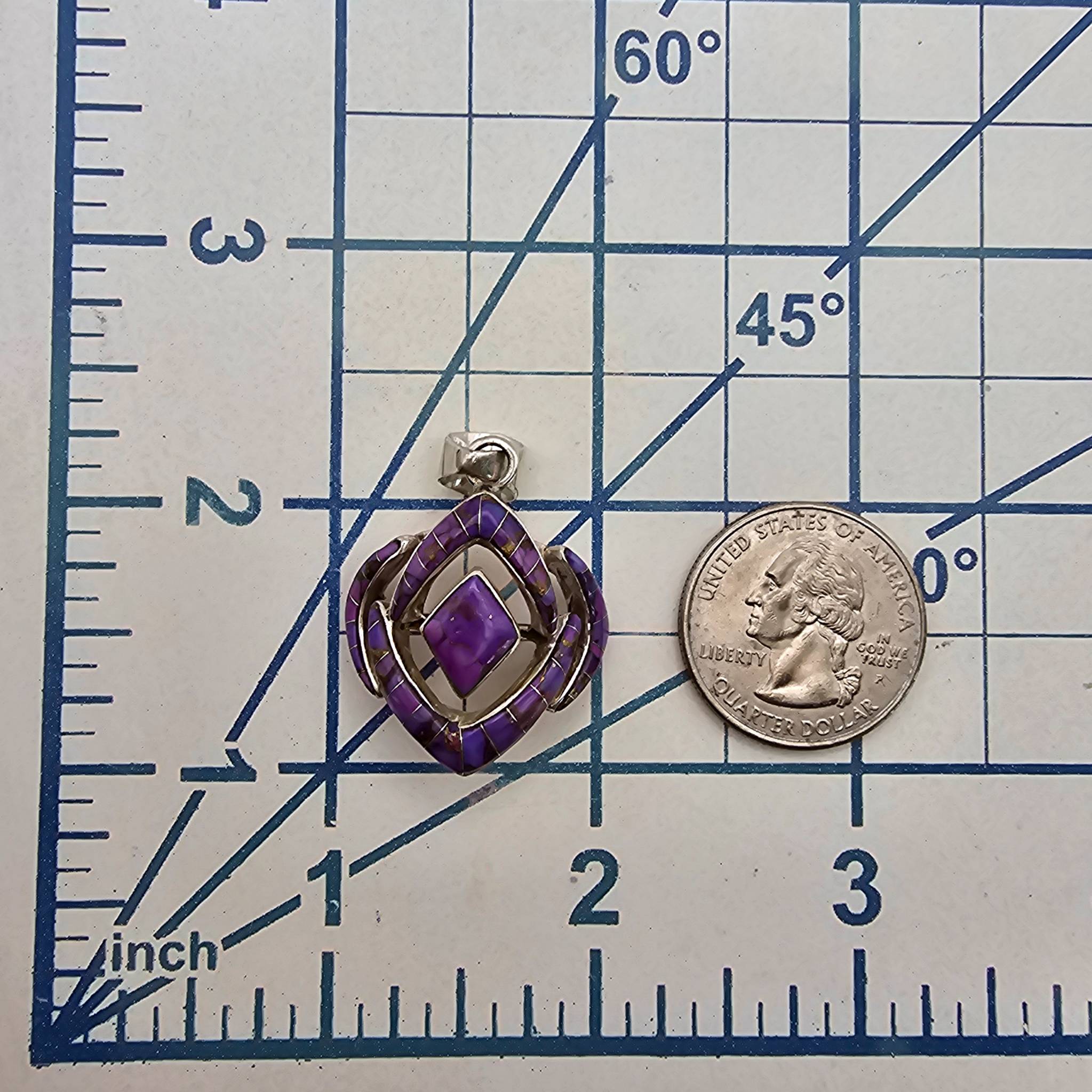 Charoite and sterling silver pendant weighing 5.9 grams. Features a vibrant purple charoite stone with a layered, geometric sterling silver design. The pendant measures approximately 1.5 inches in length, as shown against a scale with a U.S. quarter for size reference. In good condition with minor surface wear consistent with age.