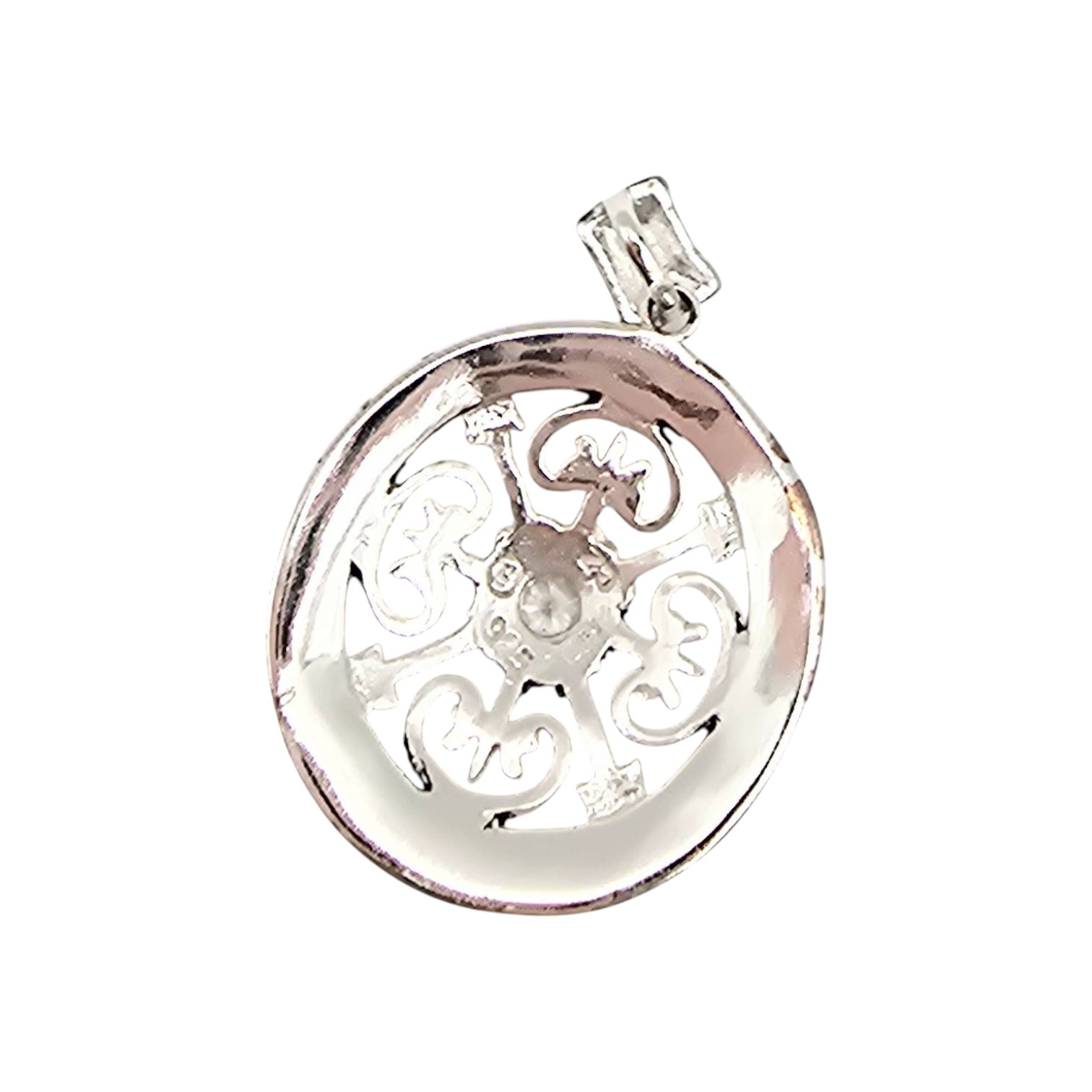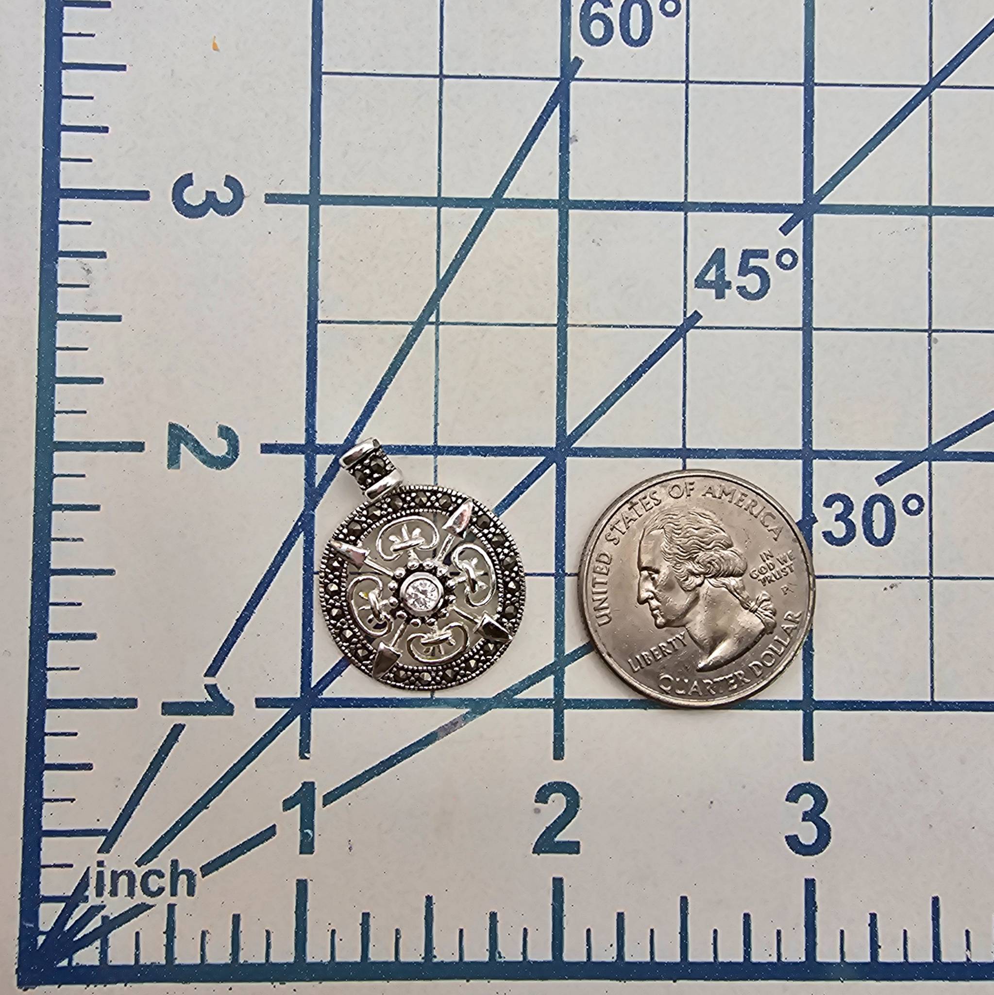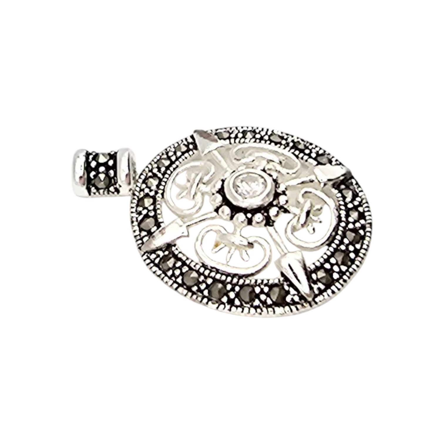Sterling silver pendant featuring a central cubic zirconia and intricate ornate details in an oval shape. The pendant includes a decorative bale that complements its design. Weighs approximately 3 grams. Suitable as an elegant addition to a necklace chain.