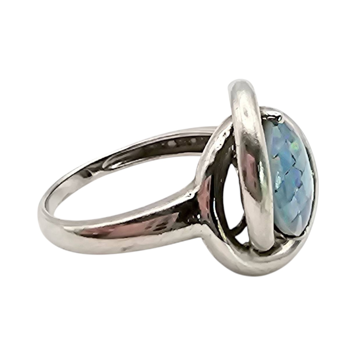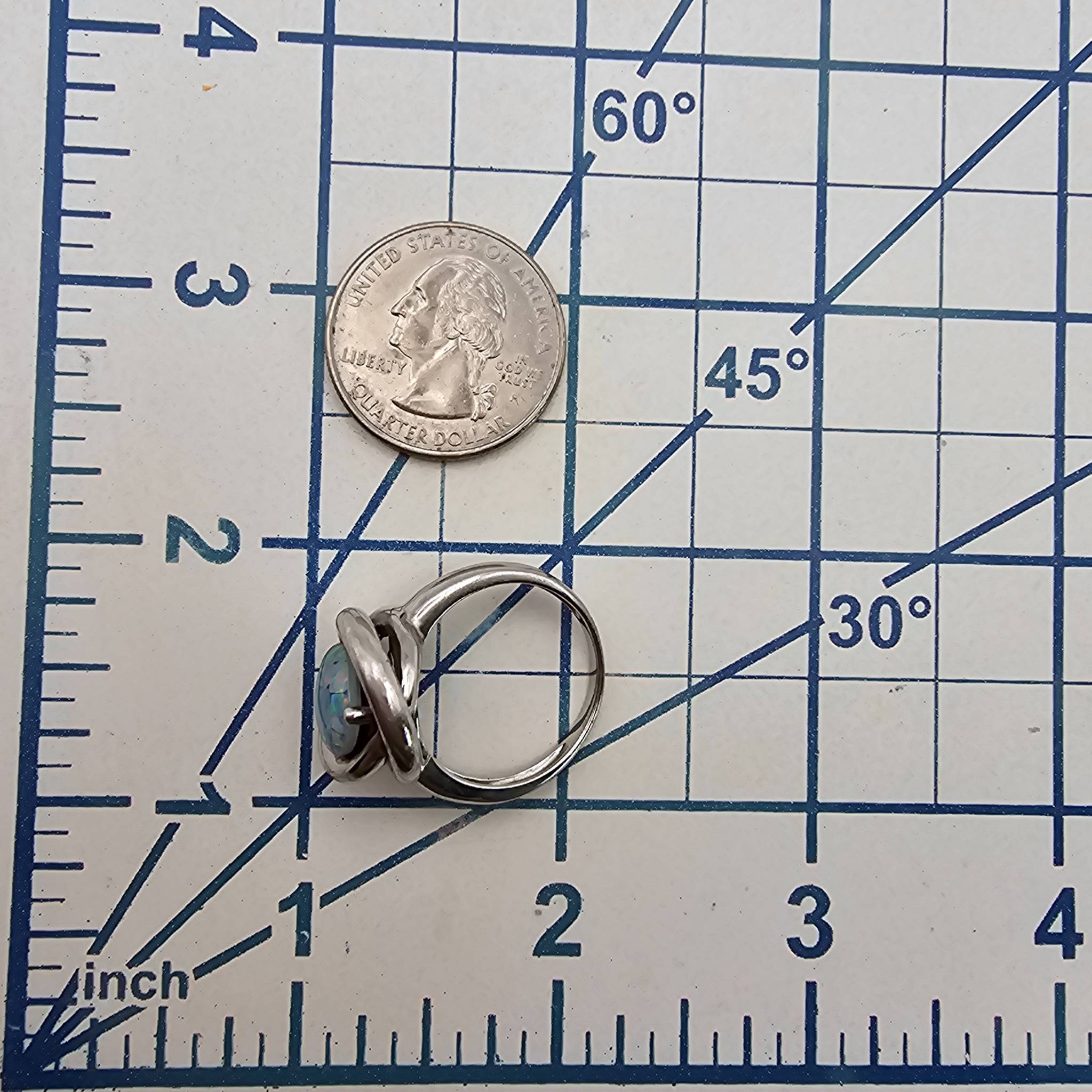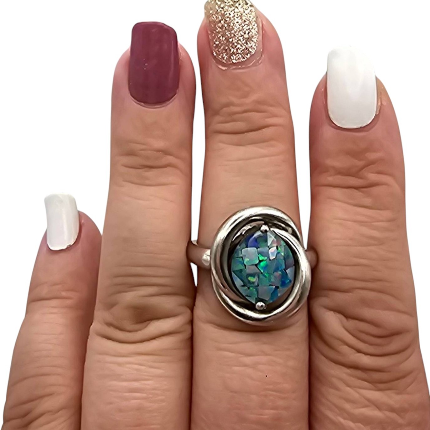 Sterling silver ring featuring a KN opal with a striking mosaic inlay, creating a vibrant play of colors. The ring is a size 8.75 and weighs approximately 6.8 grams. Designed with a smooth band and an encircling loop-style bezel to showcase the opal centerpiece.