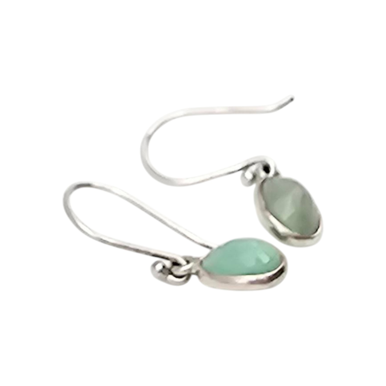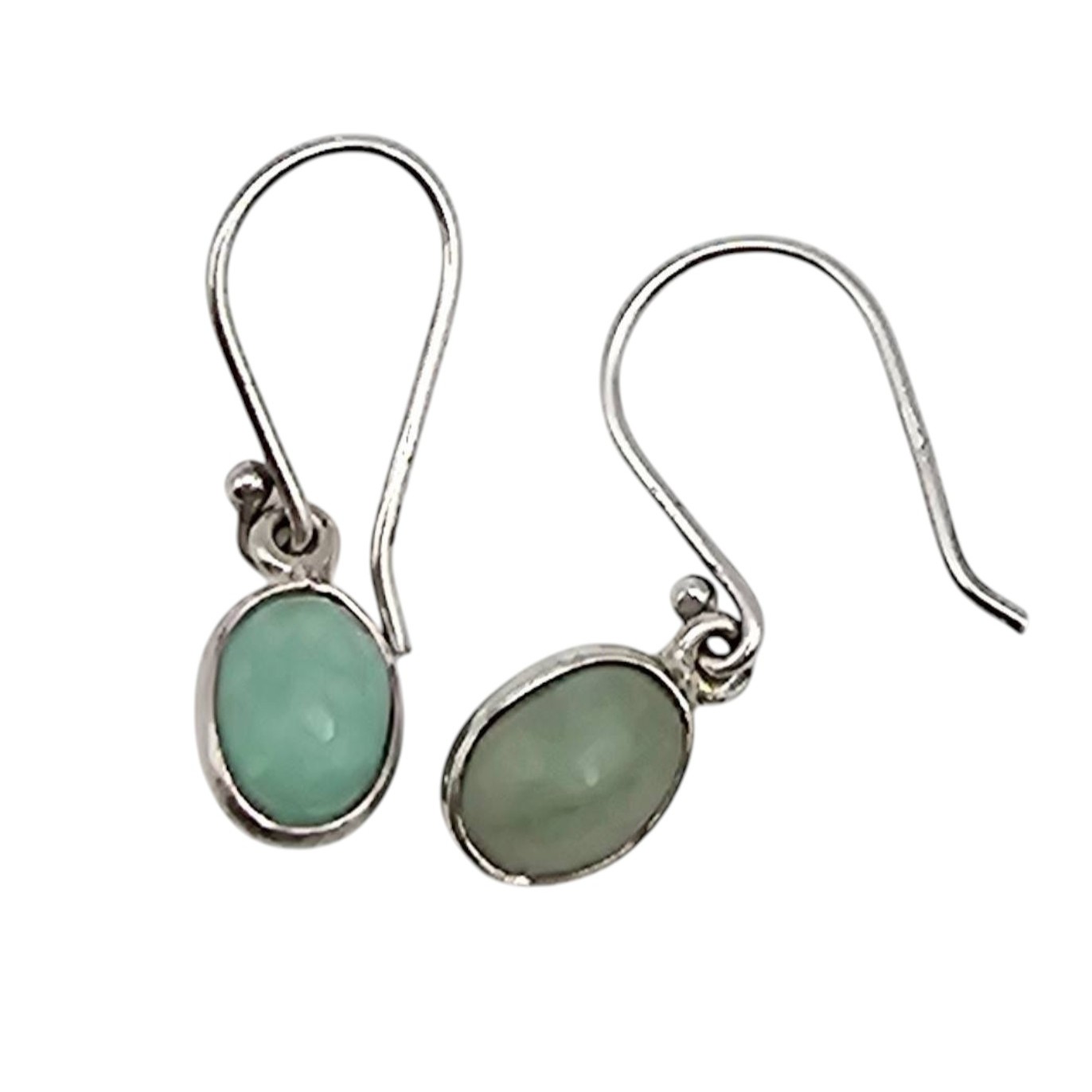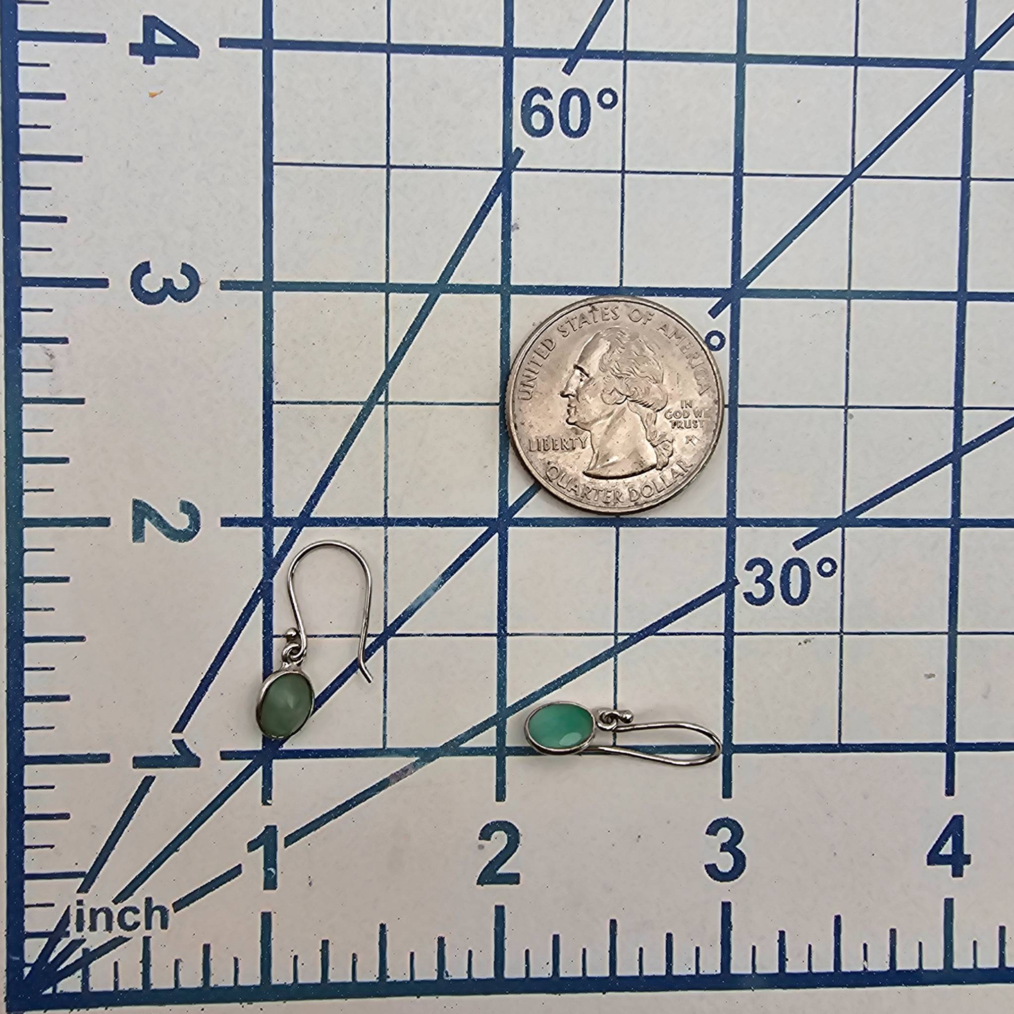 Earrings featuring oval jade stones set in sterling silver. The earrings are designed with hook-style backs for secure wear. These lightweight earrings weigh approximately 1 gram. They measure under 1 inch based on the scale reference in the image provided.