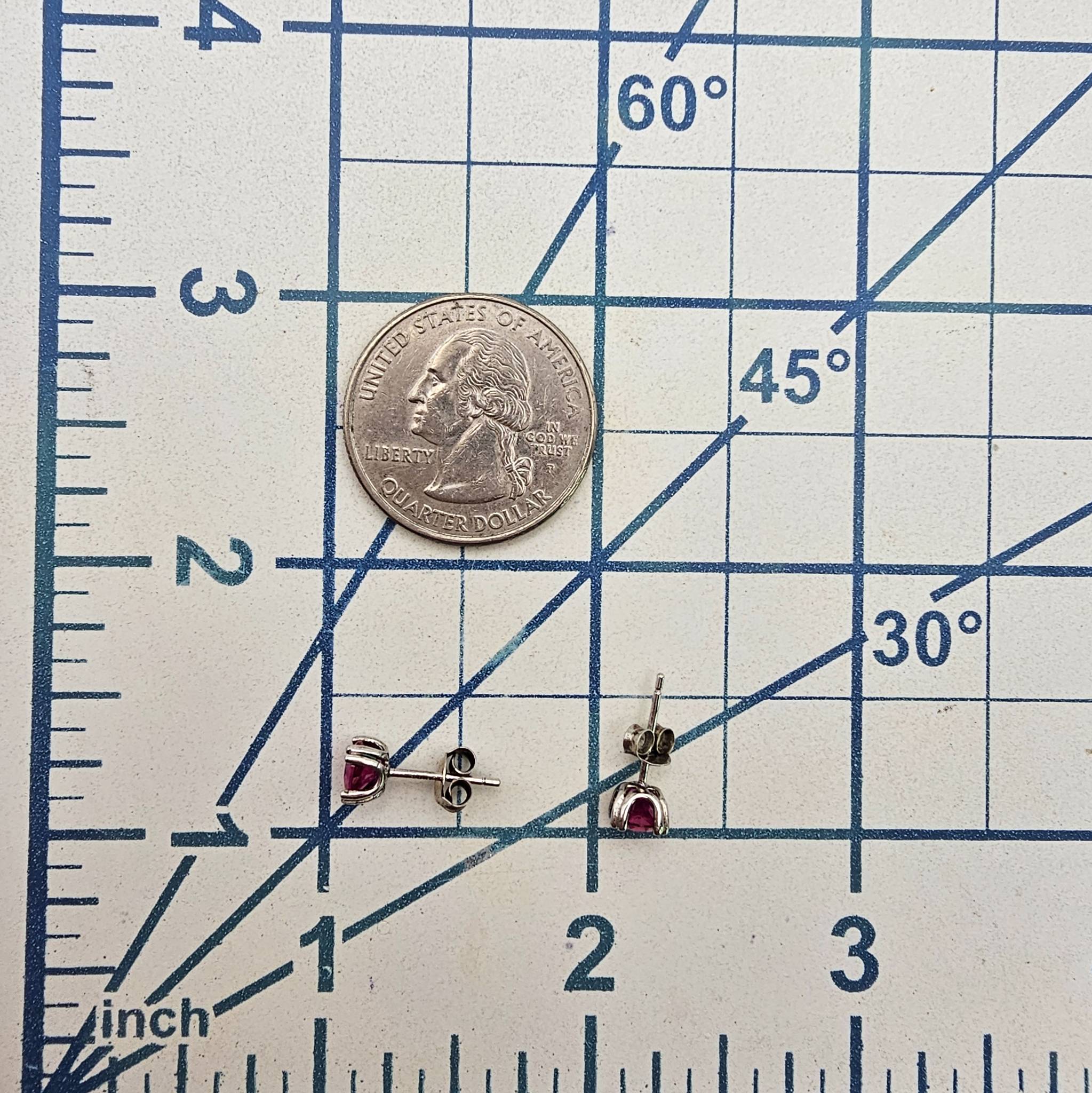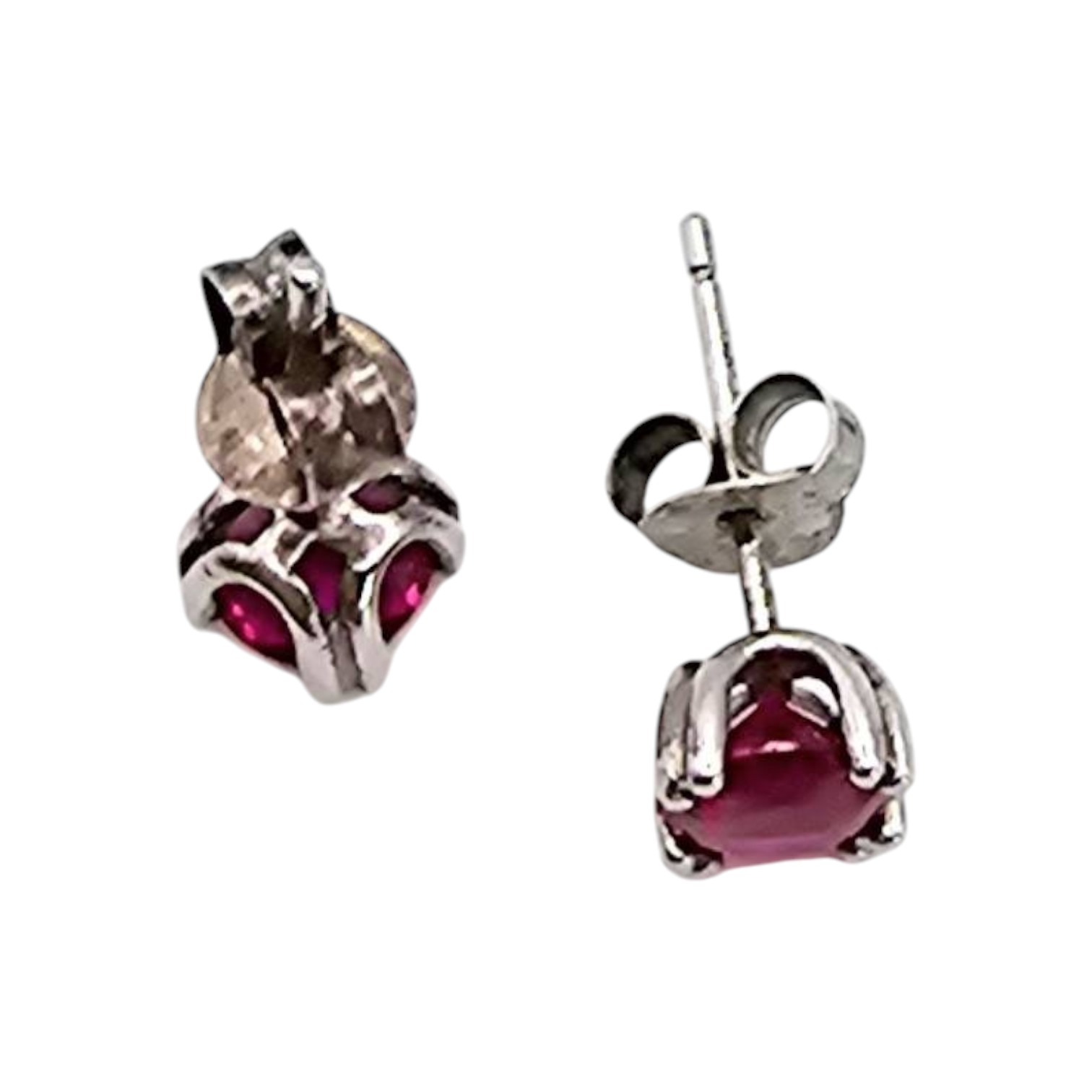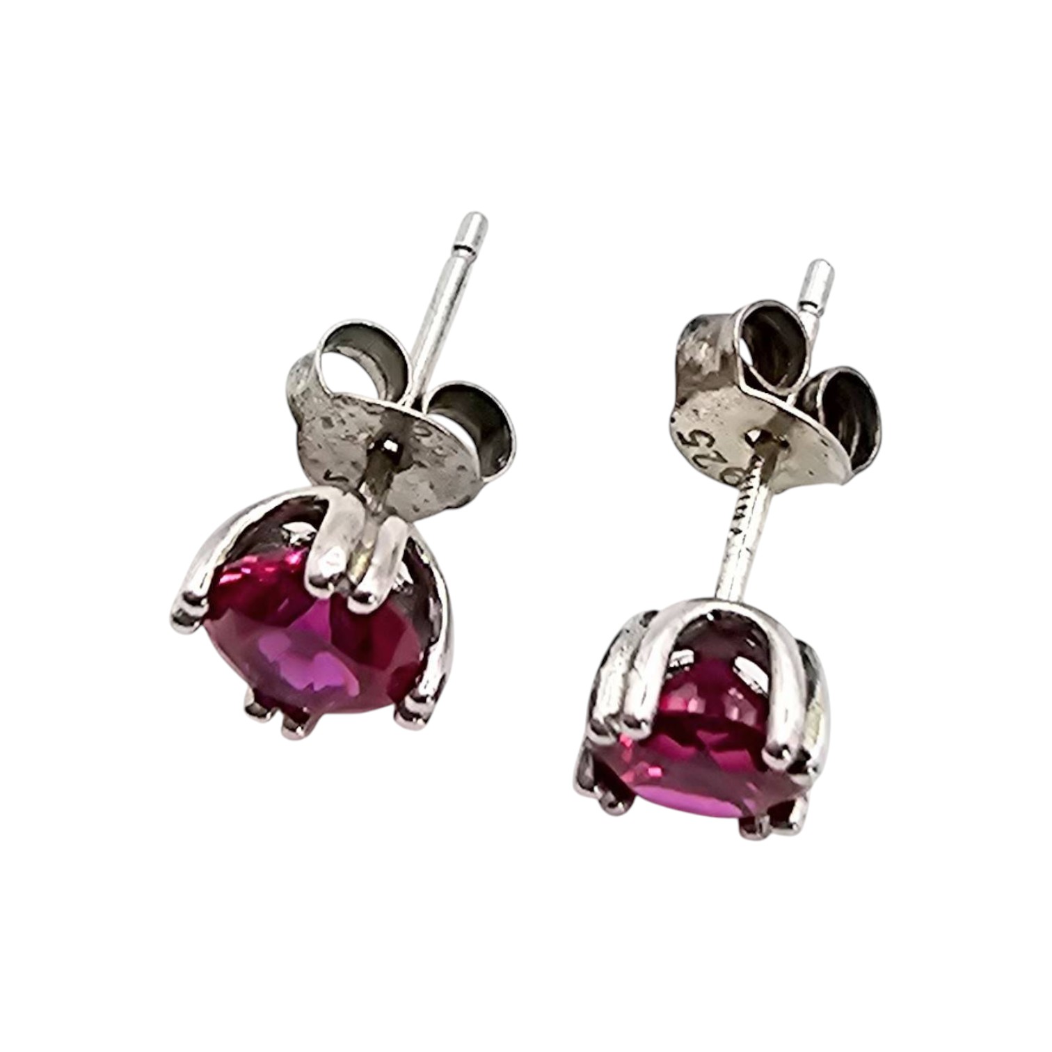 Sterling silver stud earrings featuring synthetic ruby gemstones set in a prong setting. Each earring is marked 925, verifying the sterling silver composition. The total weight of the pair is approximately 0.8 grams. The earrings are compact and lightweight, ideal for everyday wear.