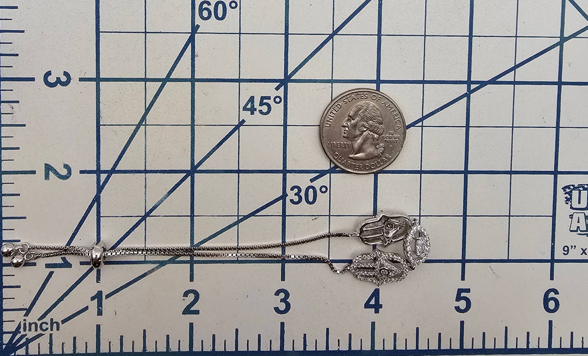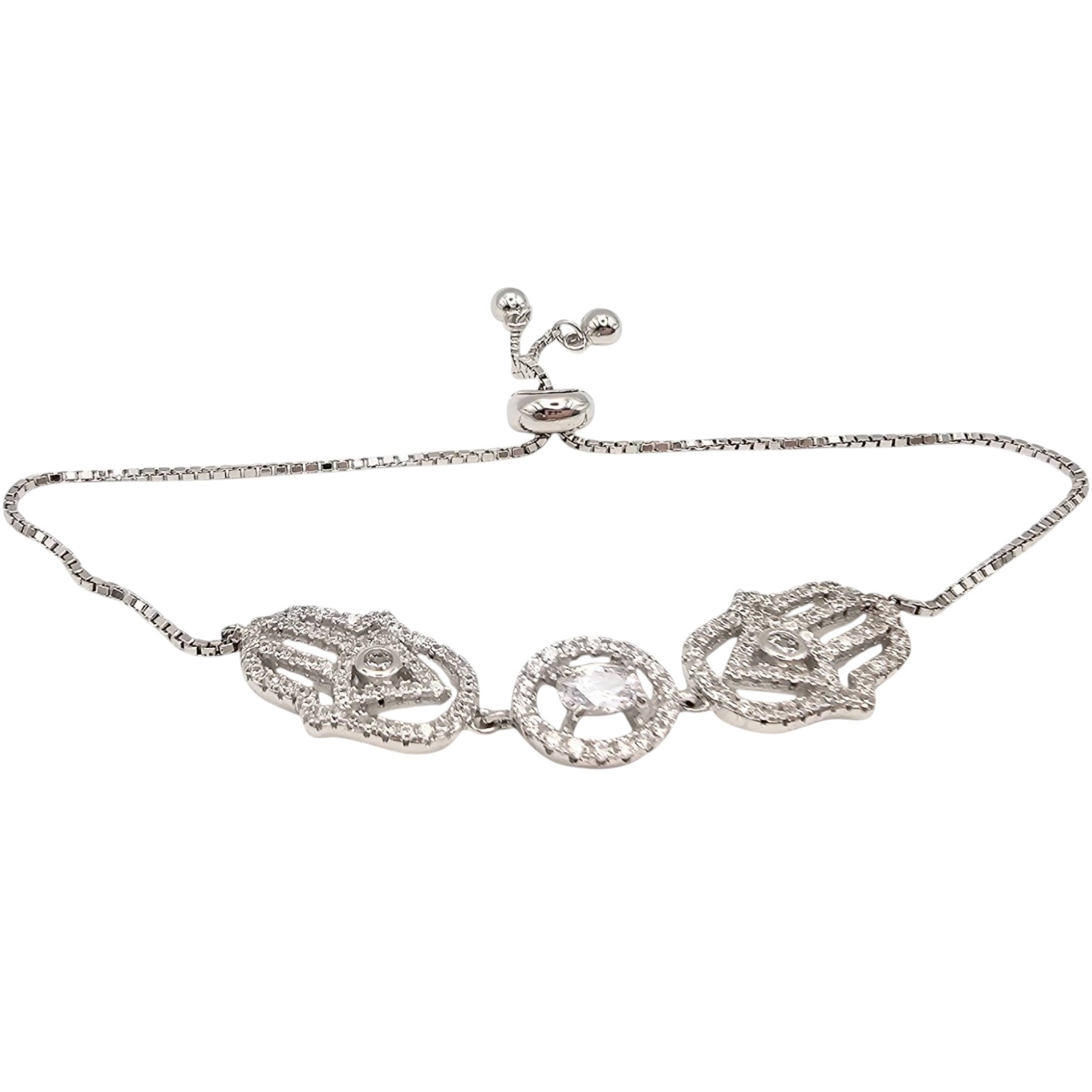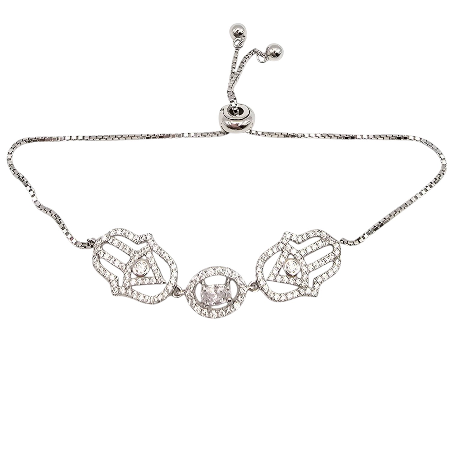FZN sterling silver evil eye bolo bracelet featuring sparkling cubic zirconia detailing. The bracelet is adjustable with a sliding bolo clasp, weighing approximately 5.6 grams. Crafted with intricate hamsa and evil eye motifs, it combines aesthetics with symbolic protection.