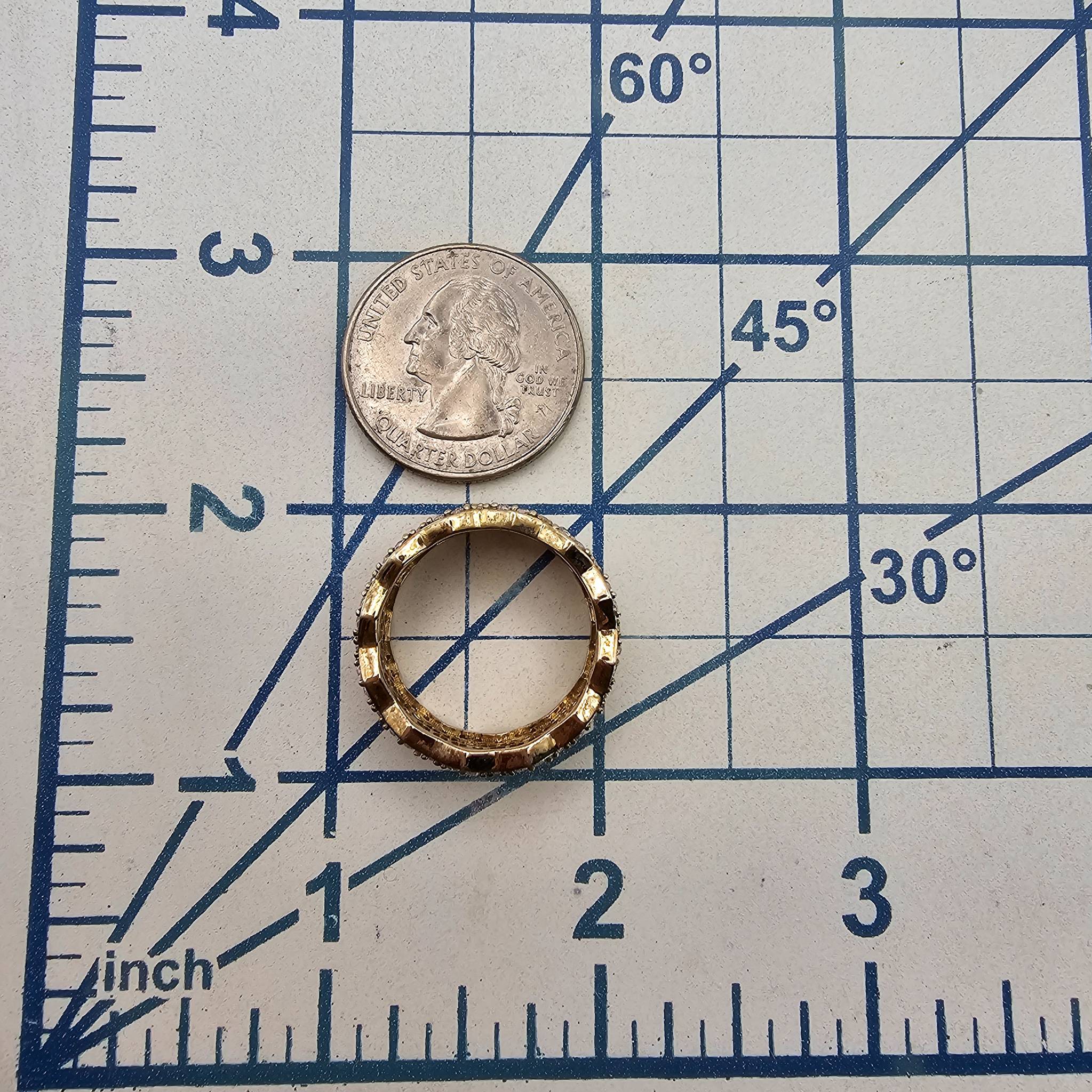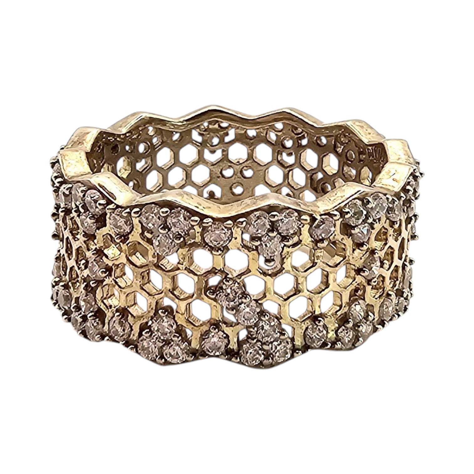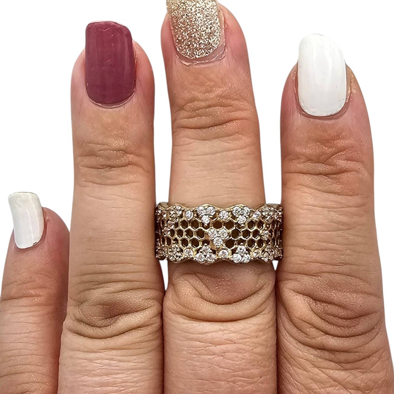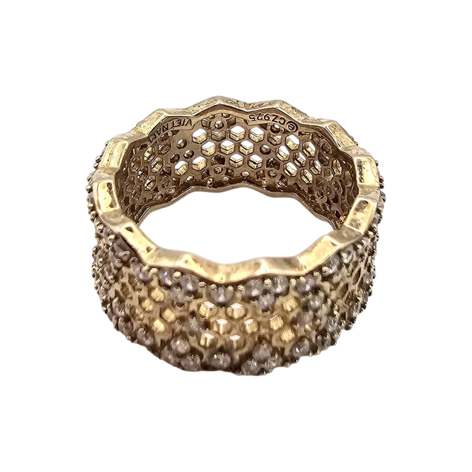 Gold over sterling silver ring featuring a honeycomb pattern adorned with cubic zirconia accents. The ring is a size 8.25 and weighs 6.1 grams. It is designed with intricate details, combining a mix of gold tone and sparkling CZ to create an elegant piece. Stamped with ‘925’, confirming its sterling silver base.