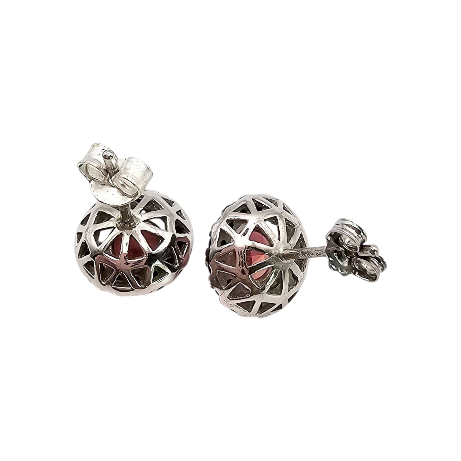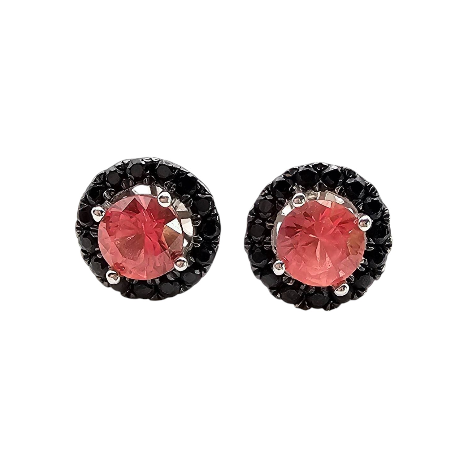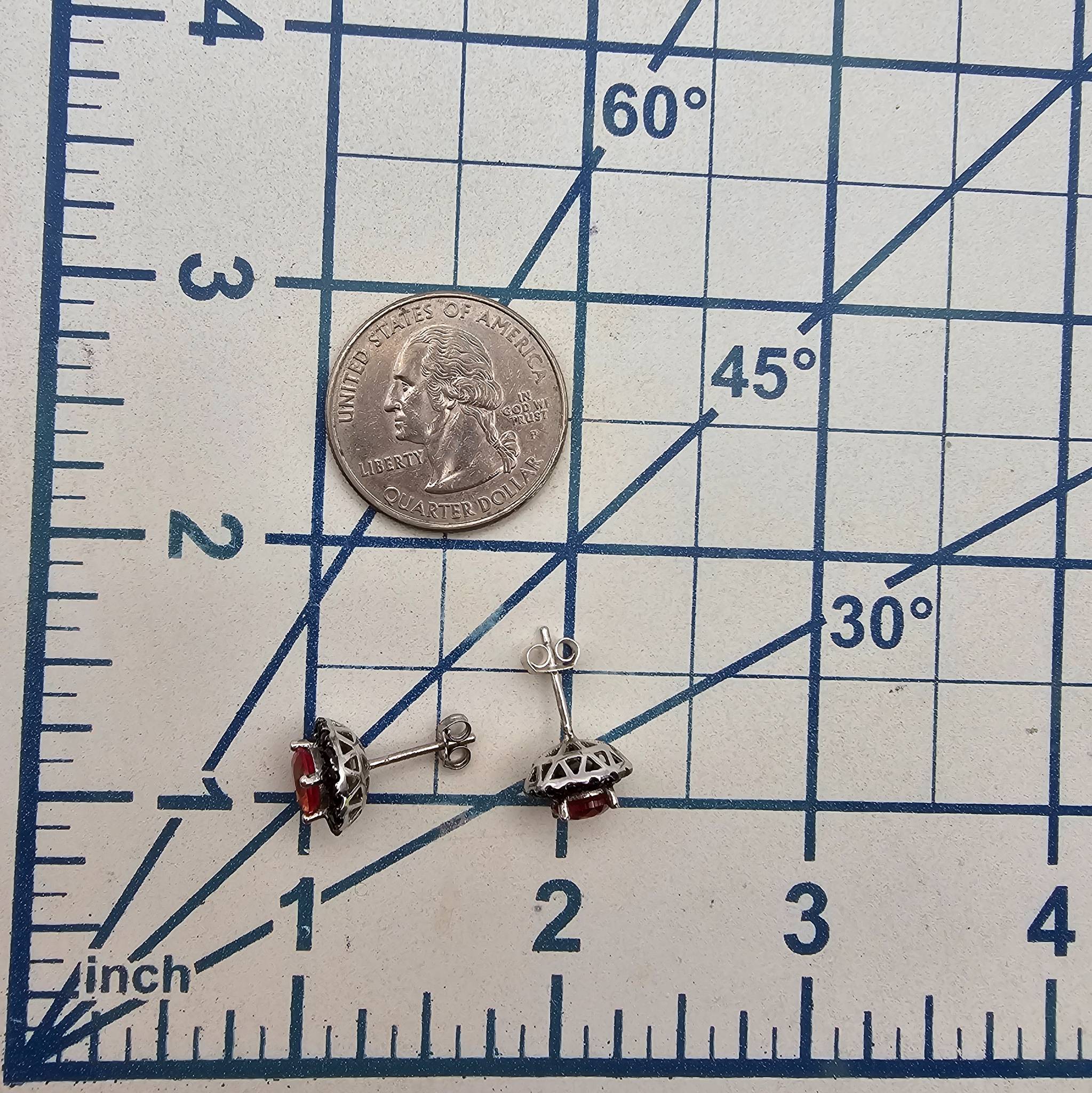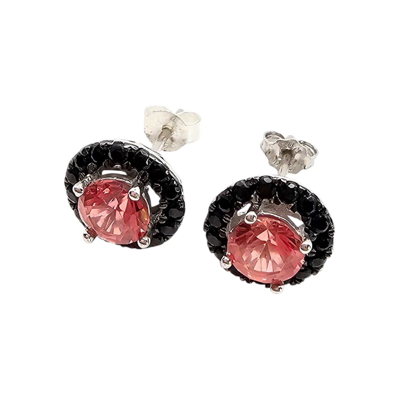 Sterling silver earrings featuring round-cut pink topaz stones surrounded by black accent stones. Marked 925 to indicate sterling silver composition. Weighs 2.8 grams. Includes butterfly clasp closures. Small size as shown next to a quarter for scale.