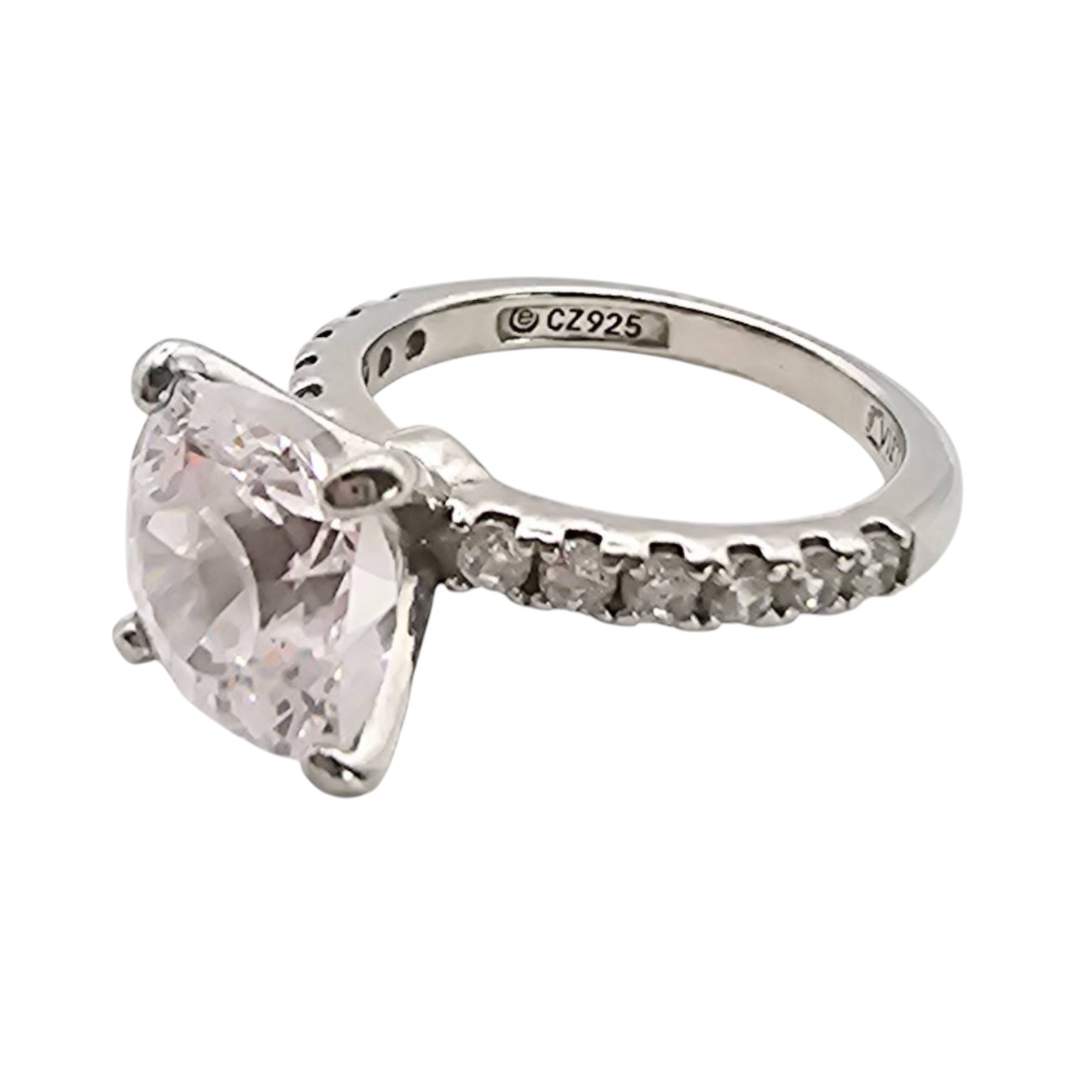 Sterling silver ring featuring a cubic zirconia solitaire in a prong setting, flanked by smaller cubic zirconia accents on the band. Marked with ‘CZ 925’ and ‘Vietnam’ on the inner band. Size approximately 7.5, weight 3.9 grams. Total recorded price weight listed as 4.75. Elegant and well-crafted with a polished finish.