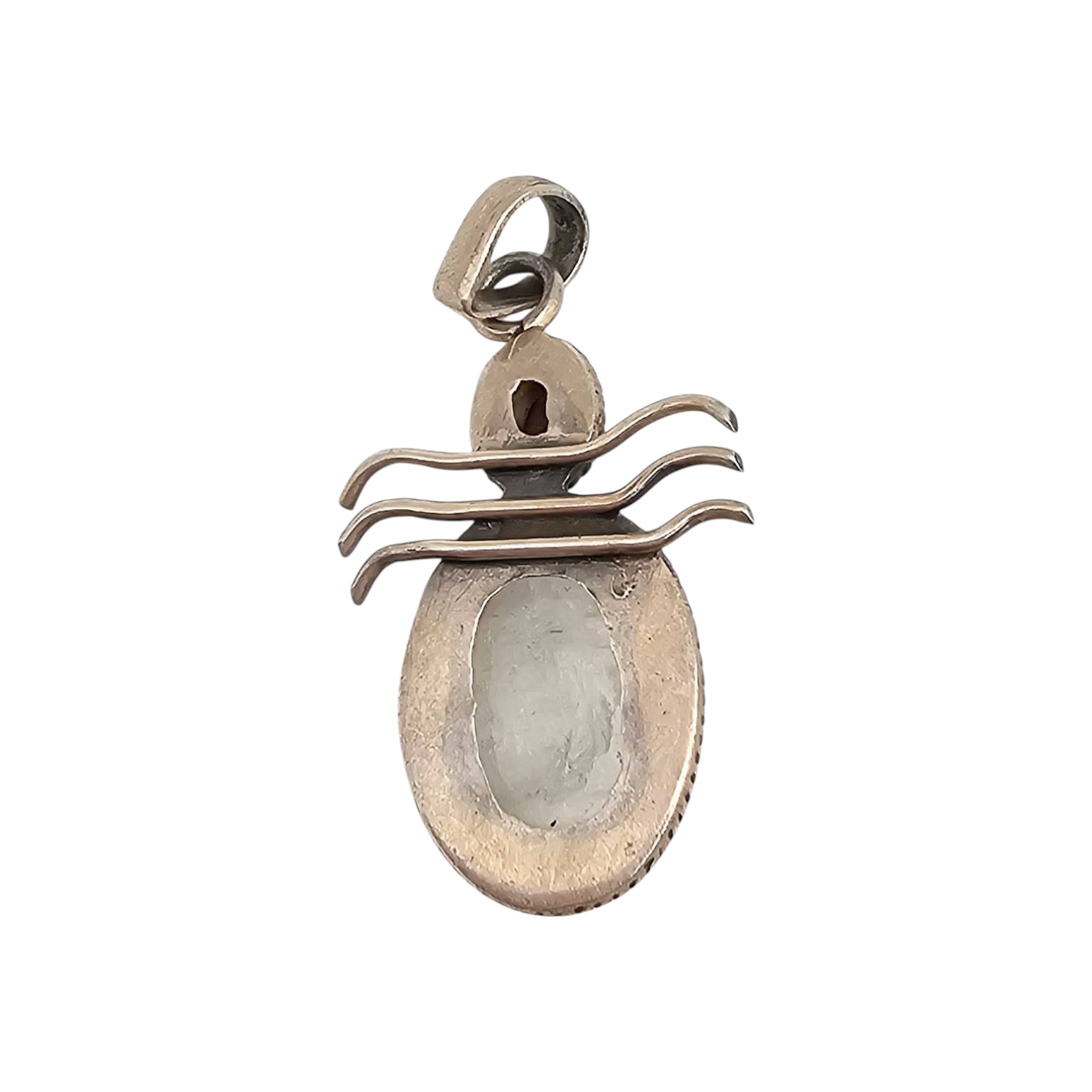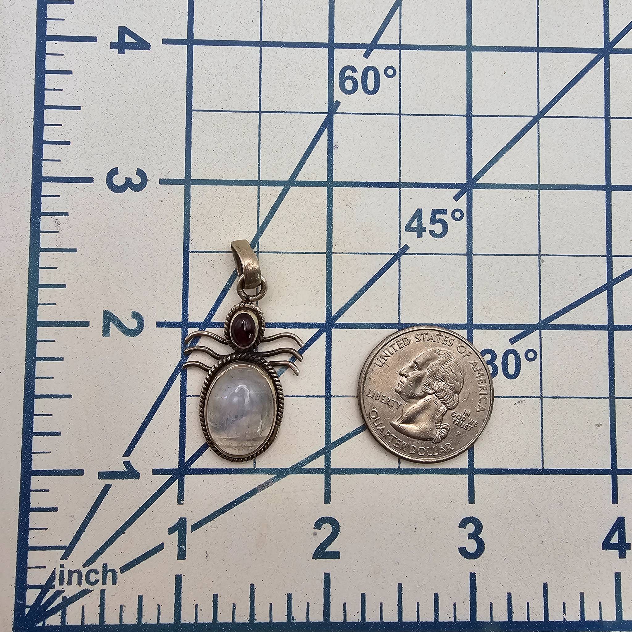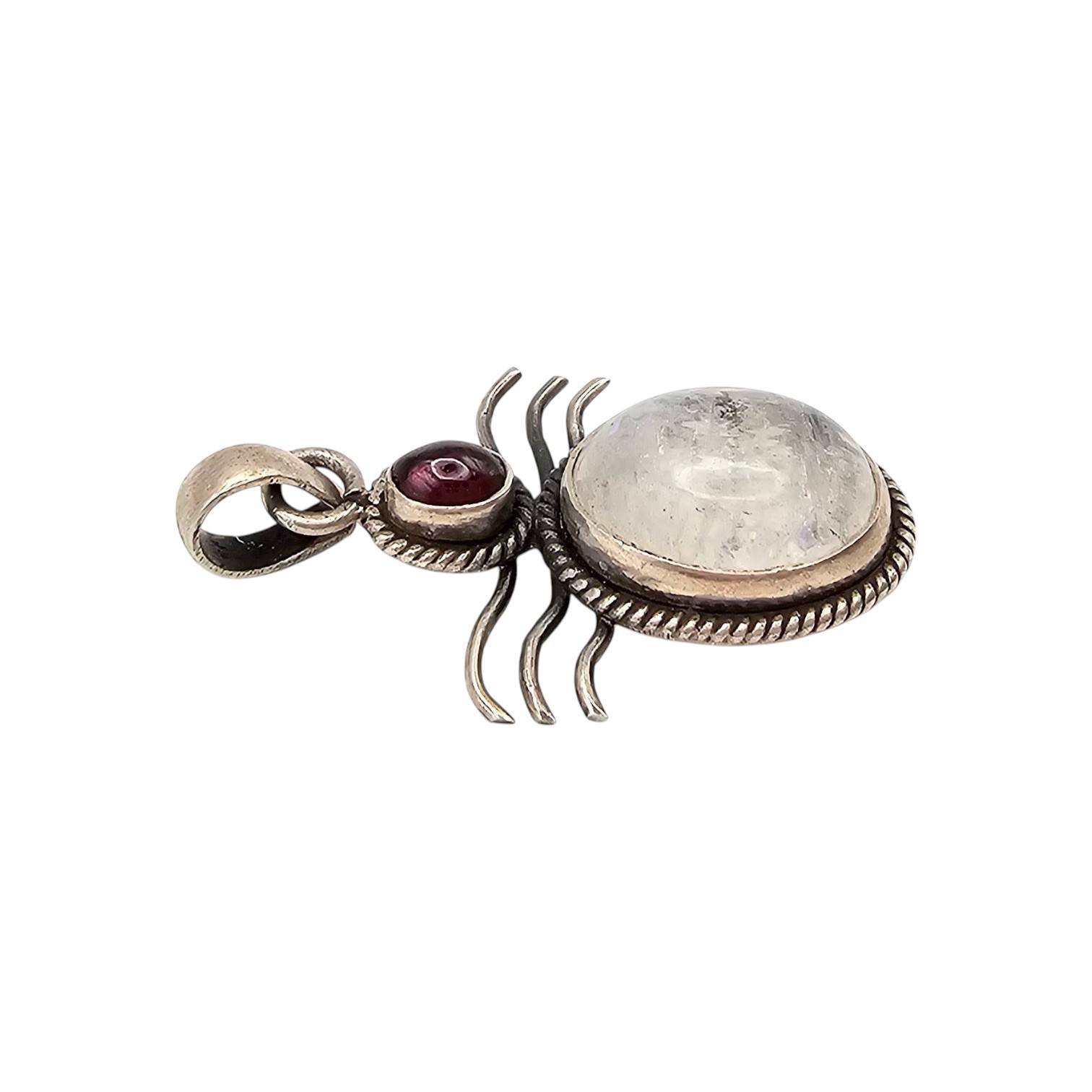 Moonstone and garnet bug-shaped pendant crafted in sterling silver. Features a cabochon moonstone as the body and a garnet stone as the head. Weighs approximately 5.1 grams. Intricate detailing with silver wire forming legs and a textured frame. Suspension loop is soldered for durability.