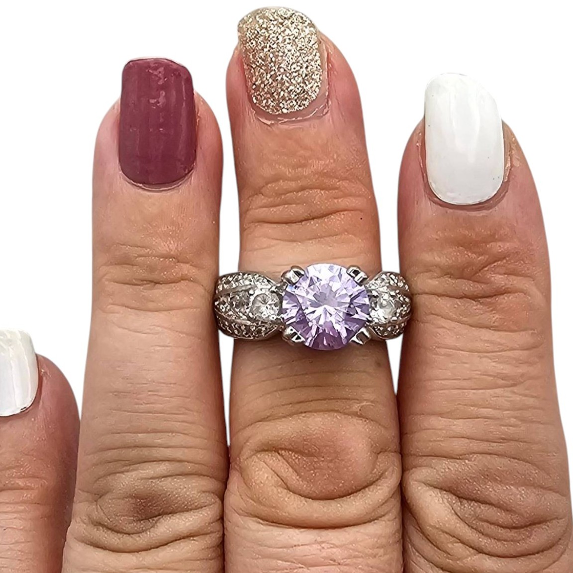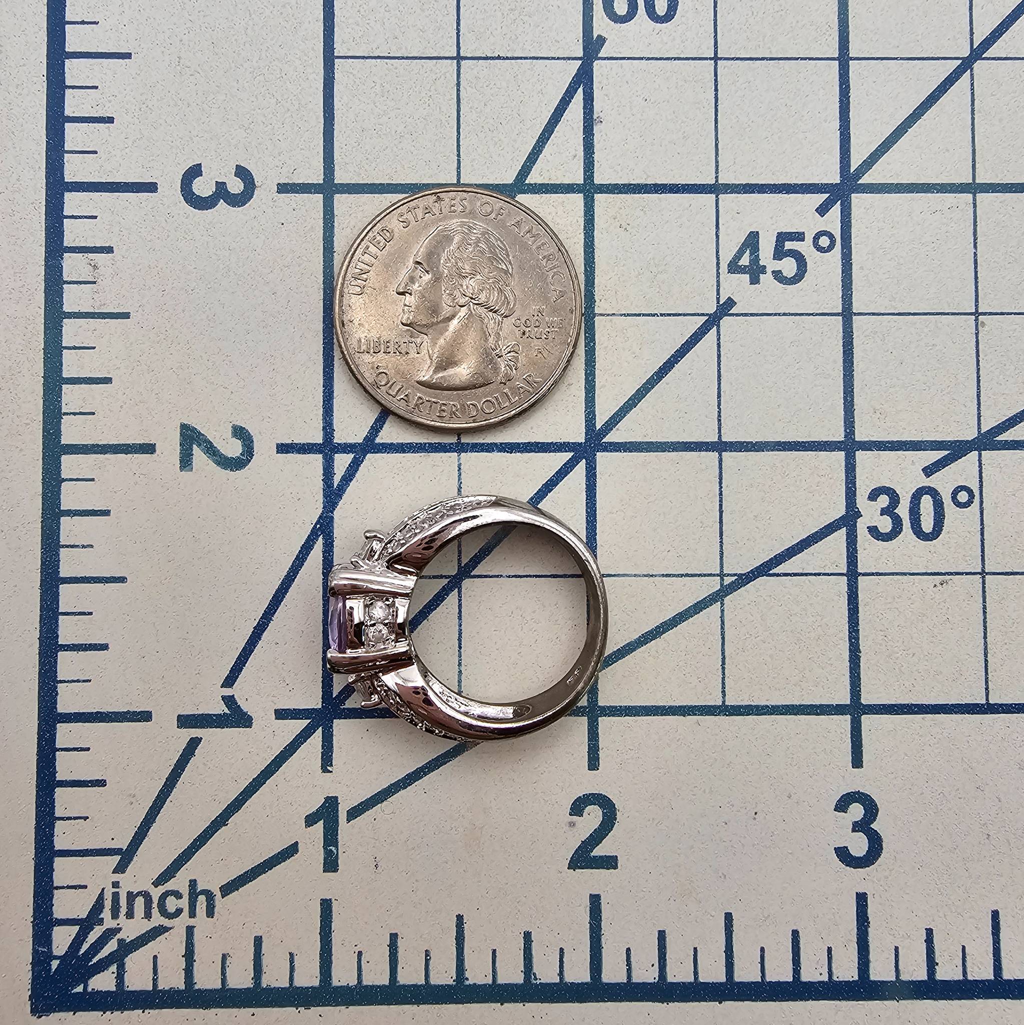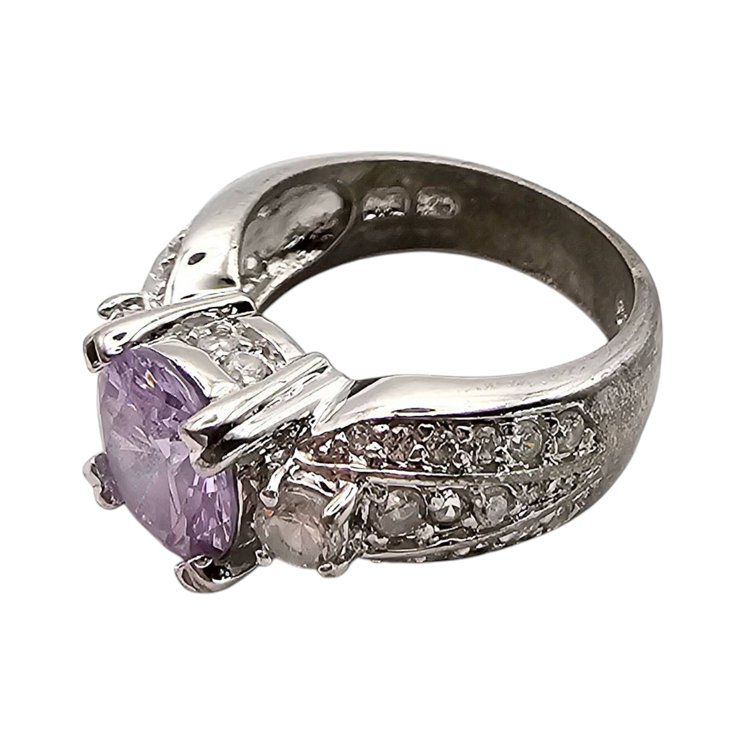 Sterling silver ring and adorned with a central purple cubic zirconia stone, surrounded by clear cubic zirconia accents. The ring is signed, weighs 7.9 grams, and is a size 6.5. Features intricate detailing along the band.