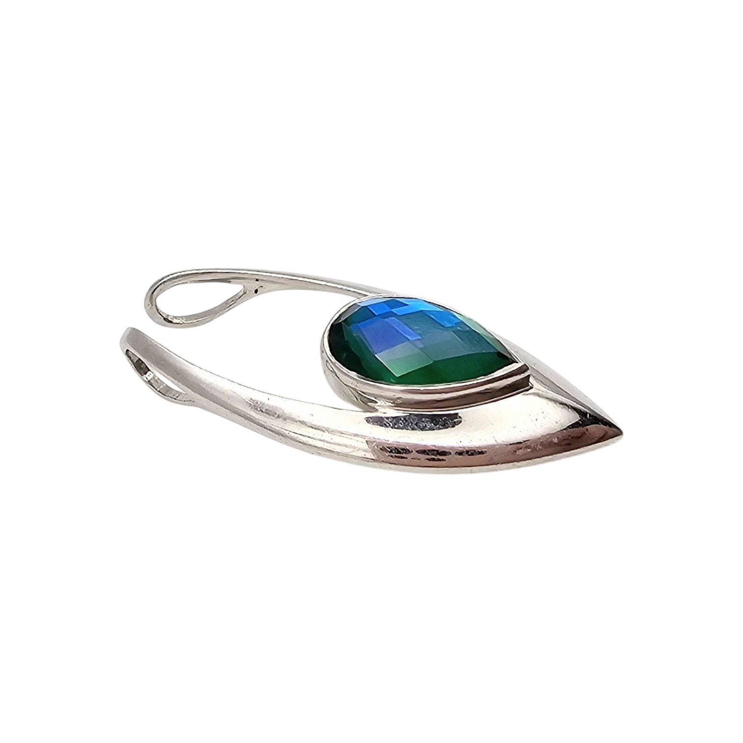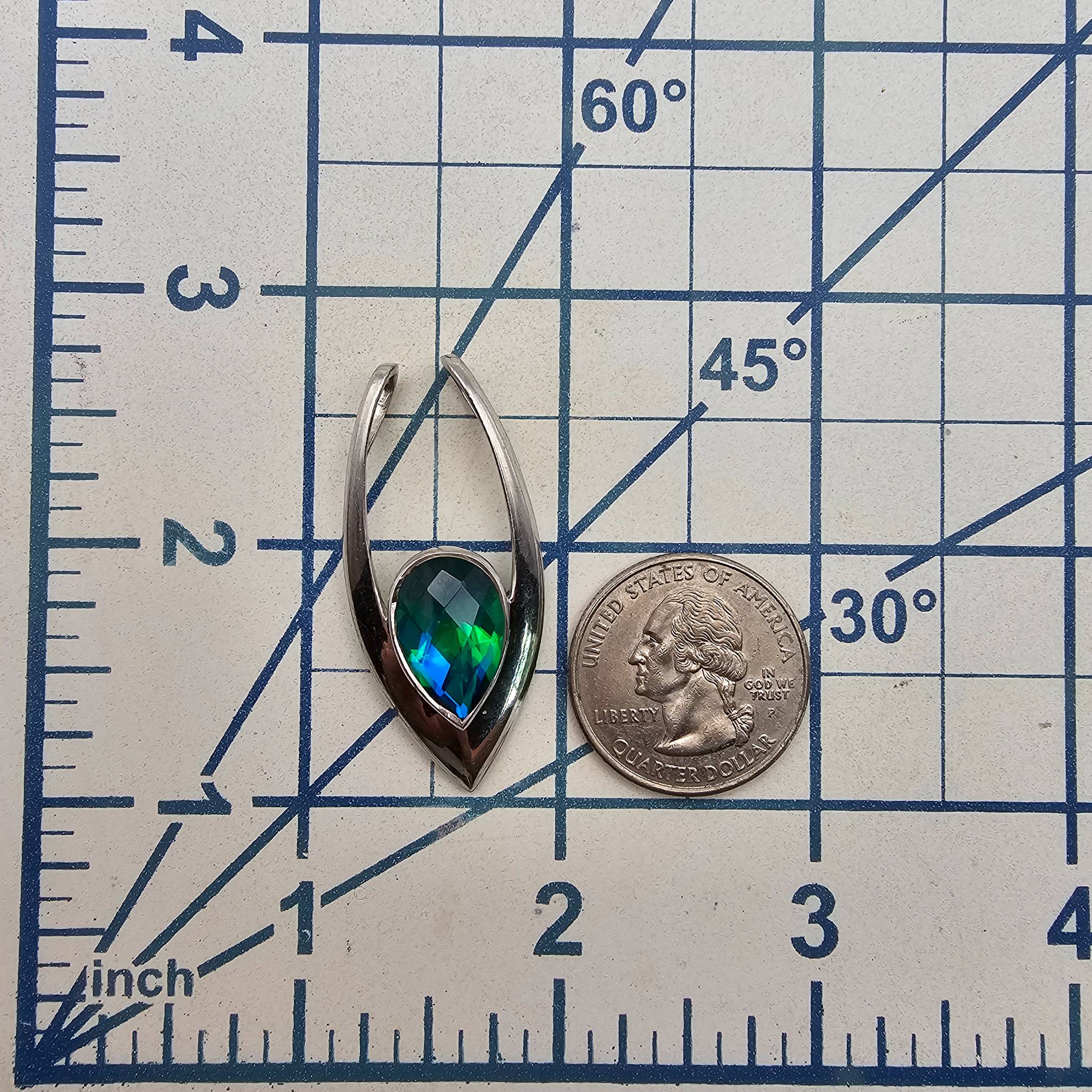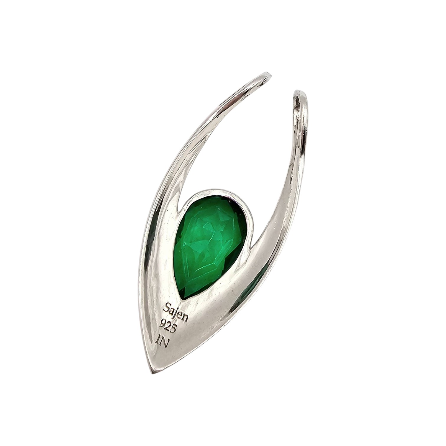 Sajen sterling silver pendant featuring a faceted tourmaline gemstone in a teardrop setting. Marked ‘Sajen 925 IN’ on the back, indicating sterling silver construction made in India. Weighs approximately 6.1 grams. Sleek contemporary design, measuring around 2 inches in length. Stone displays a vibrant blue-green hue, changing tones when viewed from different angles.