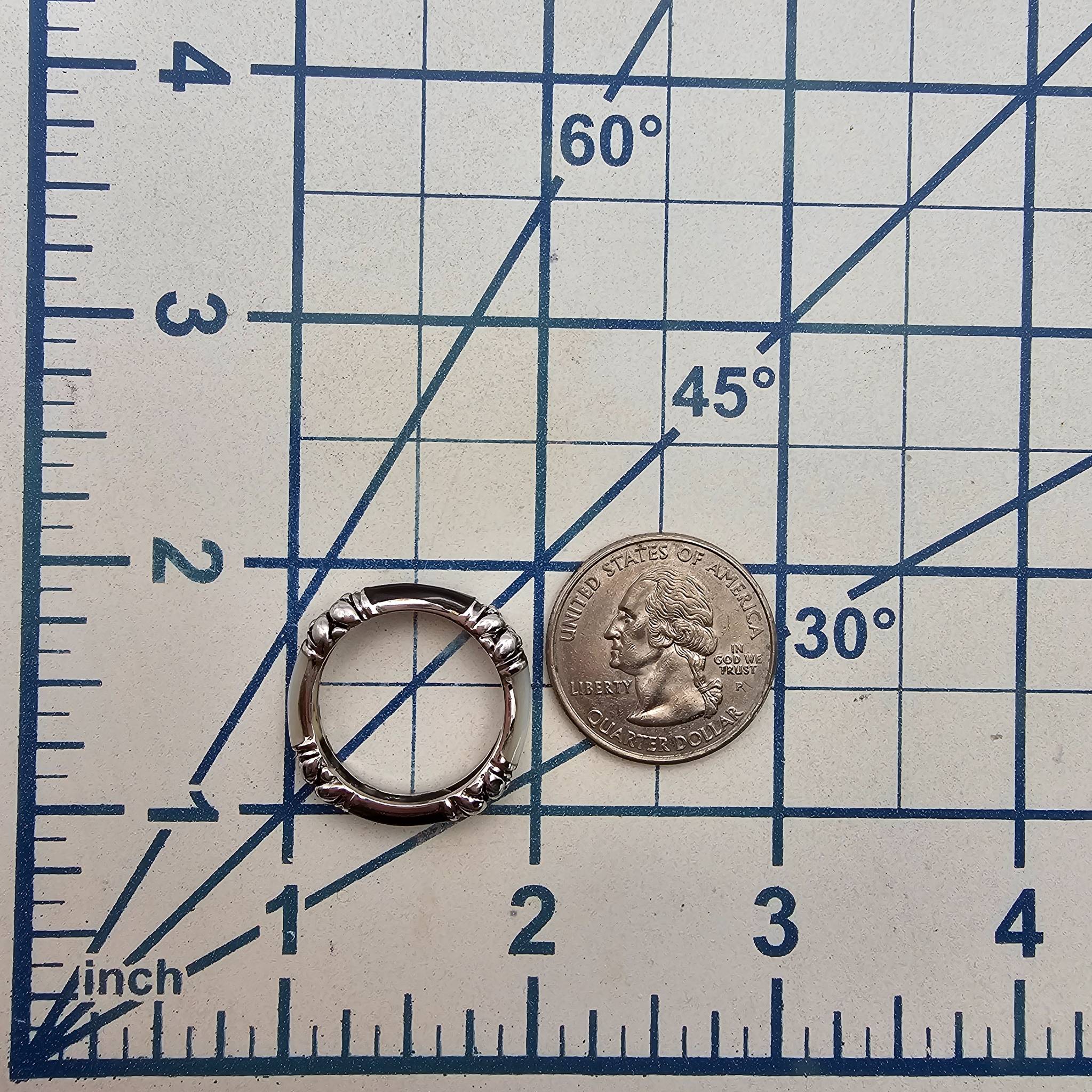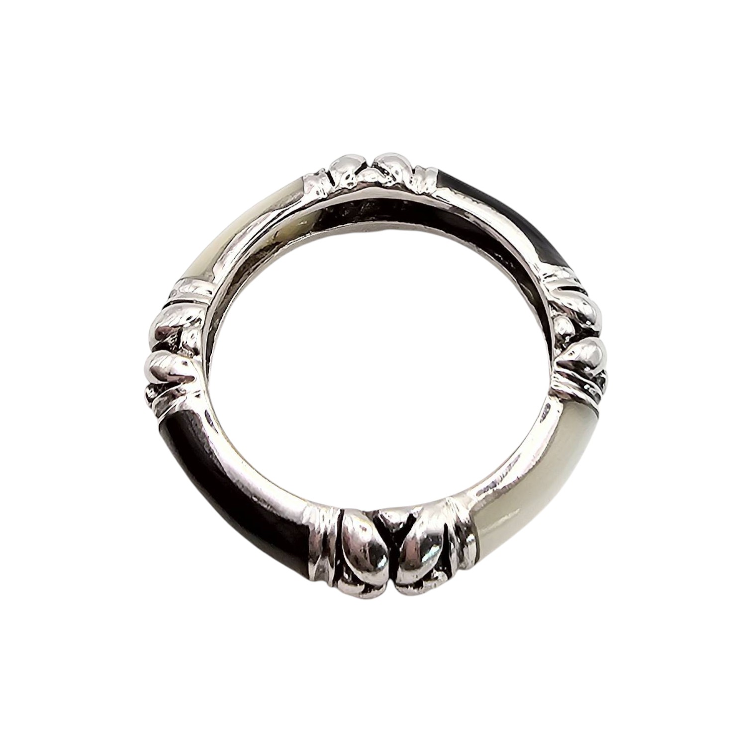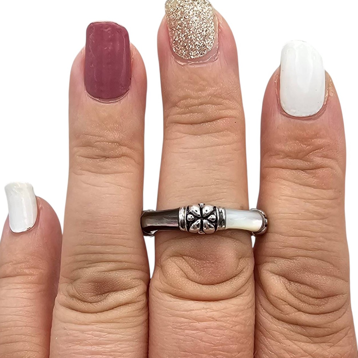 A CFJ sterling silver ring featuring abalone and mother-of-pearl inlays. Marked 925 for sterling silver purity. The ring is a size 8.25 with a weight of 3.7 grams. It showcases intricate metal detailing and measures approximately 1 inch in diameter as shown beside scale references.