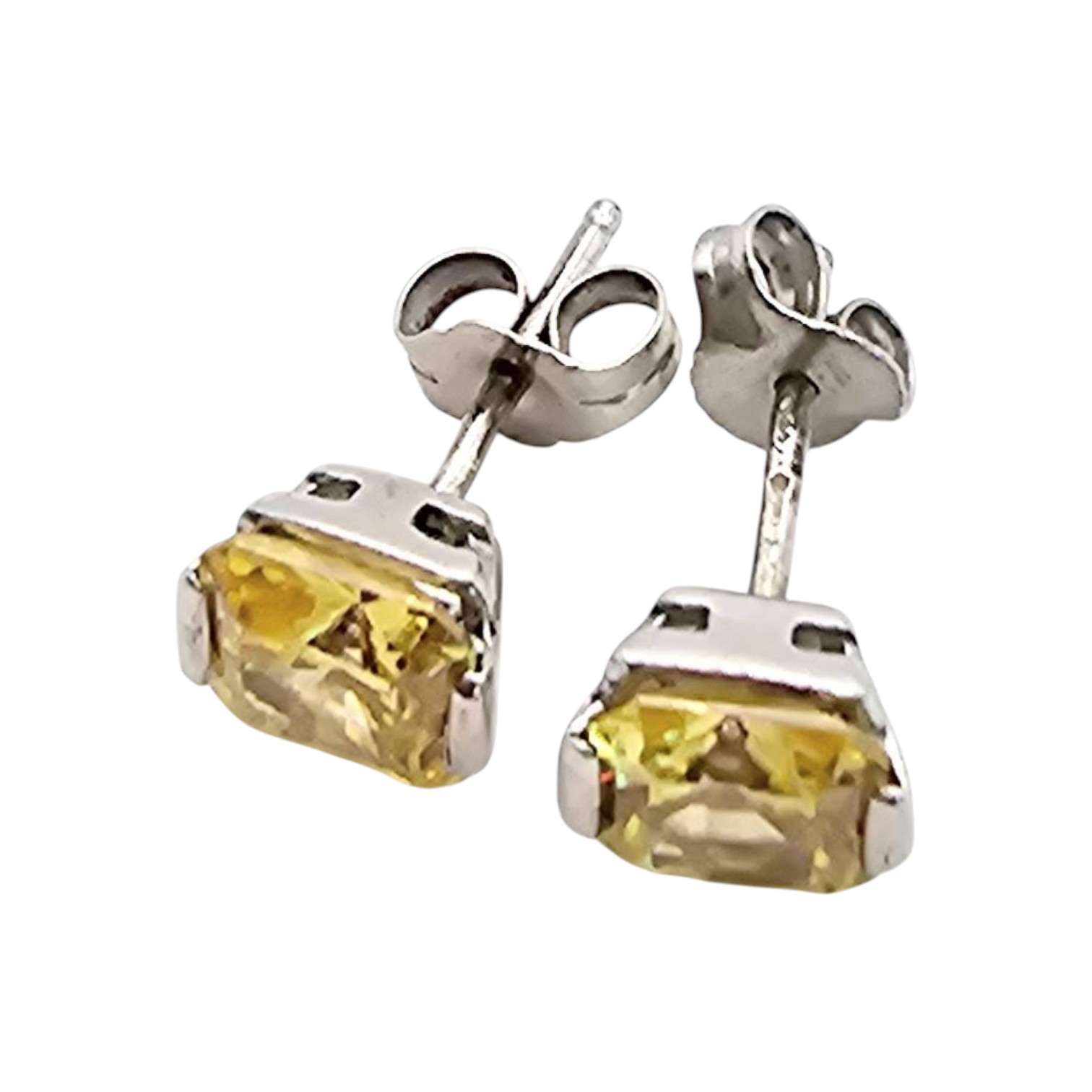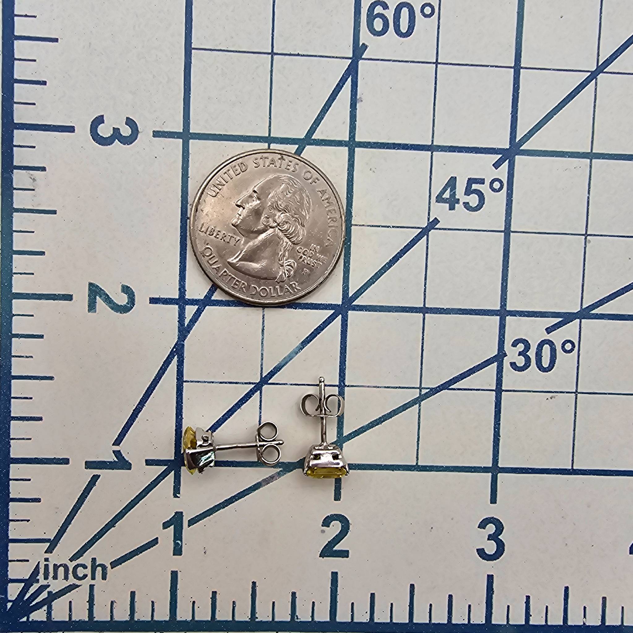 Sterling silver stud earrings featuring square-cut yellow rhinestones. Lightweight with a total weight of 1.7g. Suitable for pierced ears and secured with butterfly backings. Compact size, as shown next to a US quarter for scale.