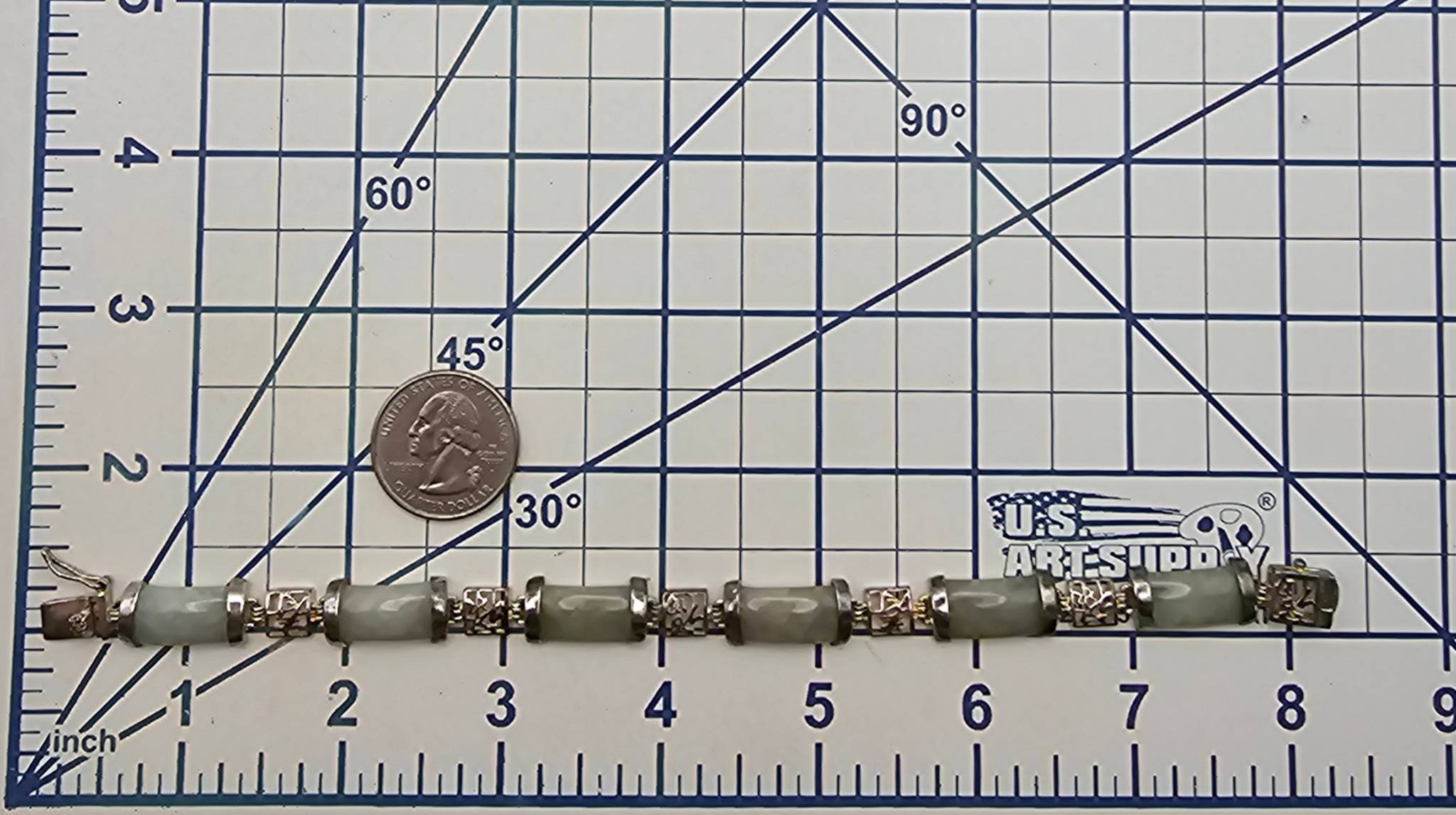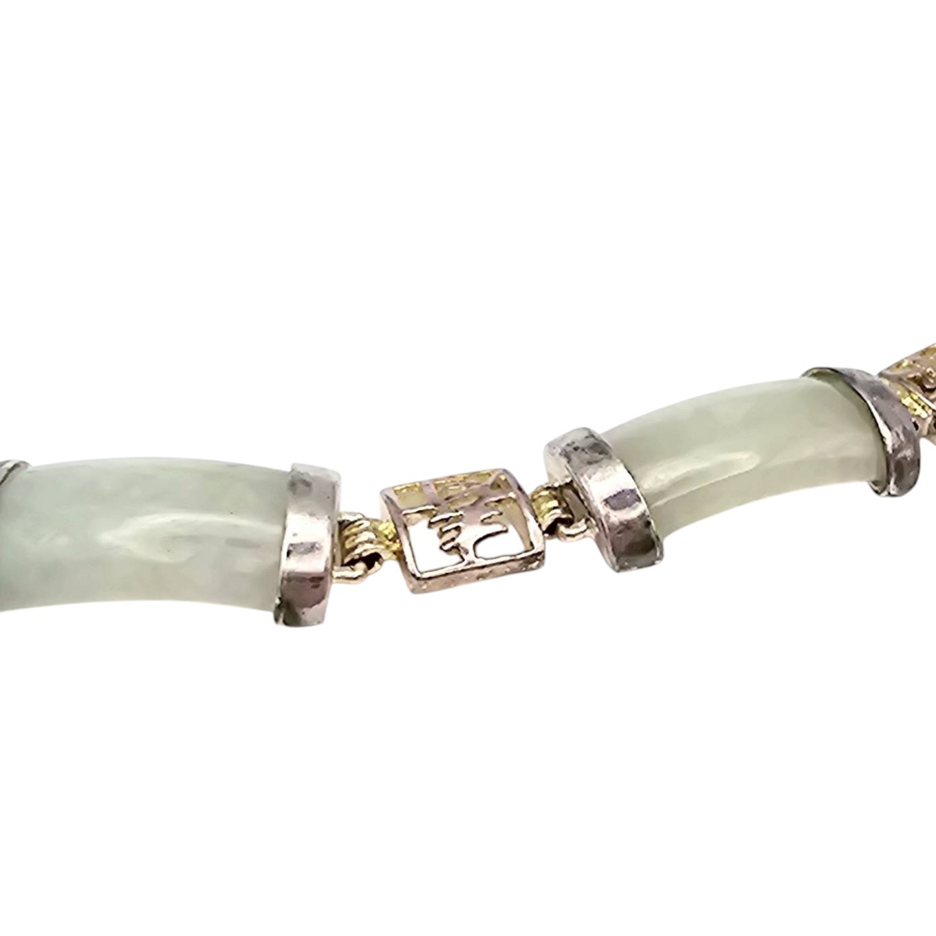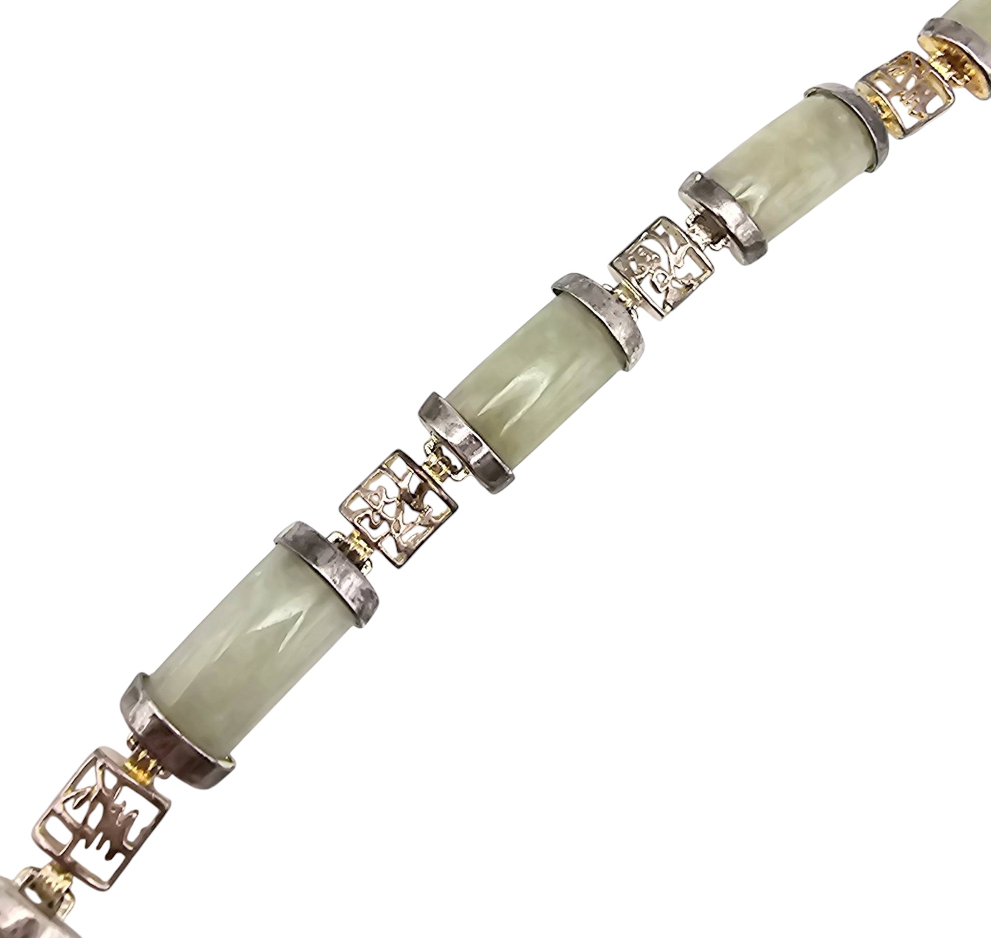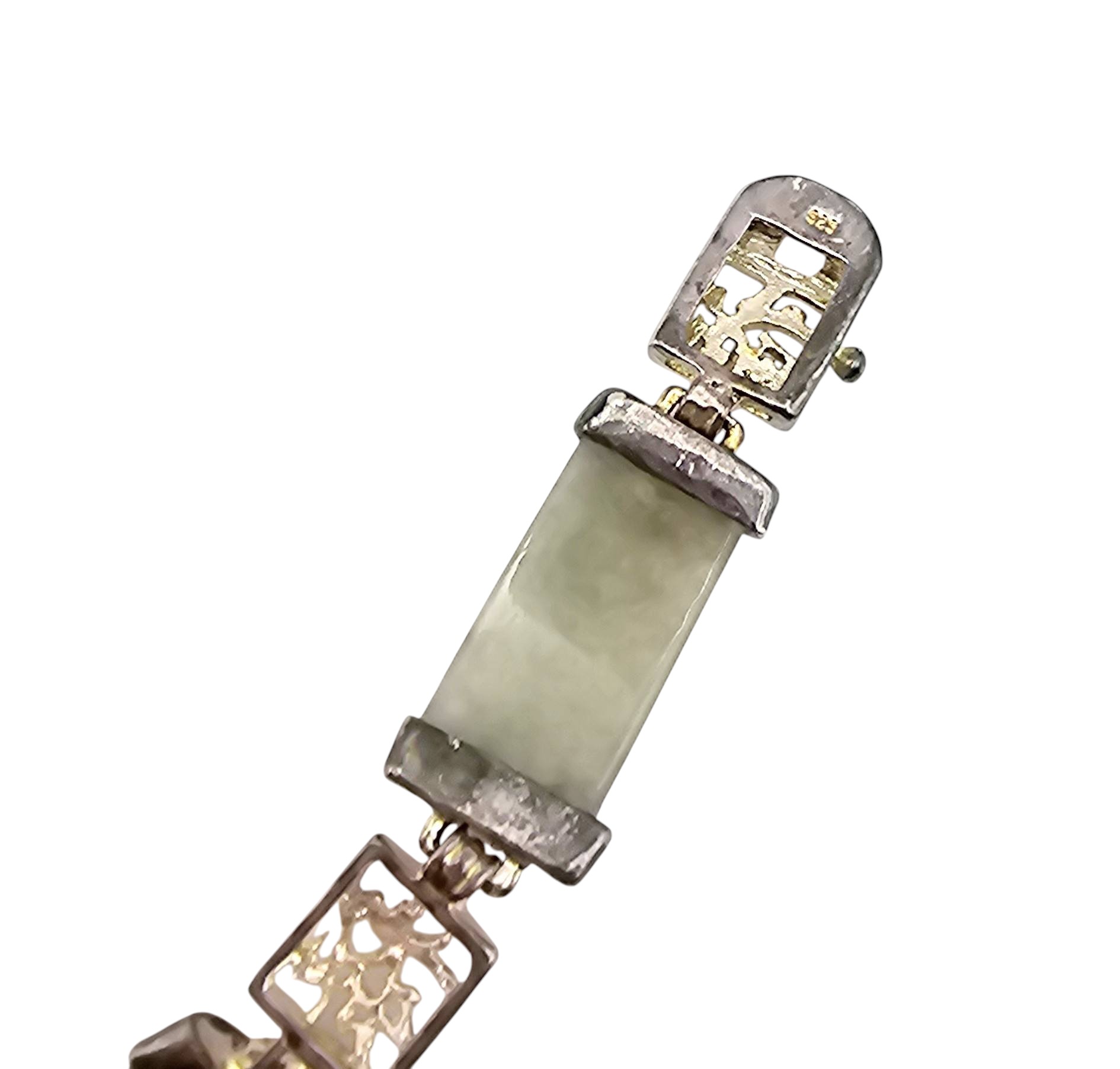 Beautiful bracelet featuring alternating segments of jade and Asian character panels plated with gold over sterling silver. The bracelet weighs 17.8 grams and includes a secure clasp. The jade adds an elegant touch, complemented by the intricate character designs. A piece with cultural and material value.