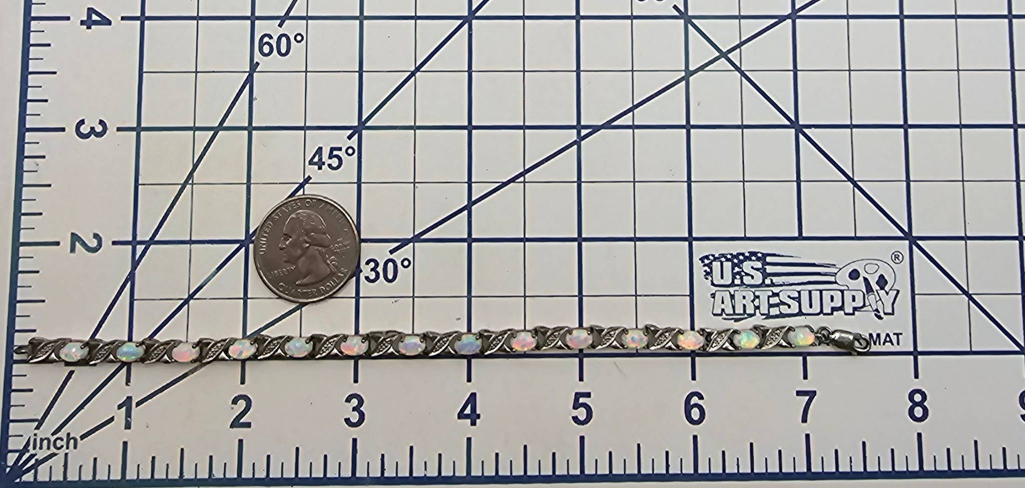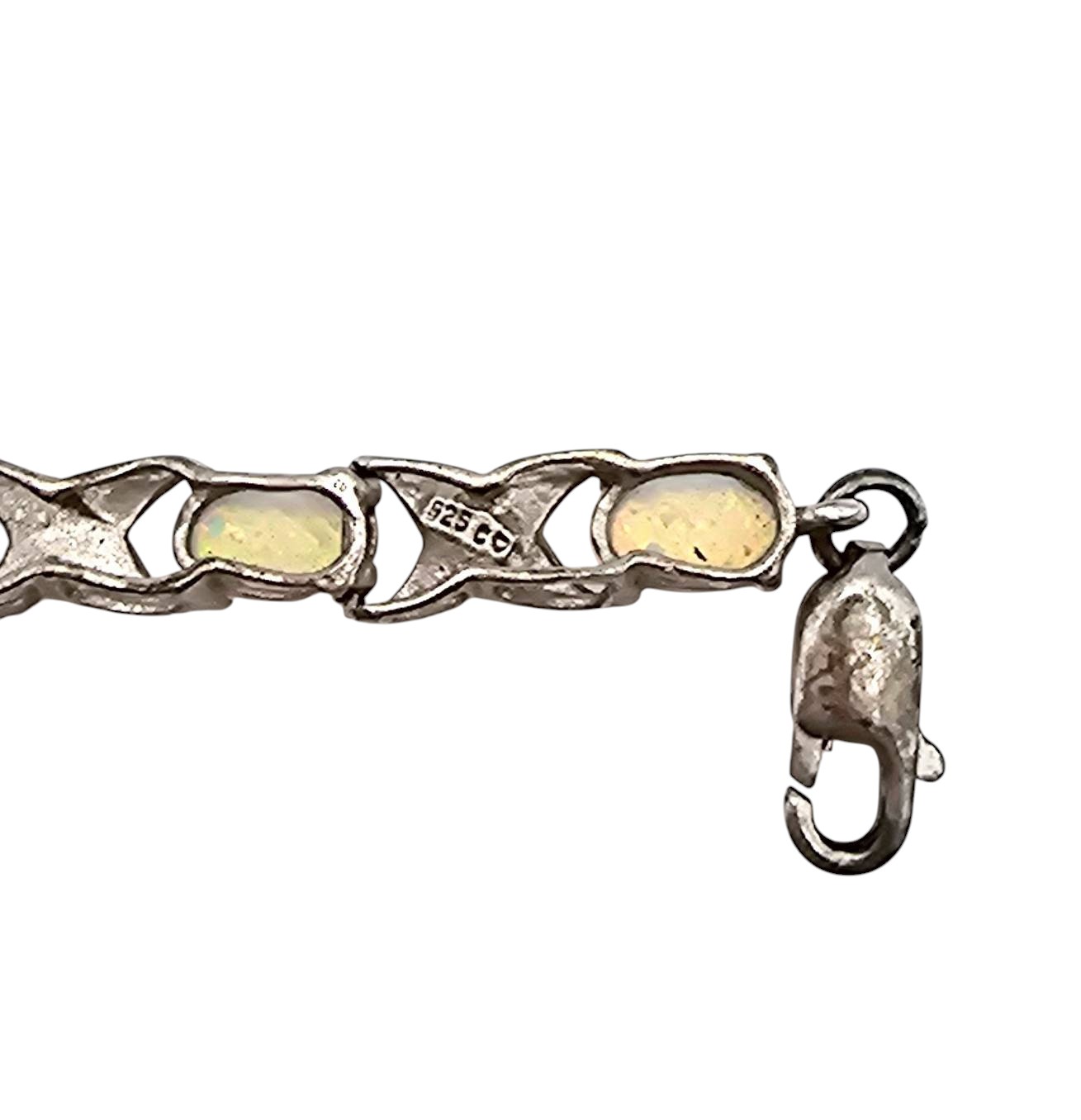 Opal tennis bracelet crafted from sterling silver. Features a series of opal stones set in alternating oval and decorative elements. Weighs 6.5 grams and includes a secure lobster clasp closure. The bracelet is hallmarked with ‘925’. Check images for approximate length and scale.