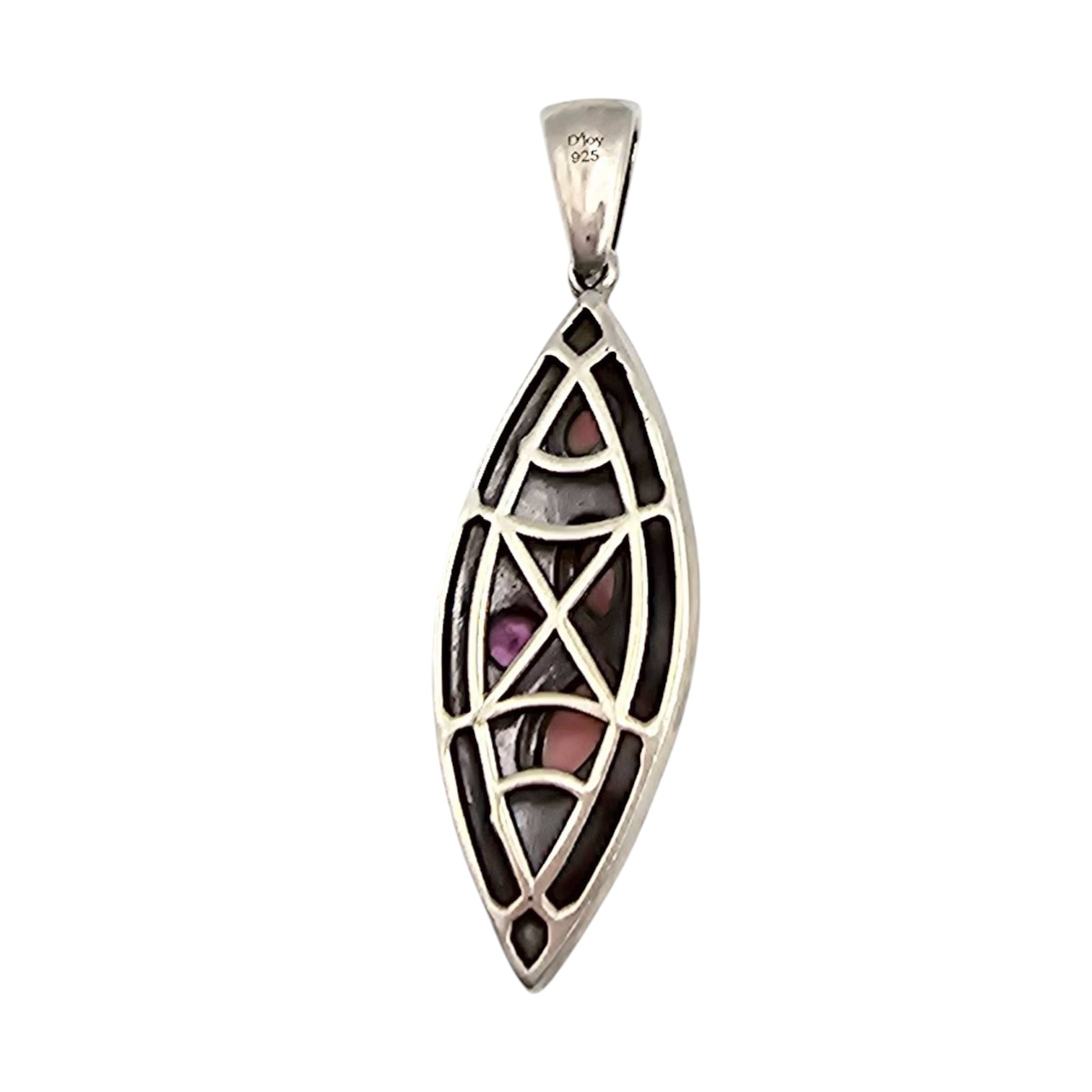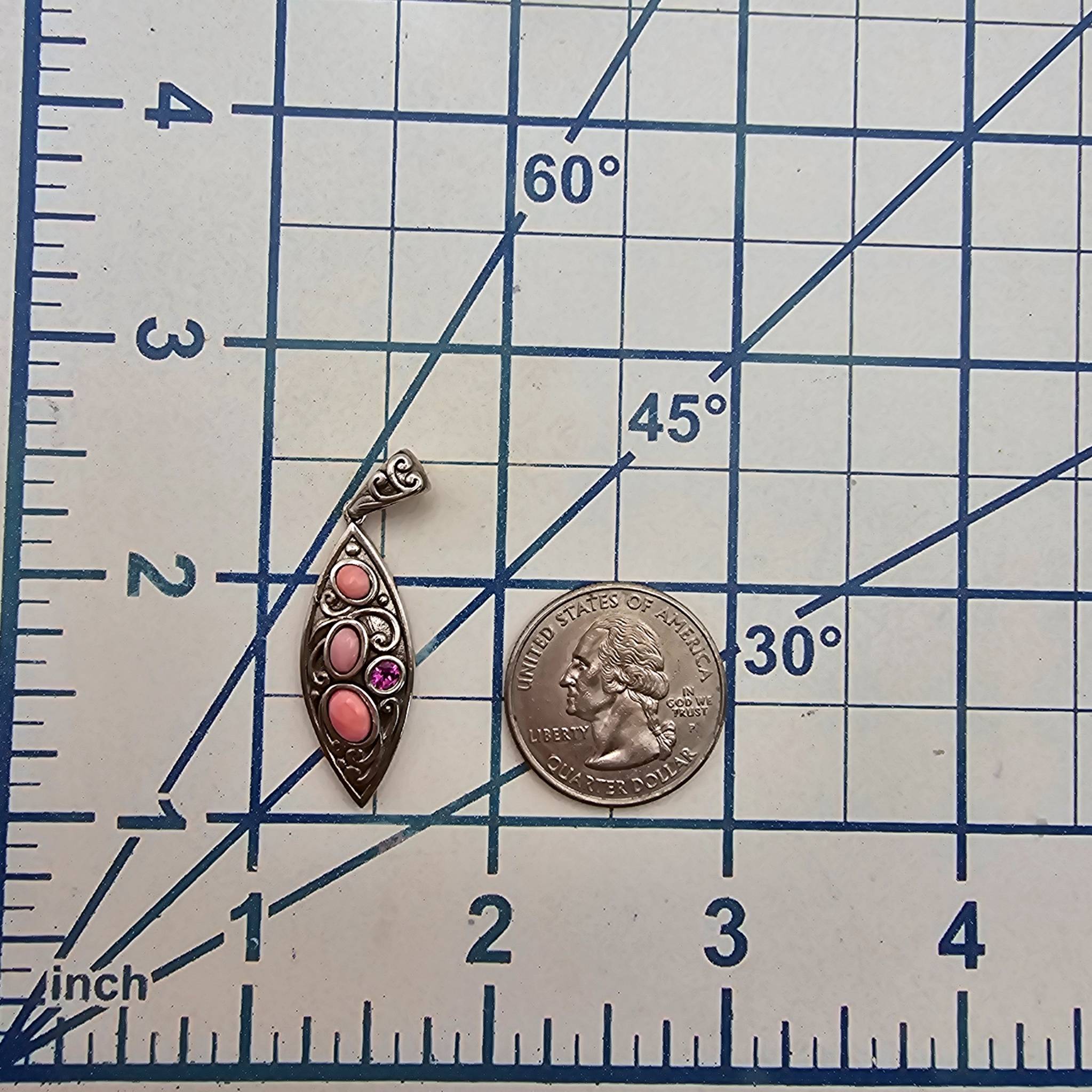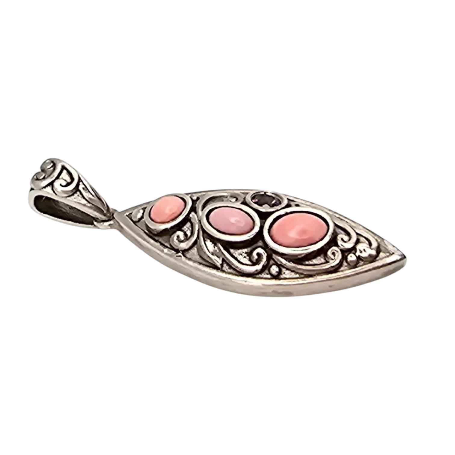 D’Joy sterling silver pendant featuring coral and amethyst gemstones. The pendant weighs 5g and has an elegant marquise-shaped design with decorative scroll details. The back is marked with ‘925’ for sterling silver purity. Approximate length is shown in relation to a US quarter for scale.