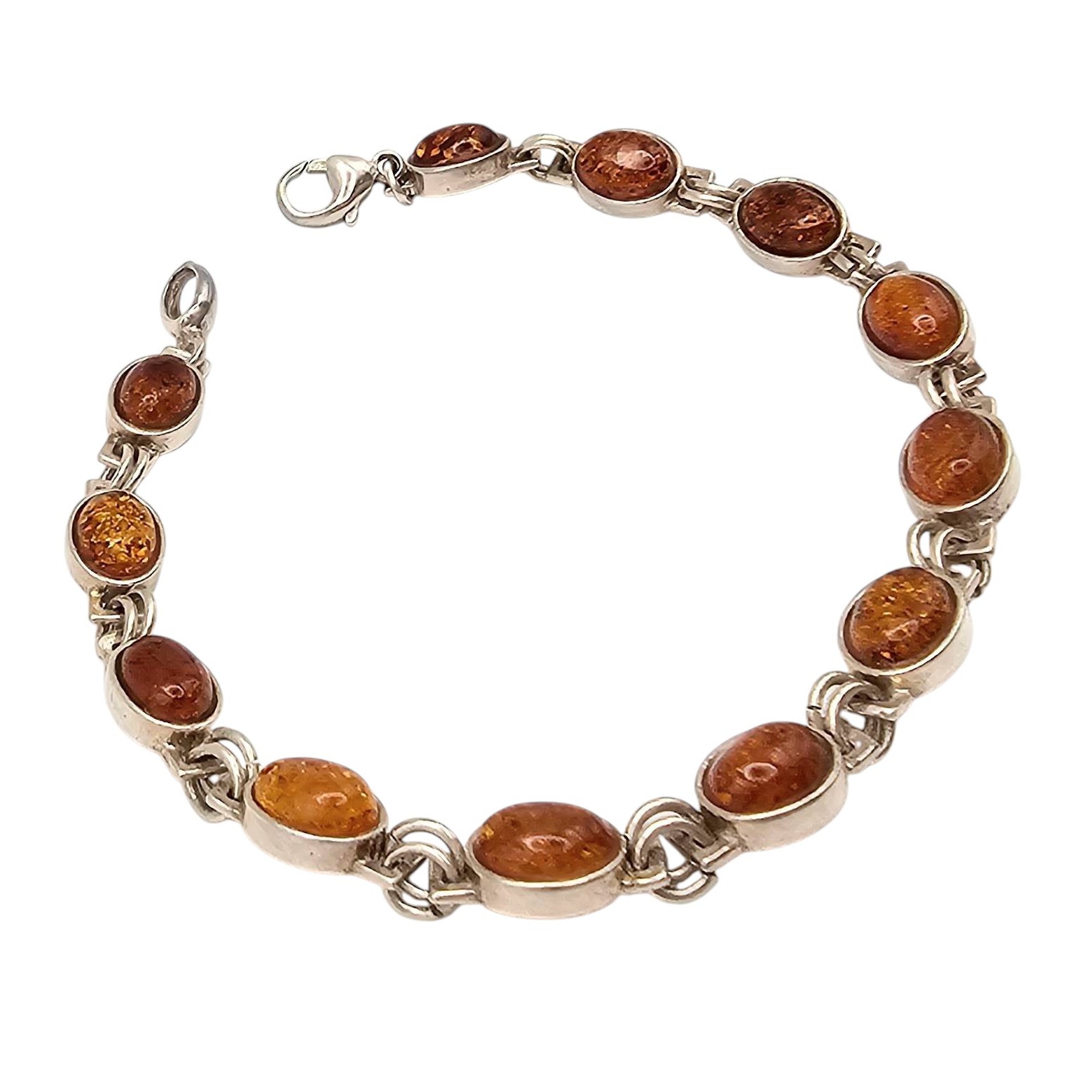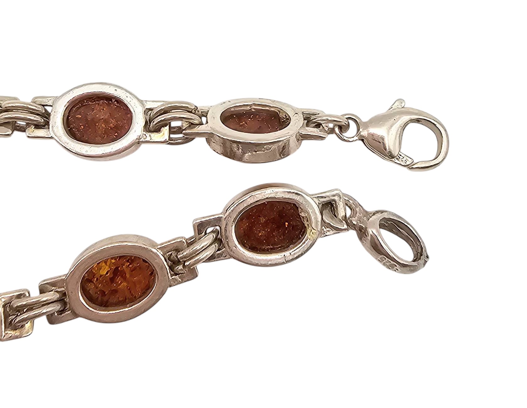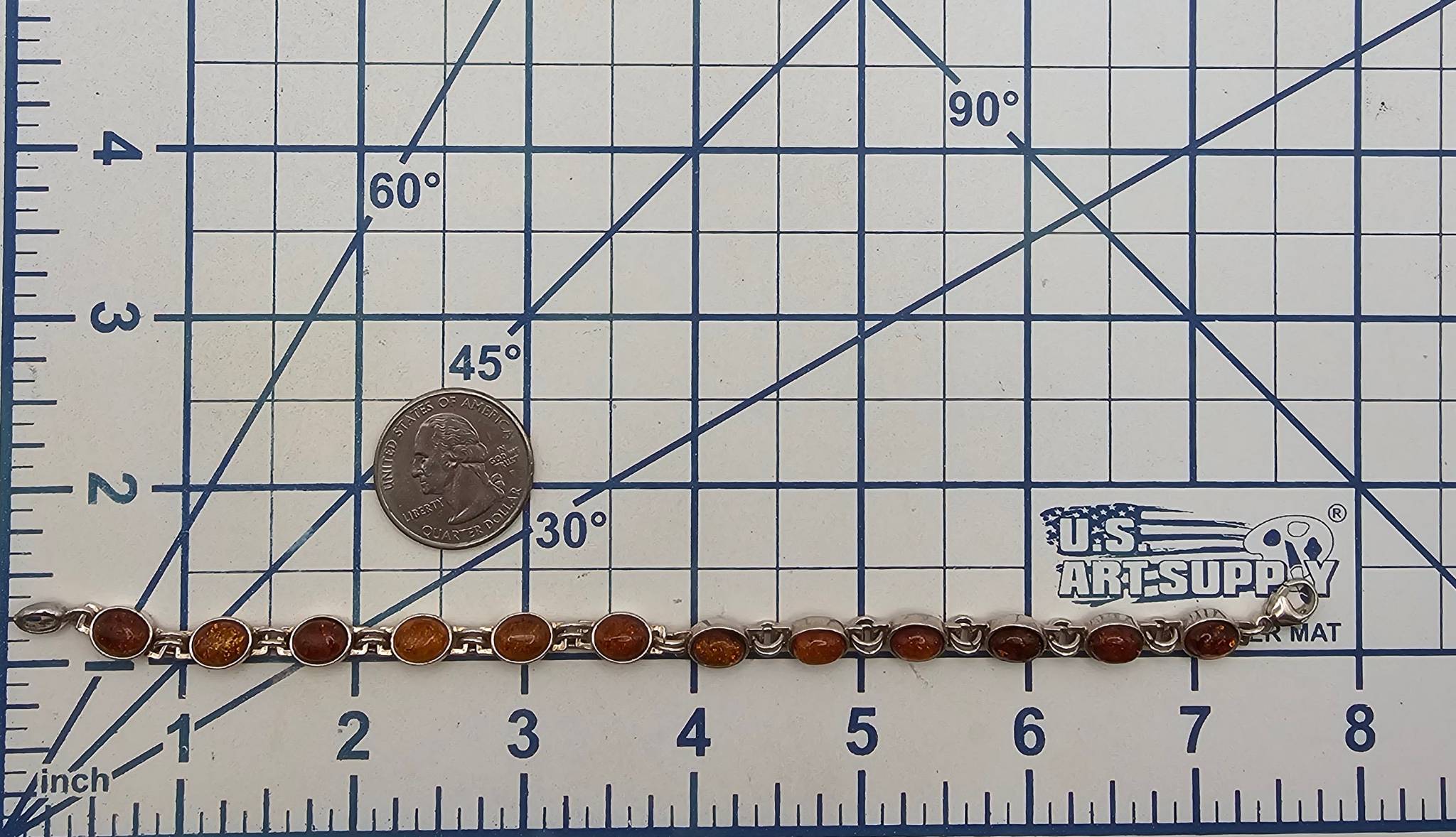 A bracelet made of sterling silver featuring a series of oval amber stones. The piece has a total weight of 11.8 grams and includes a secure lobster clasp fastening. Length measures approximately 7.5 inches as indicated by the scale. The bracelet is in good condition with visible details of the amber stones.