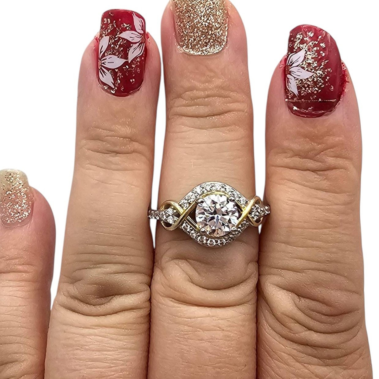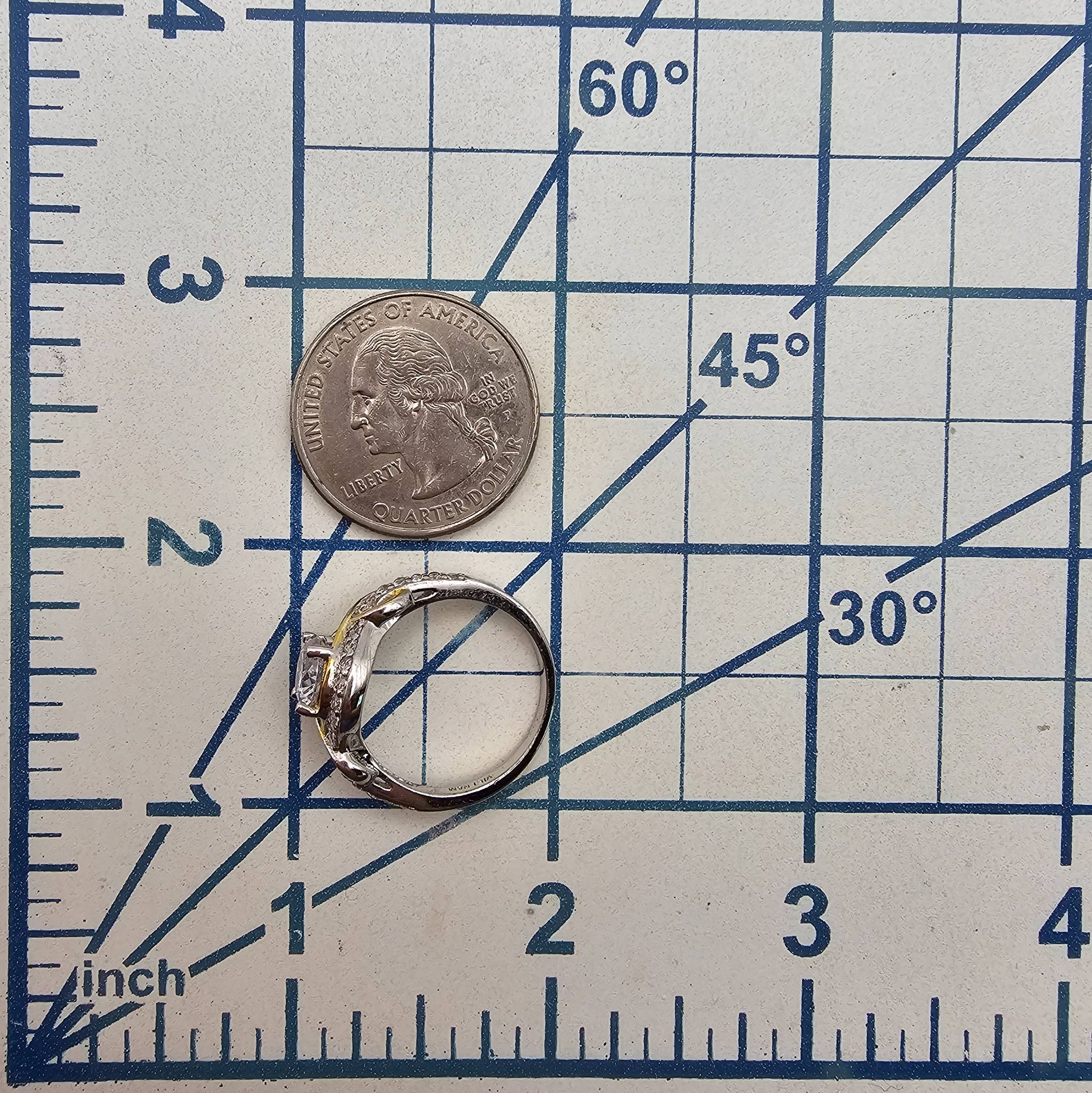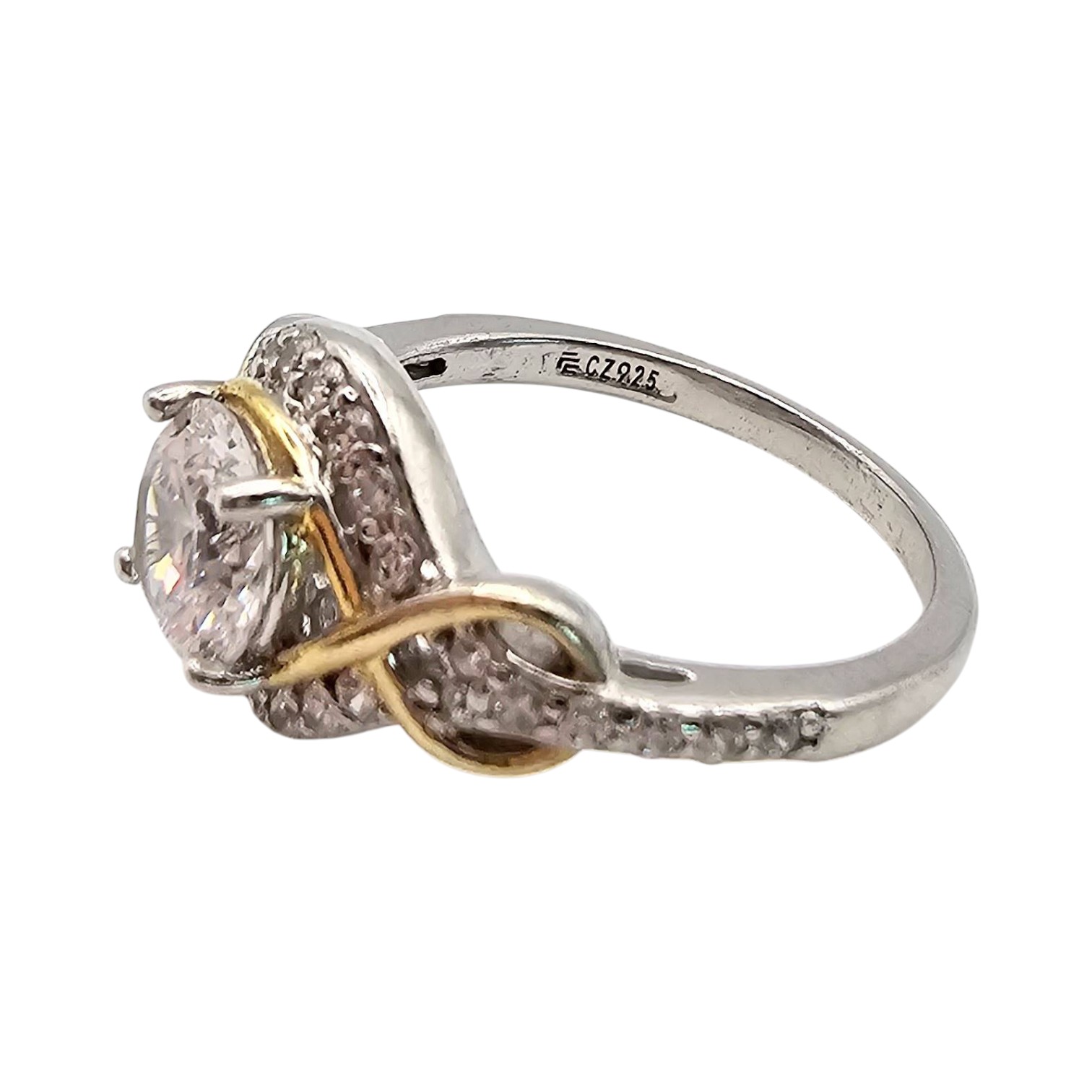 Sterling silver ring featuring a central cubic zirconia stone accented by smaller CZ stones along the band. Gold-tone detailing enhances the design, creating a dual-tone appearance. Marked ‘FE CZ 925’ and weighing 4.1 grams. Ring size is 7.75. Suitable for various occasions.