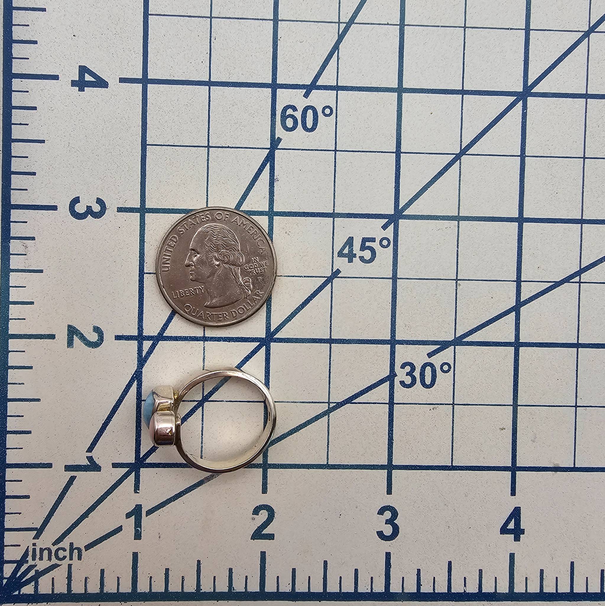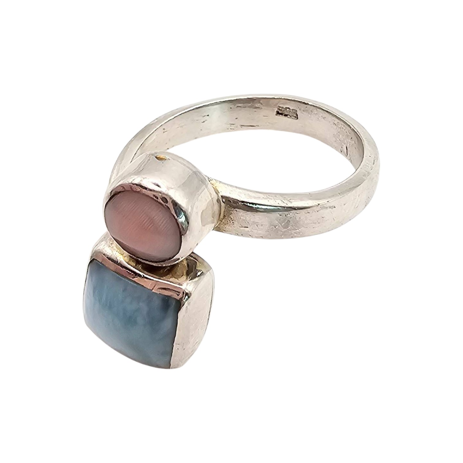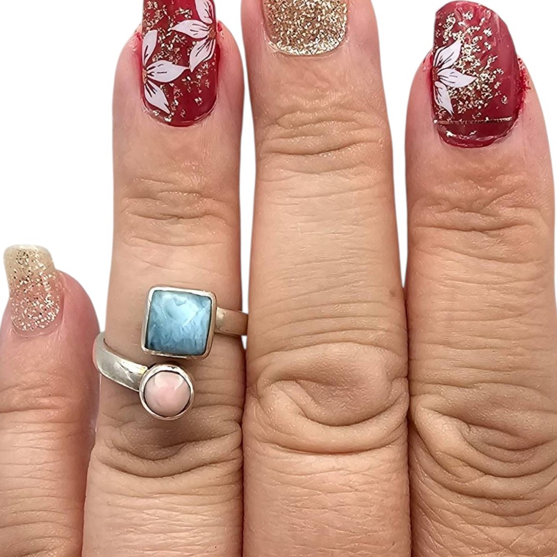 Adjustable sterling silver ring featuring a square larimar stone and a round pink shell accent. Crafted from sterling silver, the ring weighs 4.4 grams and offers versatility with its adjustable band. Suitable for a variety of ring sizes.