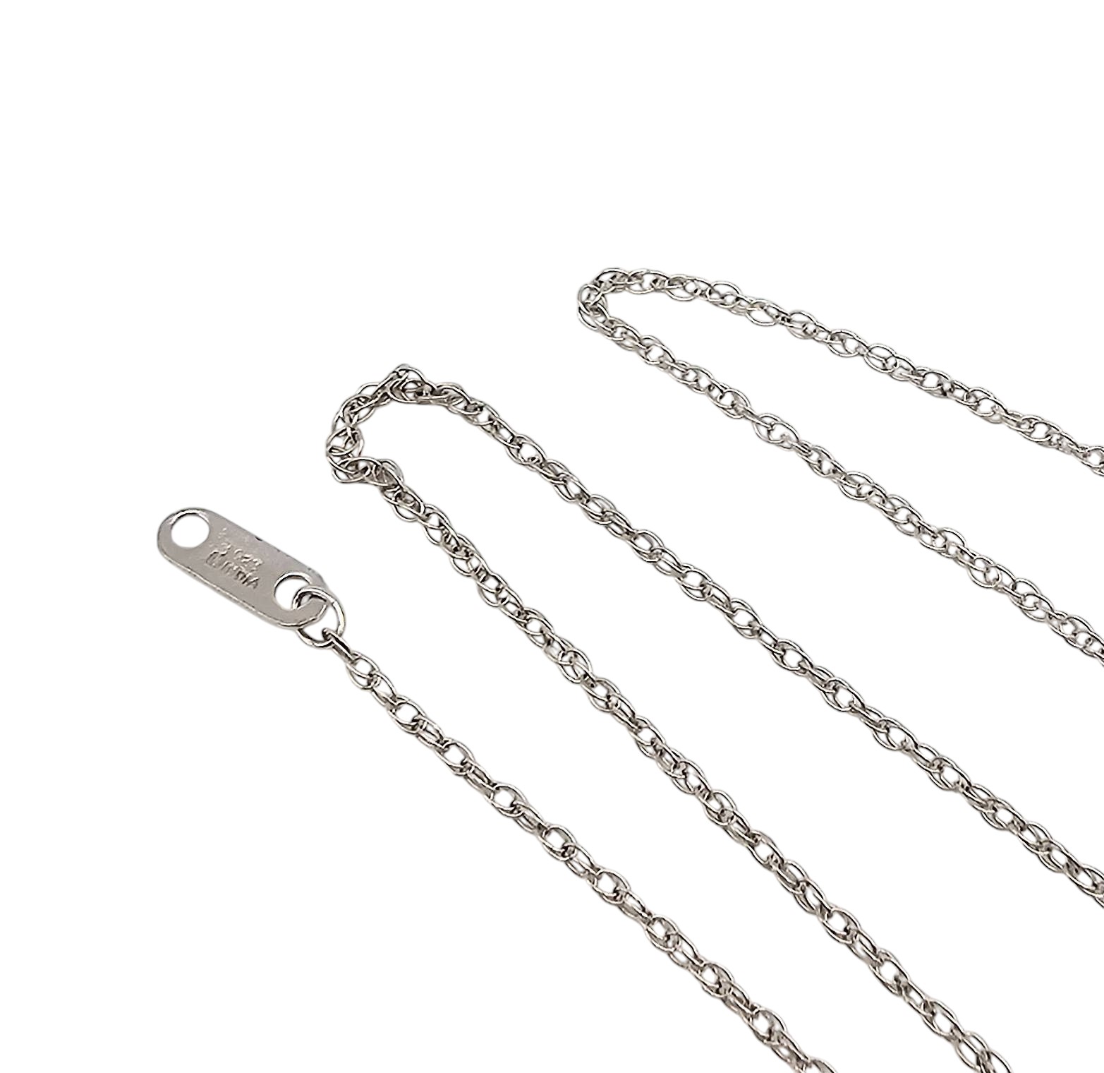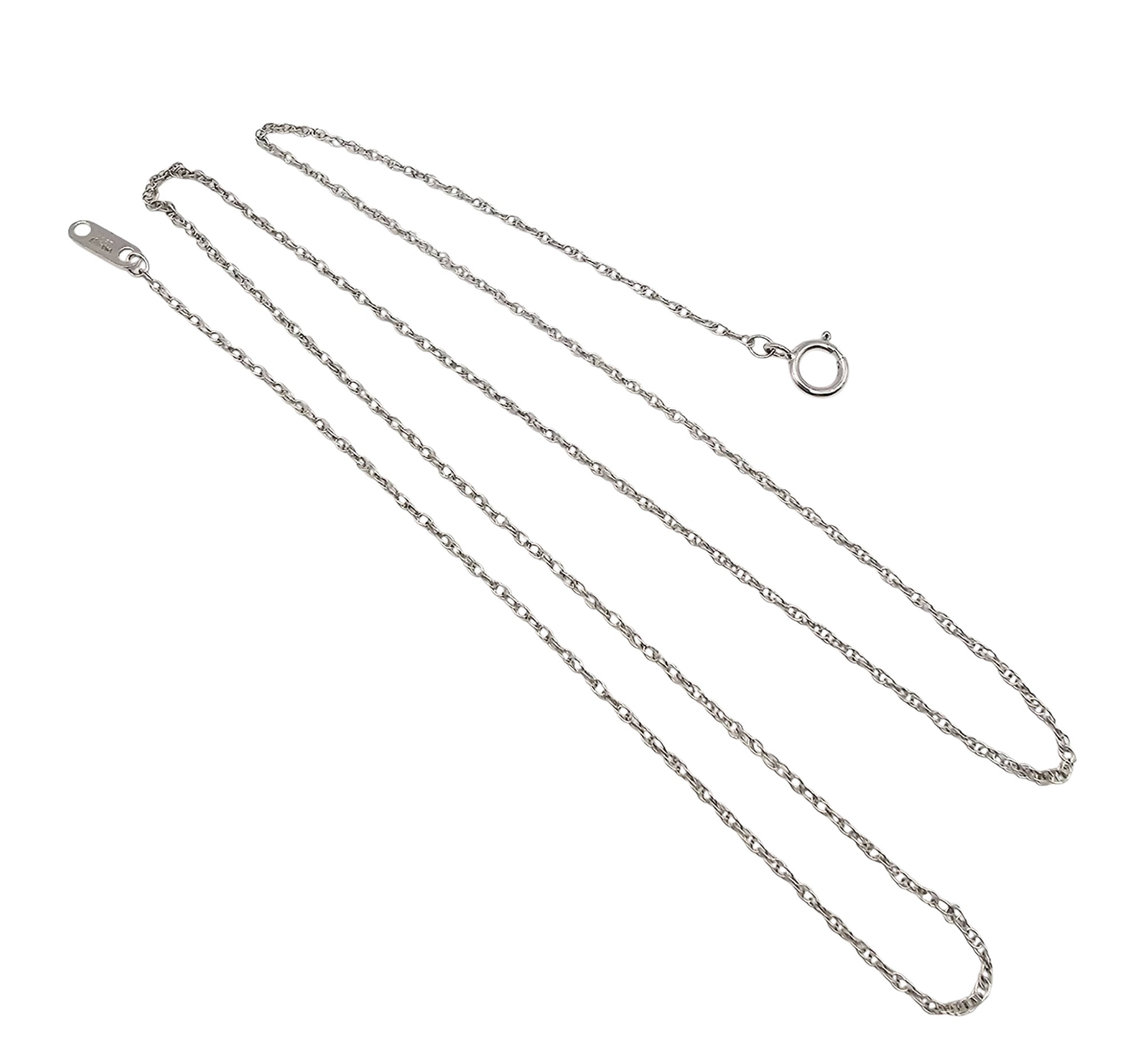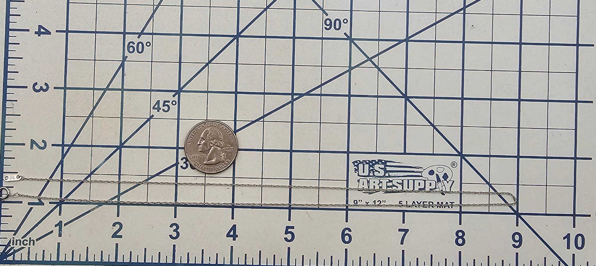 Sterling silver cable chain necklace. Lightweight with a total weight of 0.9g. Standard cable chain style. Secure spring ring clasp closure. Ideal for small pendants or standalone wear. Measurement visually provided for scale alongside a ruler and coin.