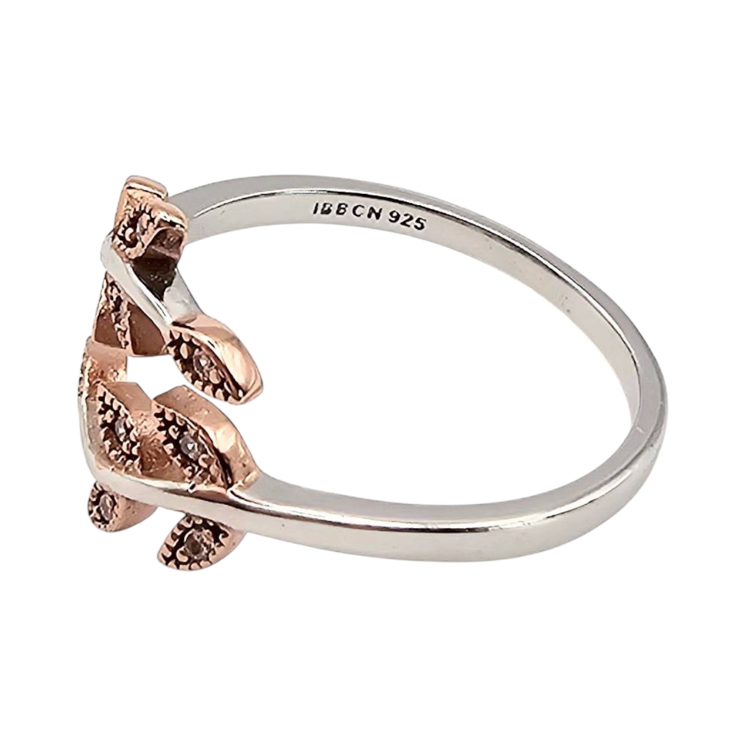 IBB sterling silver ring with rose gold-tone leaf design. The ring is embellished with a textured leaf motif. Ring size is 7.75 and it weighs 2.2 grams. Marked ‘IBB CN 925’ on the inside band, indicating authenticity and material. Ideal for wear or collection.