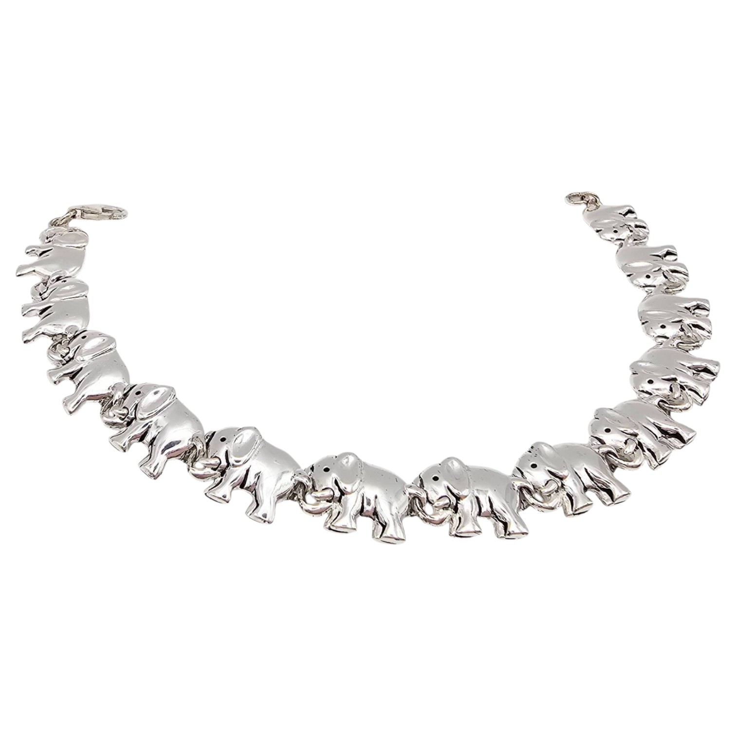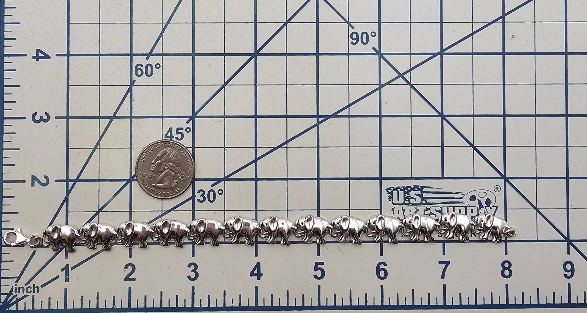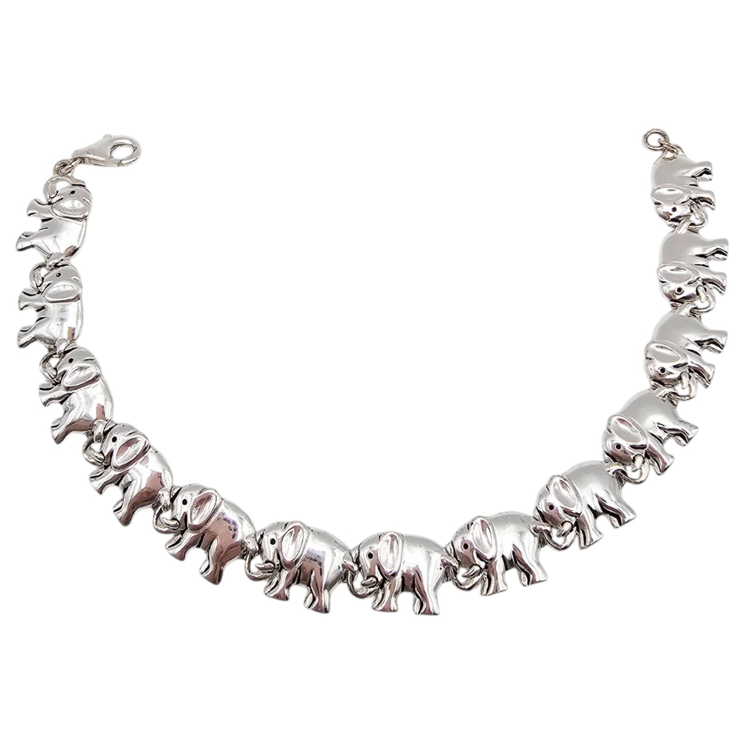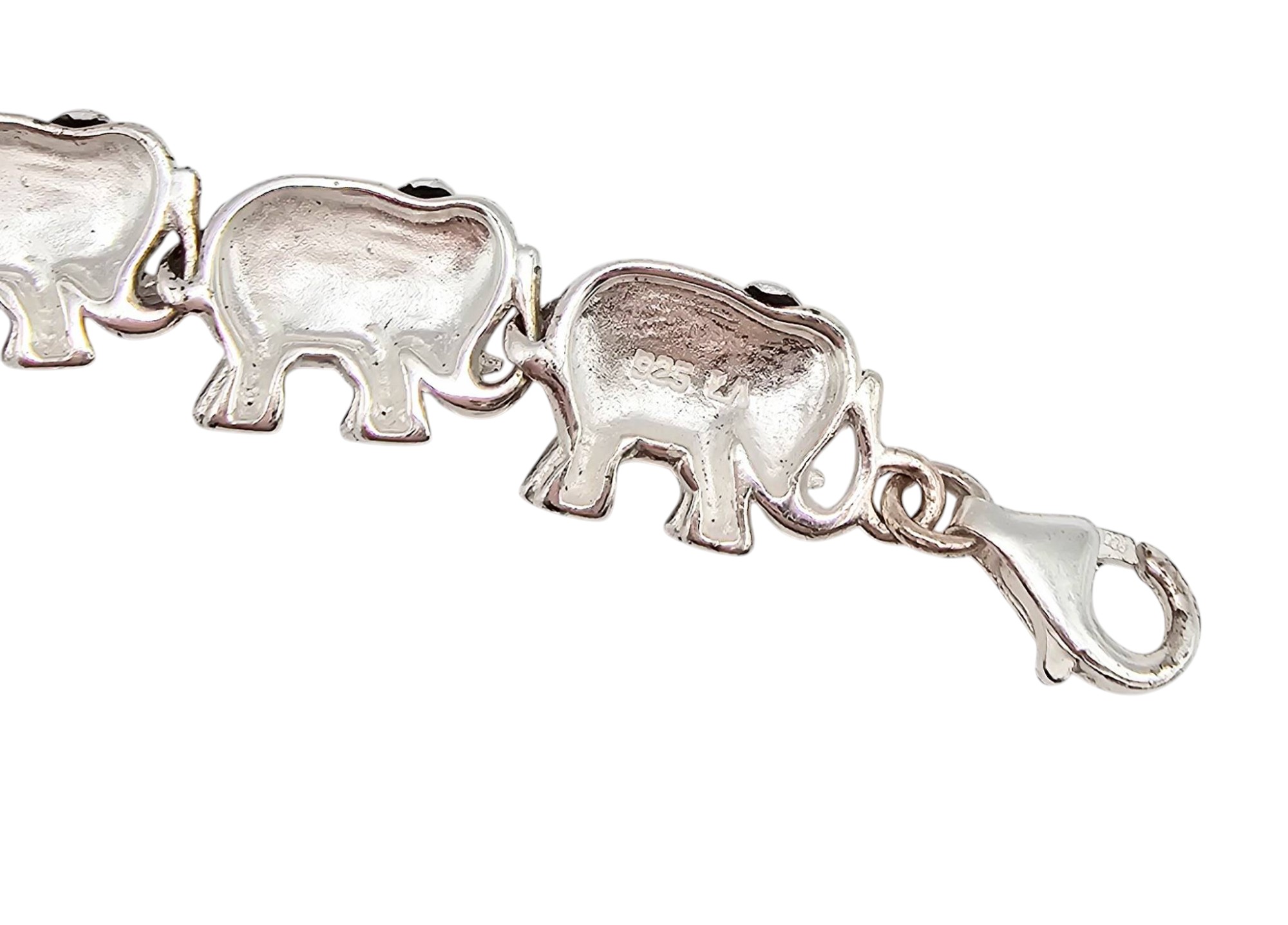 Sterling silver bracelet featuring a series of interconnected elephant-shaped links. Stamped ‘LA’ indicating sterling silver composition. Weighs 16.9 grams. Secures with a lobster clasp. Measures approximately 7 inches in length as displayed.