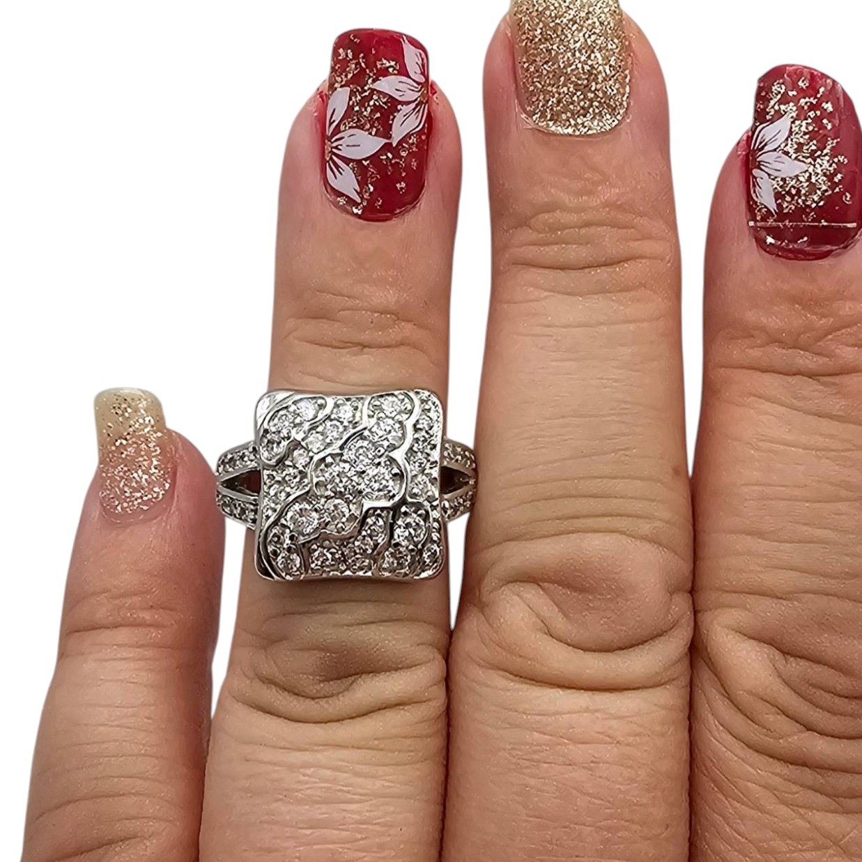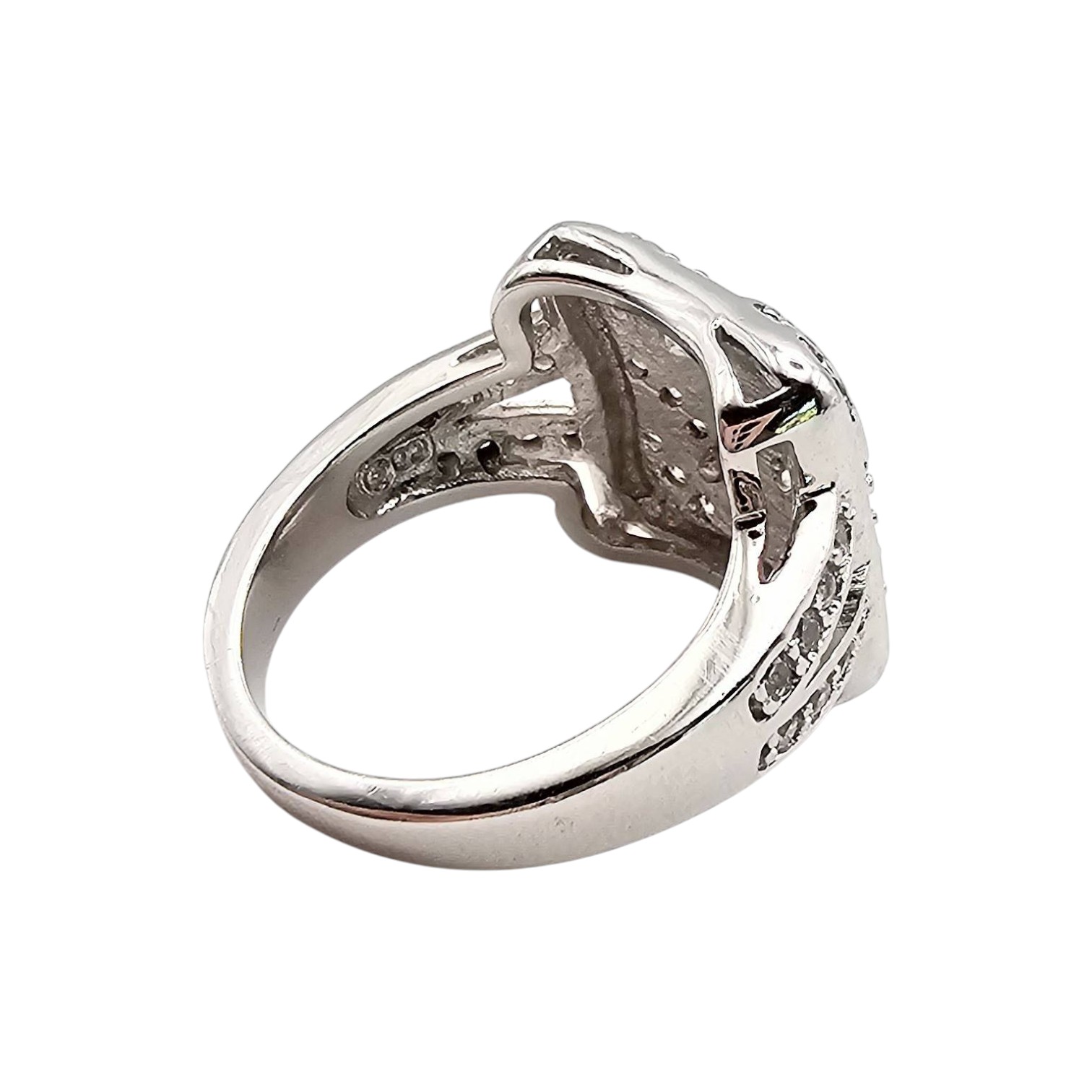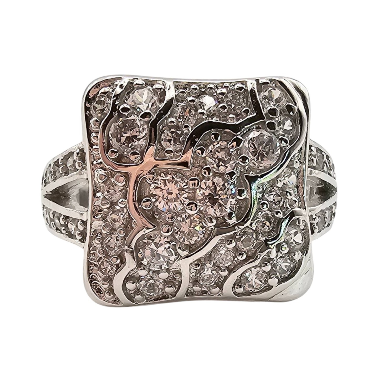 Sterling silver ring adorned with cubic zirconia stones. Ring size is 5.75, and the total weight is 6.3 grams. Features pave-style settings on a square-shaped design. Made from sterling silver, as indicated by the stamp.