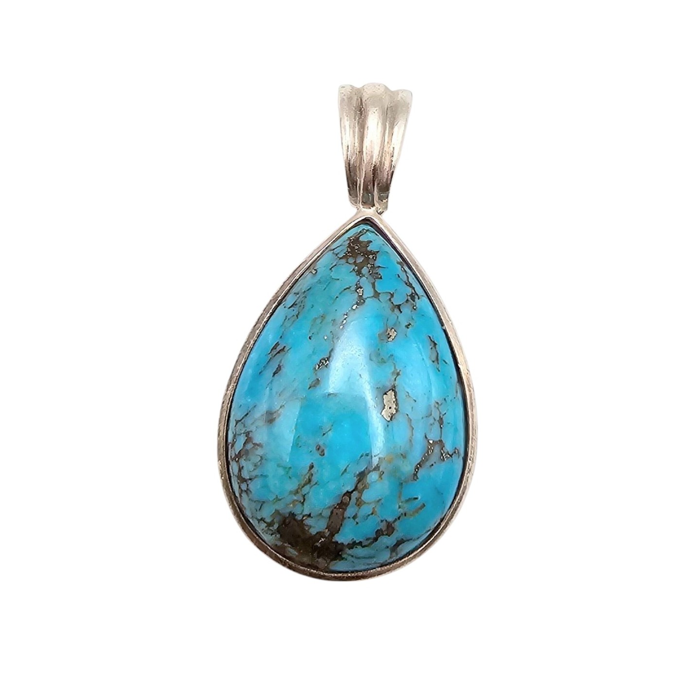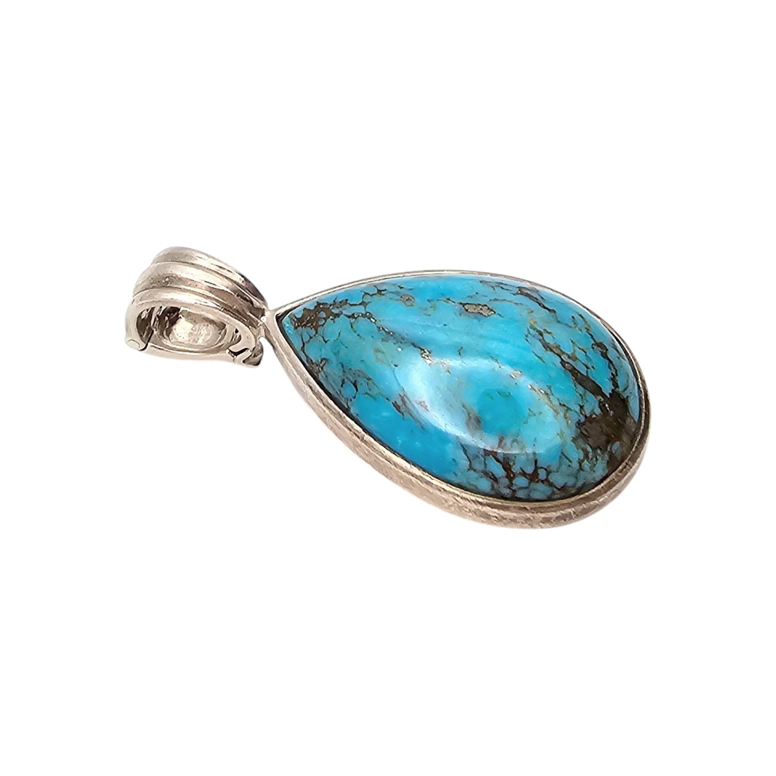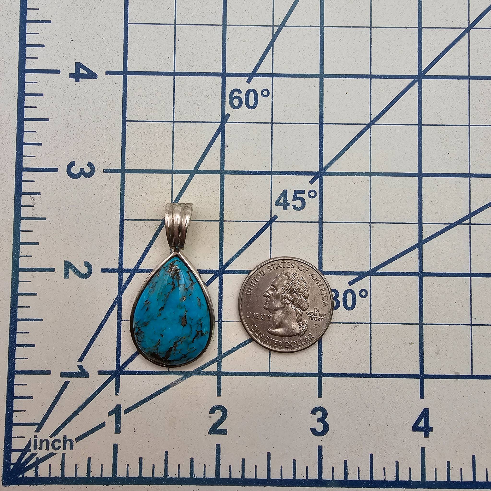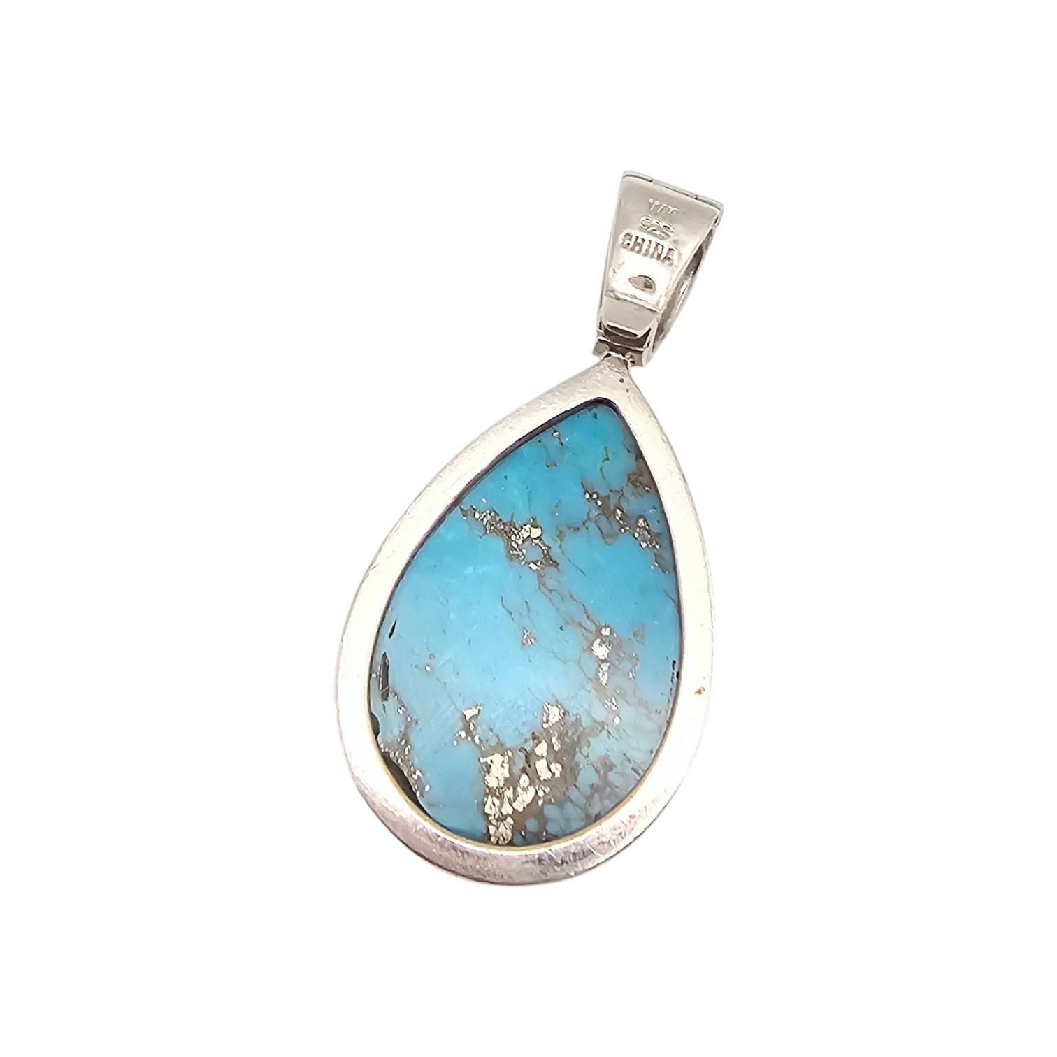 Sterling silver pendant featuring an 8.2g teardrop-shaped turquoise stone with natural veining. Stamped ‘WK 925,’ indicating sterling silver. The pendant measures approximately 1.5 inches tall (excluding bail) and includes a sturdy bail for chain attachment.