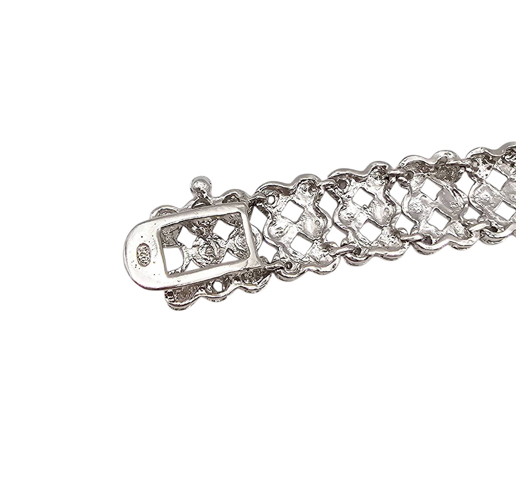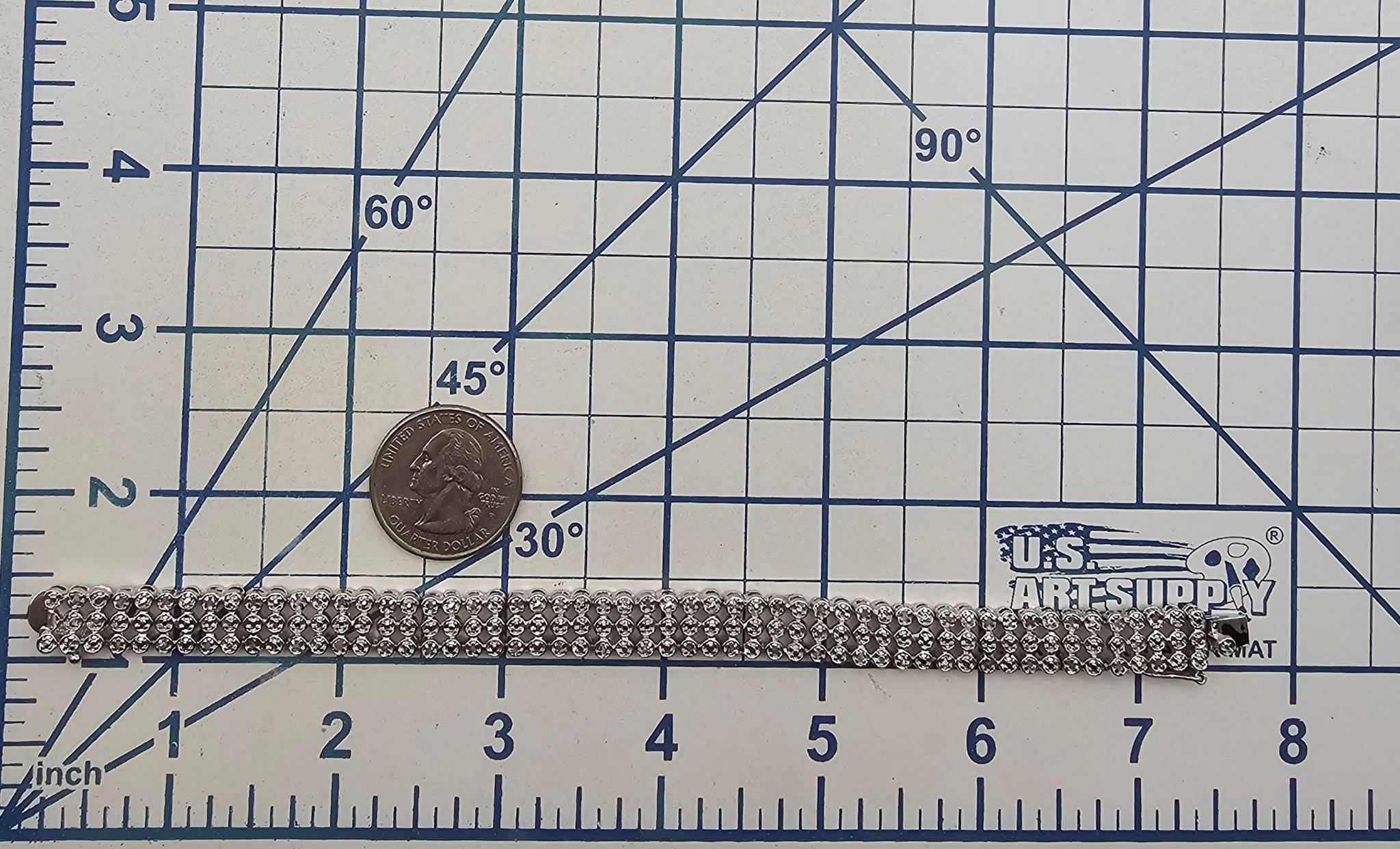 Diamond tennis bracelet crafted in sterling silver with a total weight of 15.4 grams. Features a repeating pattern of round settings, secured with a clasp closure. Stylish and durable, suitable for both casual and formal occasions. Dimensions are shown relative to a reference ruler in the images.