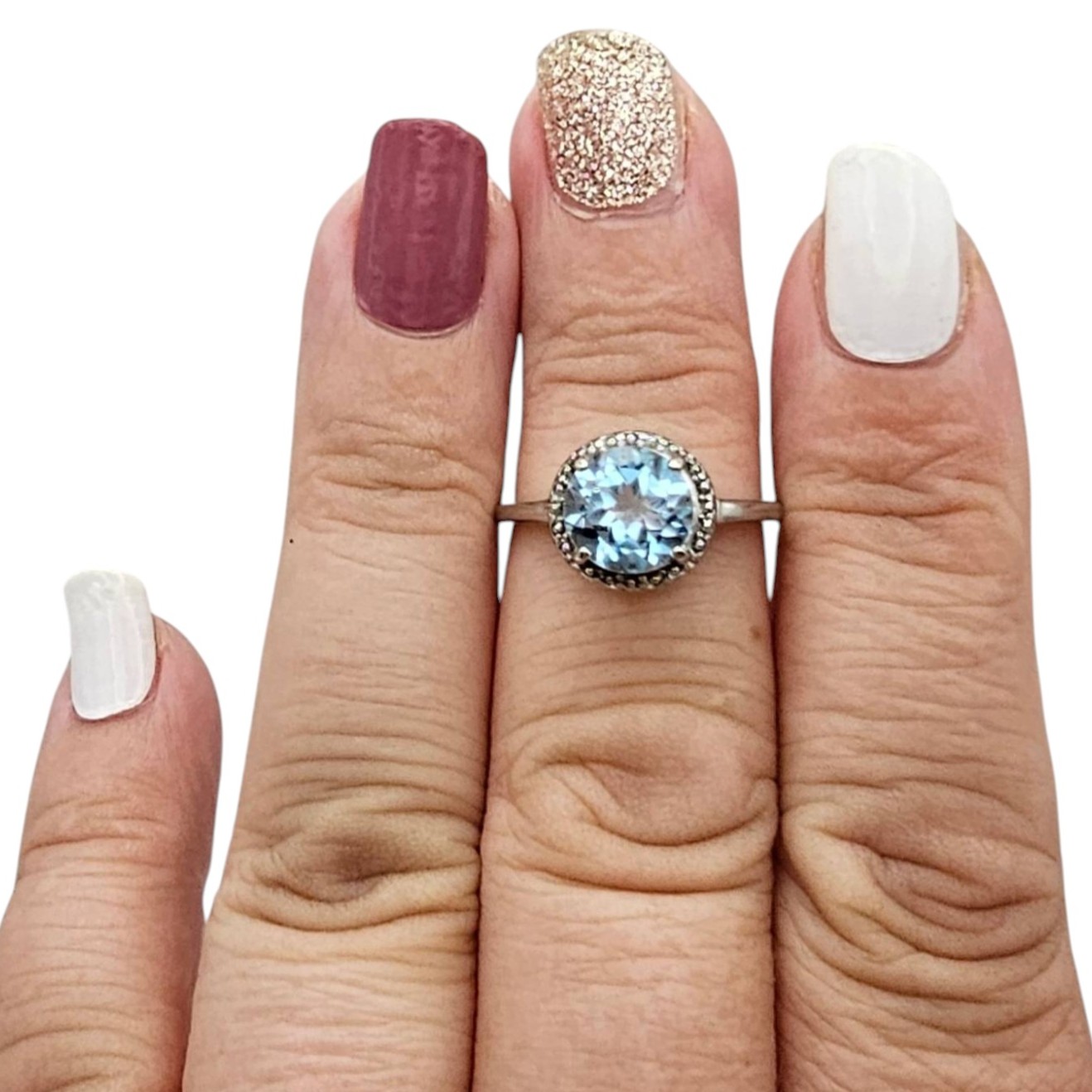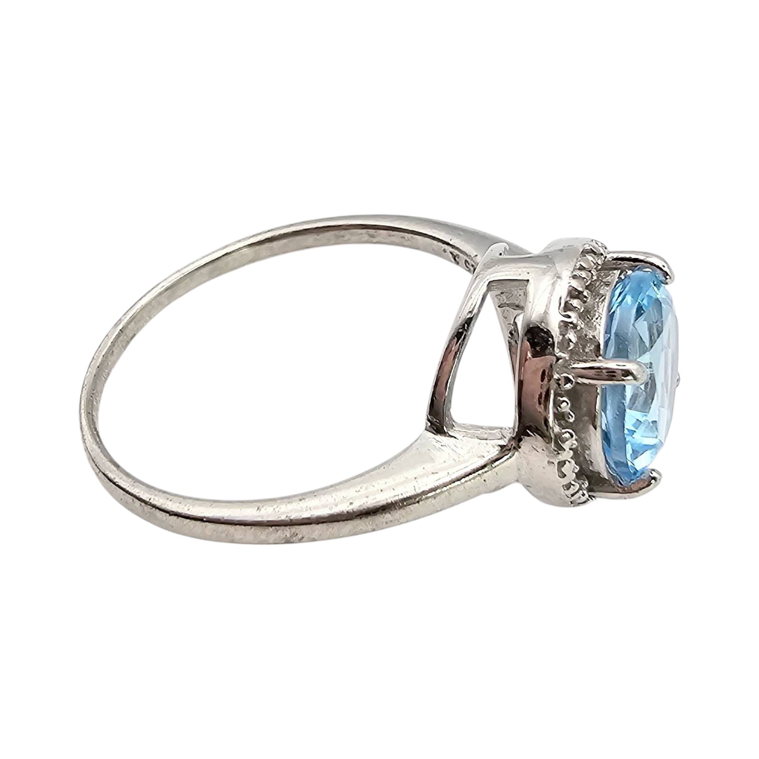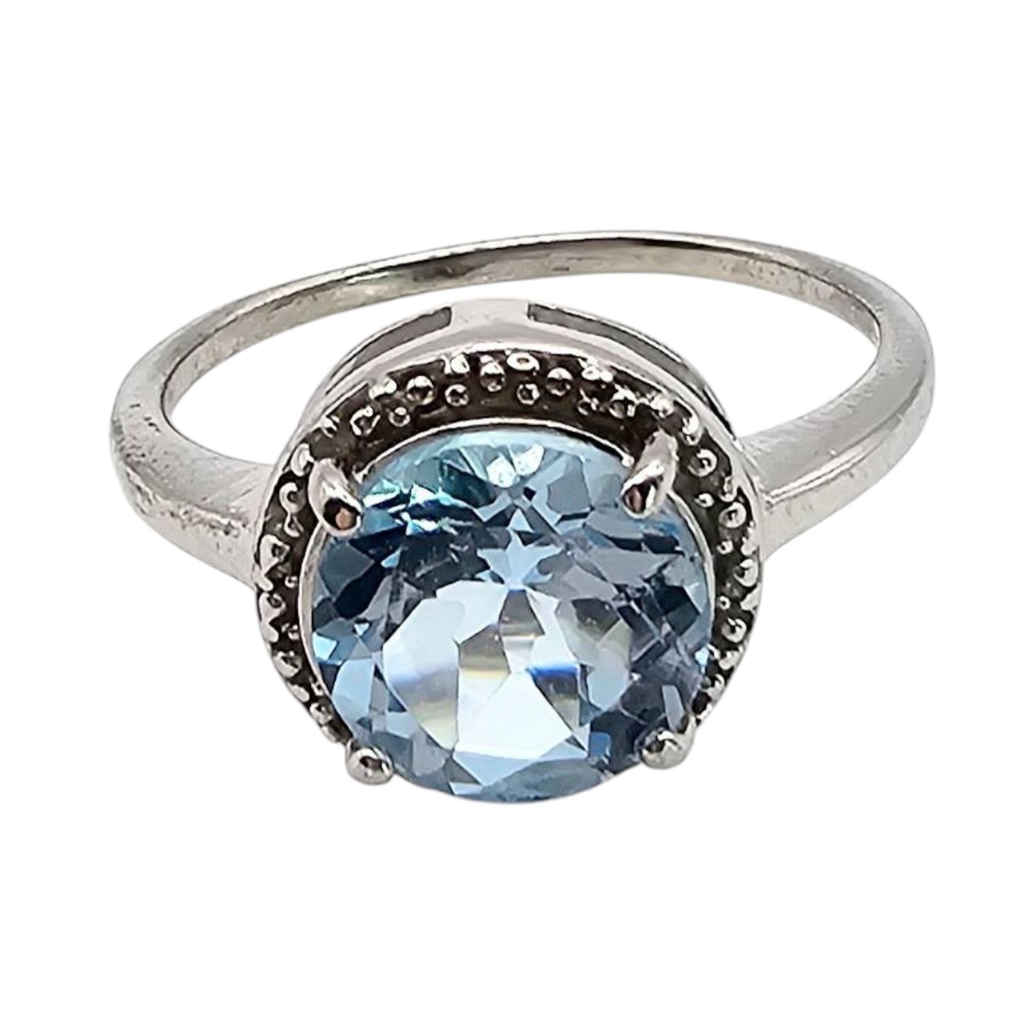 Sterling silver ring featuring a round blue topaz stone set in a decorative bezel. Ring size is 6.5 and it weighs 2.7 grams. Ideal for casual or formal settings.