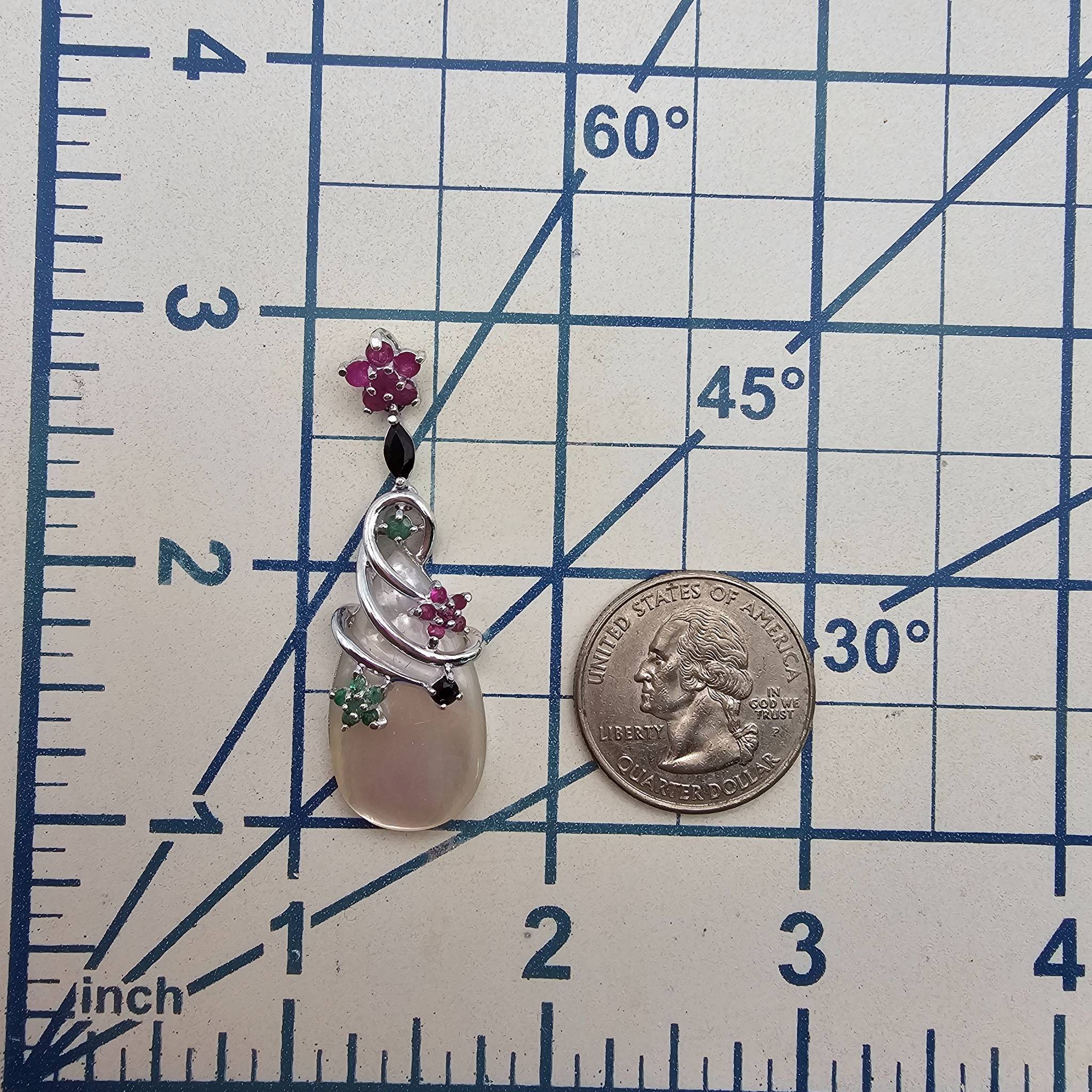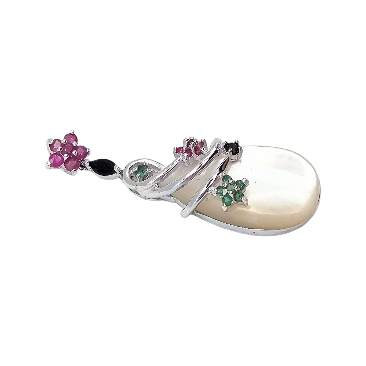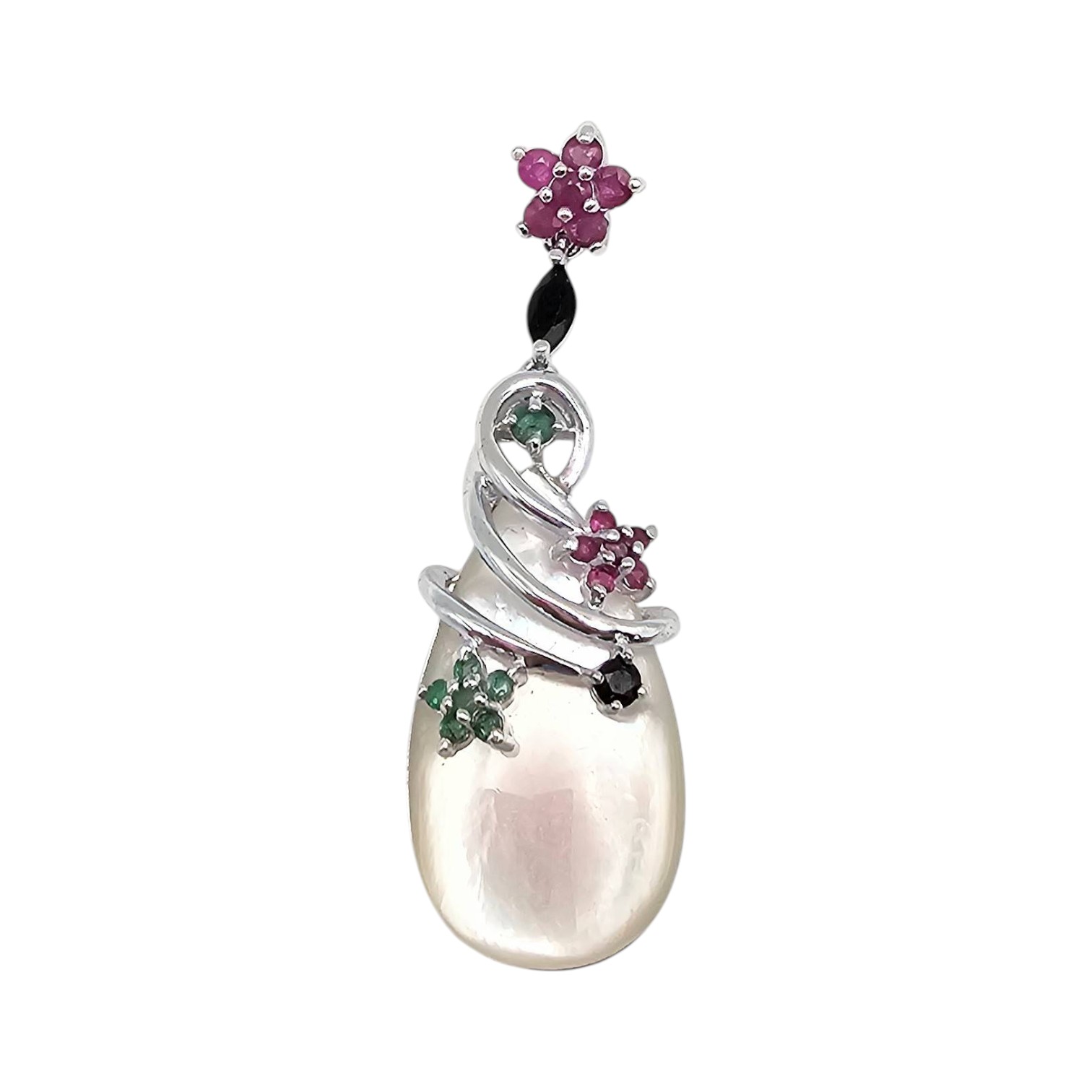 Ross-Simons sterling silver pendant featuring a teardrop-shaped mother-of-pearl centerpiece adorned with gemstones including emeralds, rubies, and sapphires. The exquisite floral and swirl design integrates colored stones in a polished sterling silver setting. Weighs 6.1 grams. Measures approximately 2 inches in height, as displayed with a quarter for scale.