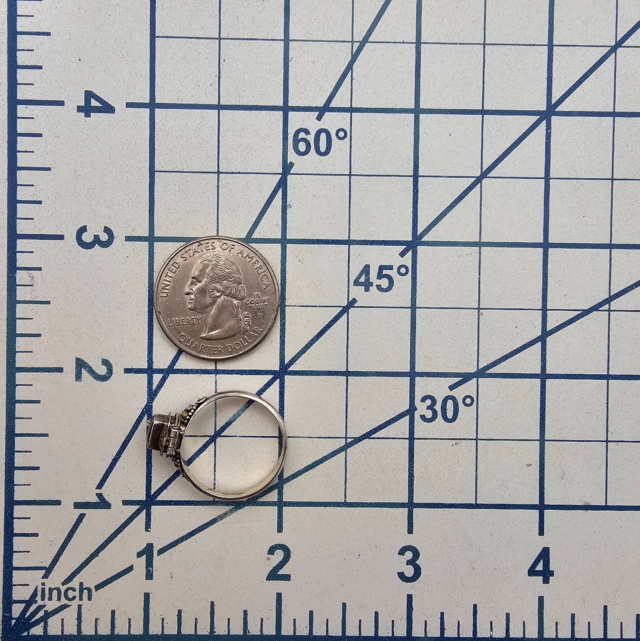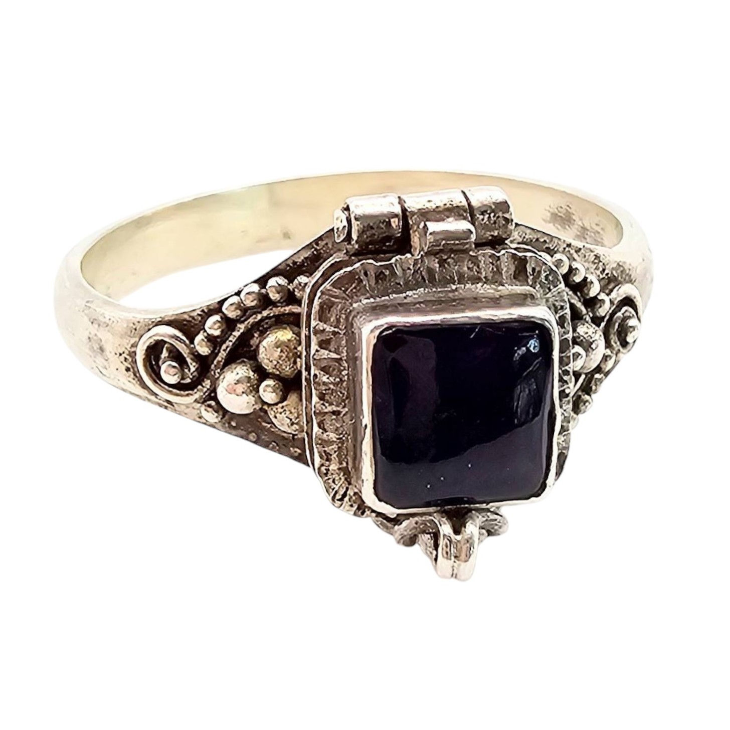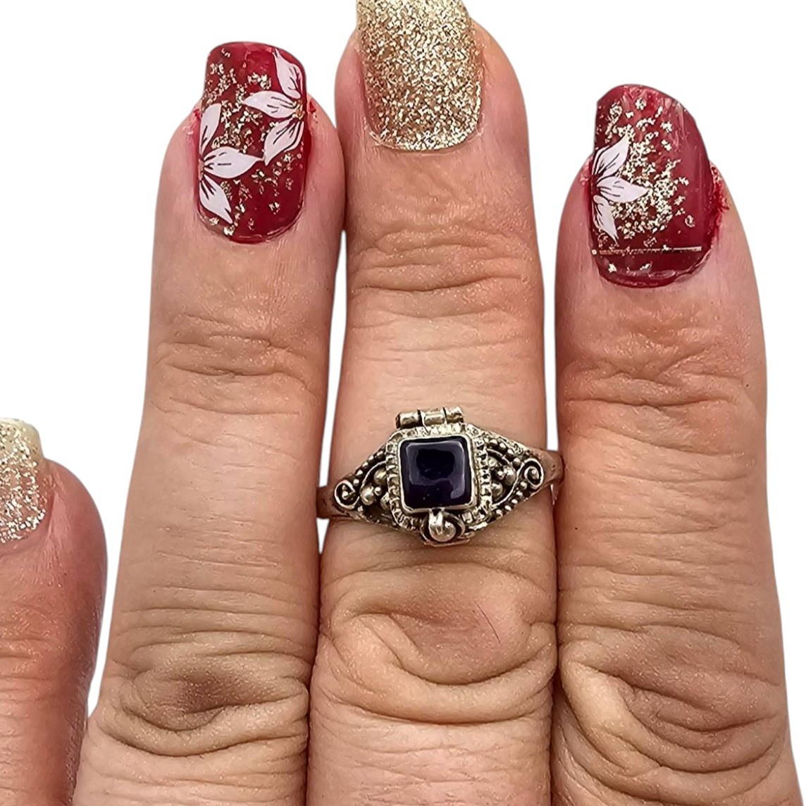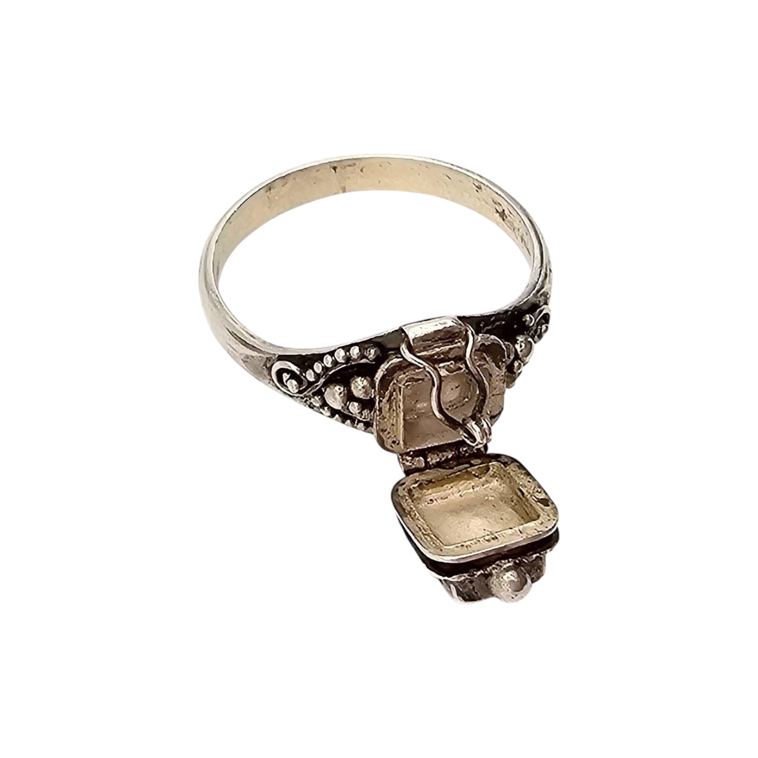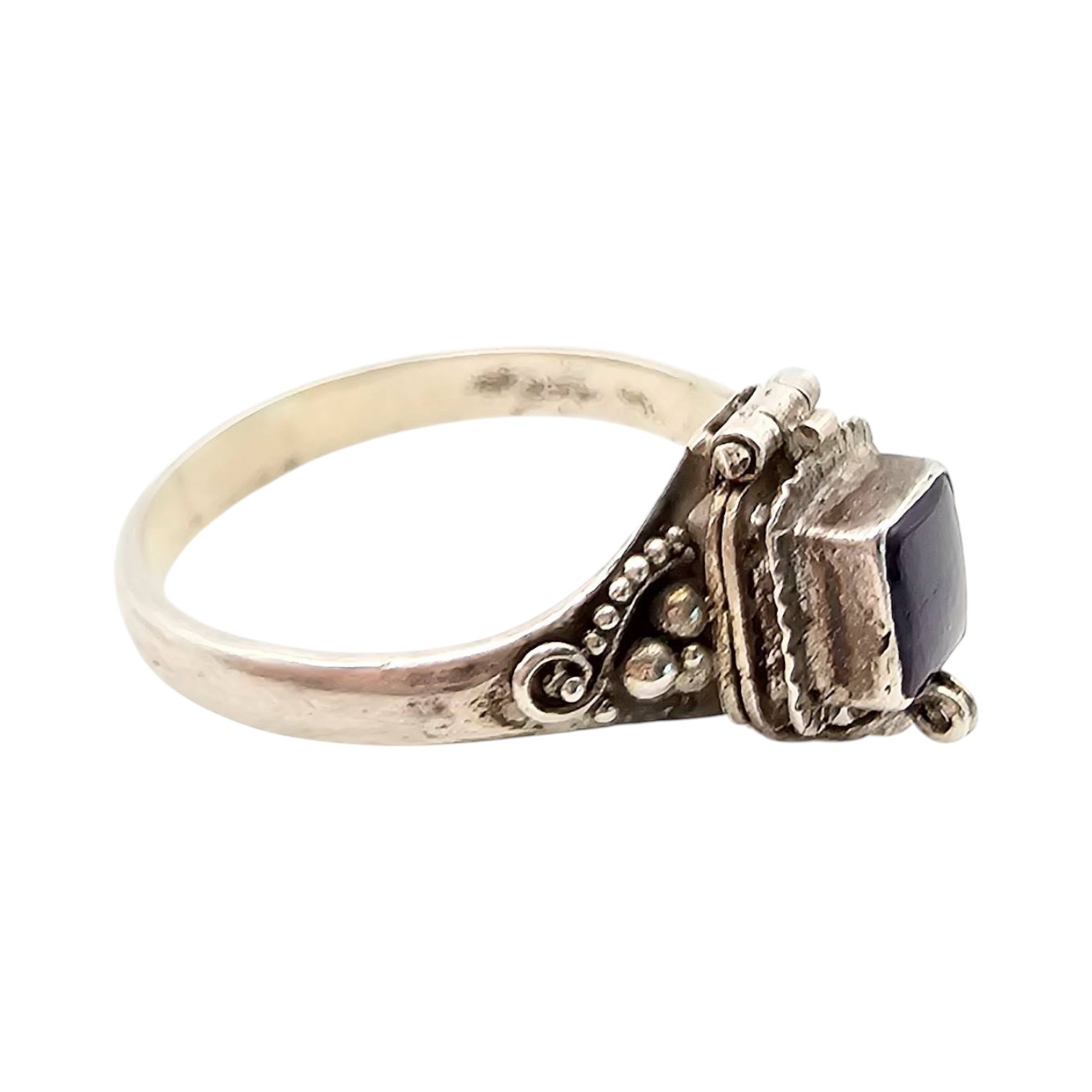 Sterling silver poison ring featuring a square amethyst gemstone as the centerpiece, complemented by ornate detailing on the band. Crafted from sterling silver, this hinged ring includes a secret compartment that opens under the stone. Ring size is 8.25 and is in good condition with visible signs of craftsmanship.