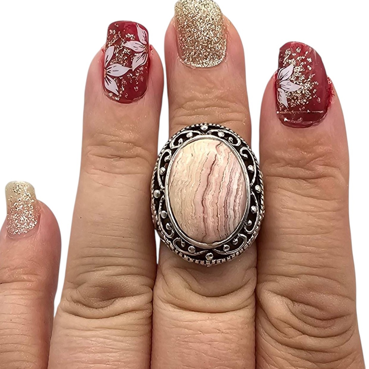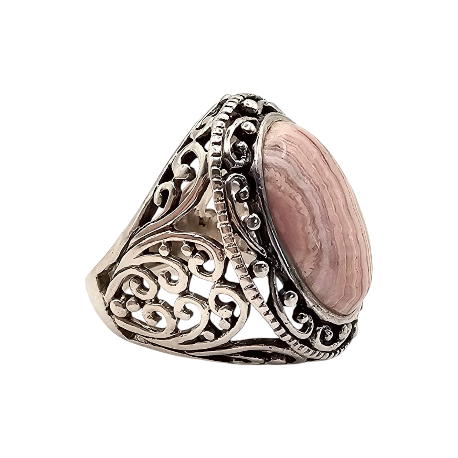 Sterling silver ring featuring an oval pink lace agate gemstone as the centerpiece, encased within ornate scrolling details around the setting. The ring weighs 10 grams. Ring size is 6.25. The gemstone displays natural pink and cream banding textures.