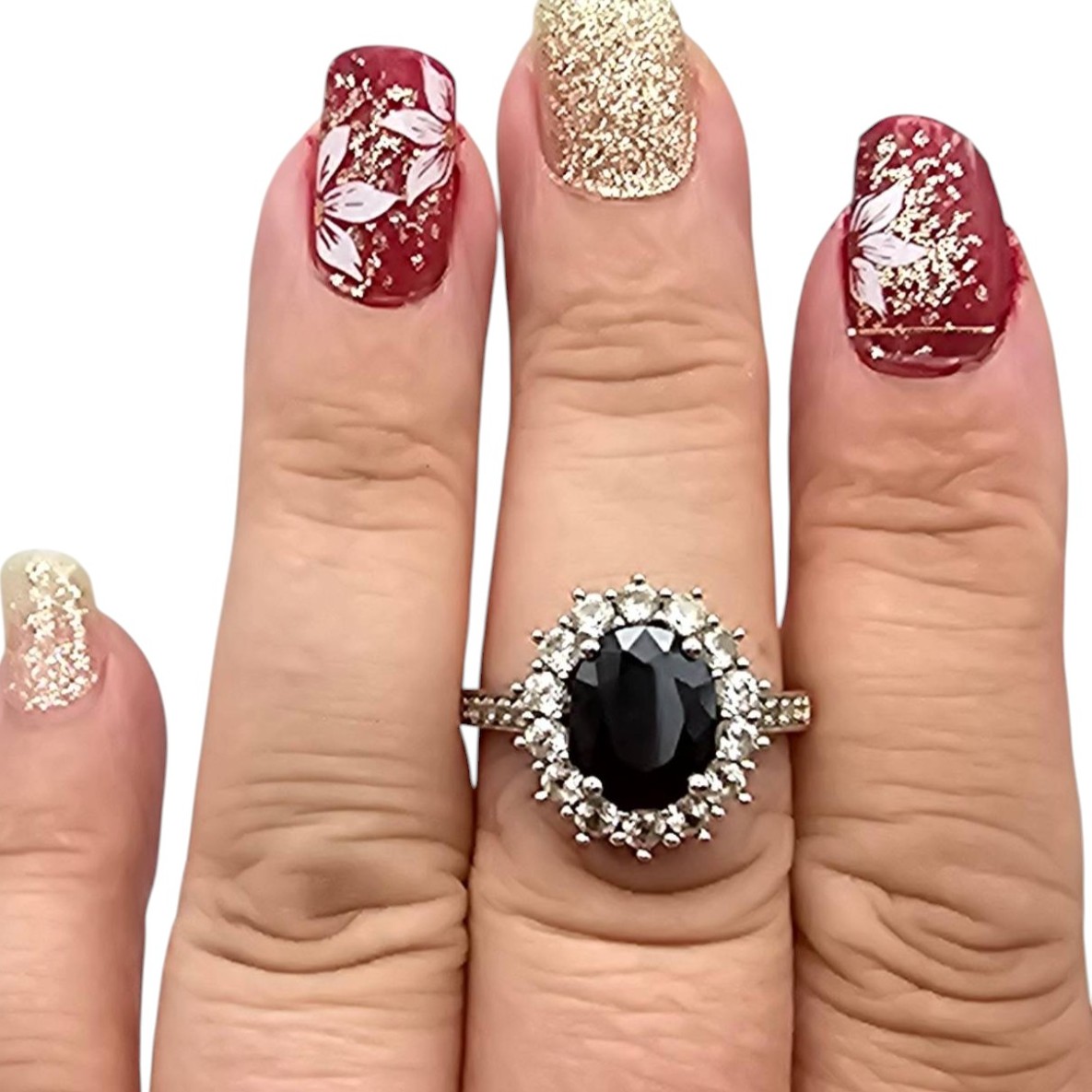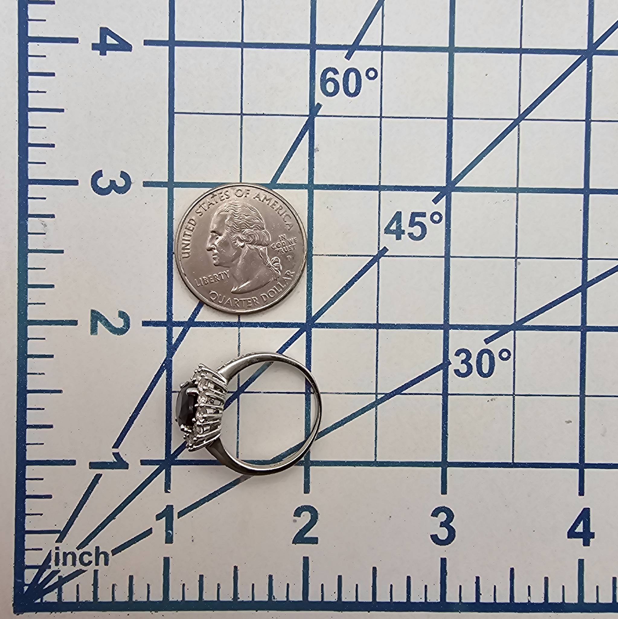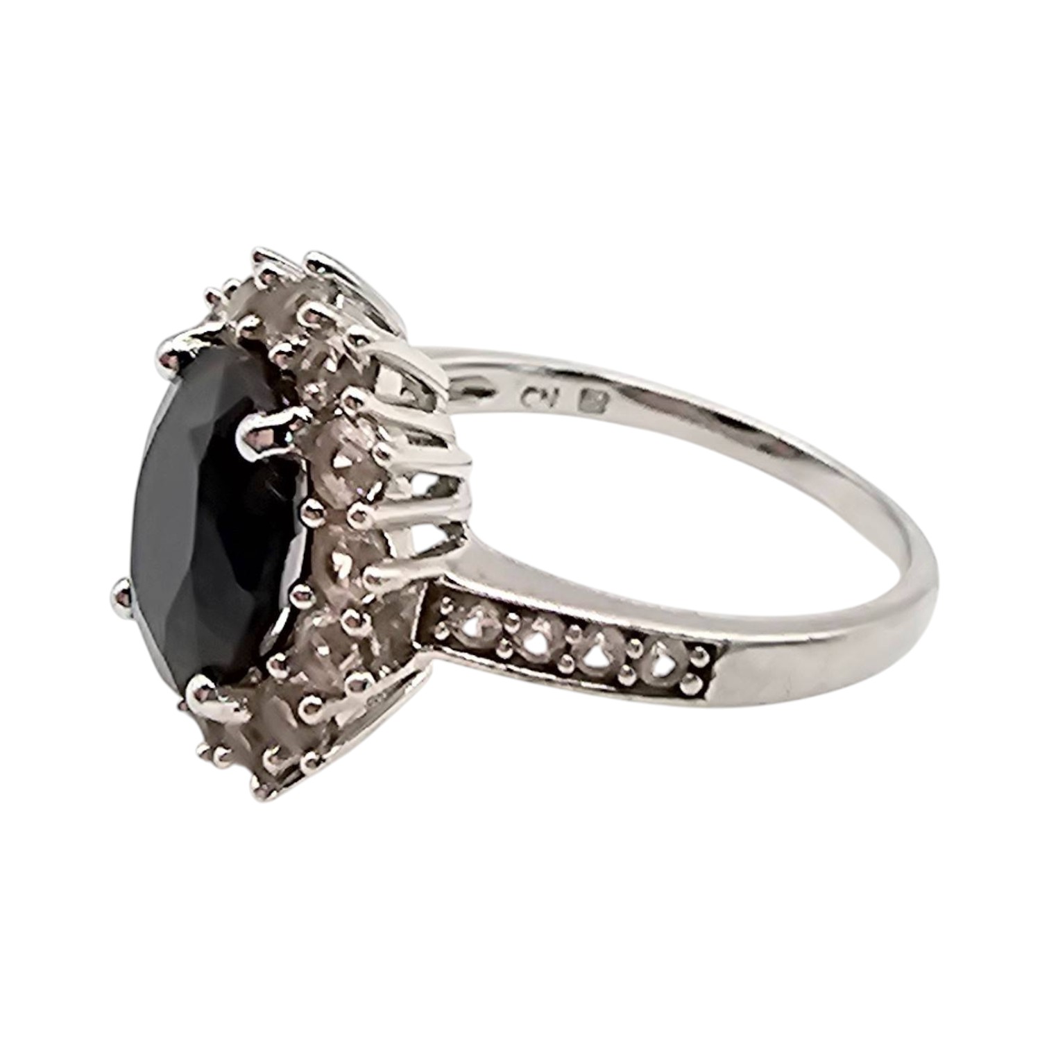 Sterling silver ring featuring a dark sapphire centerpiece surrounded by a halo of smaller stones. The ring is hallmarked ‘CN’. Size 8 and weighs 4.7g. Elegant design with detailed accents on the band.