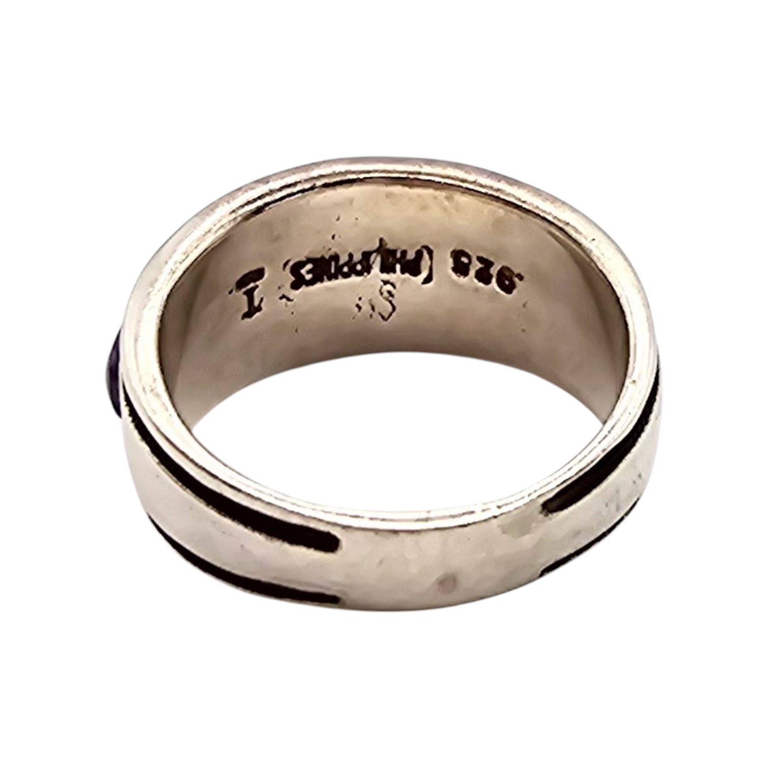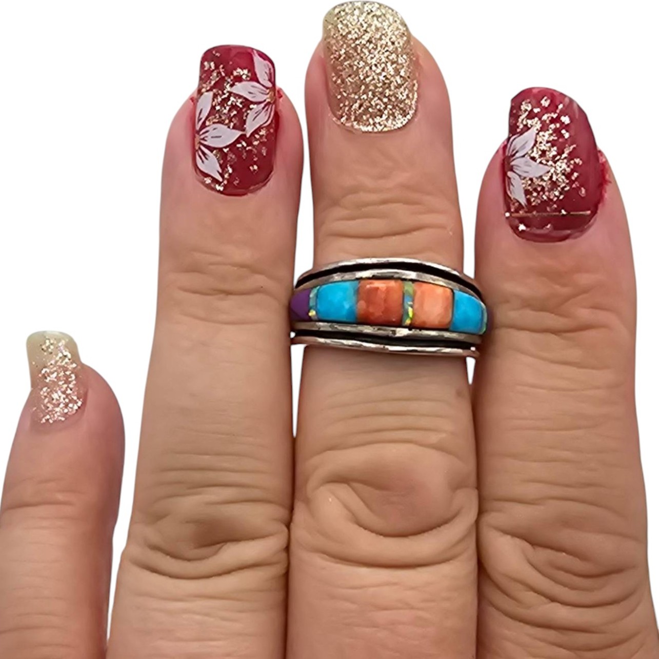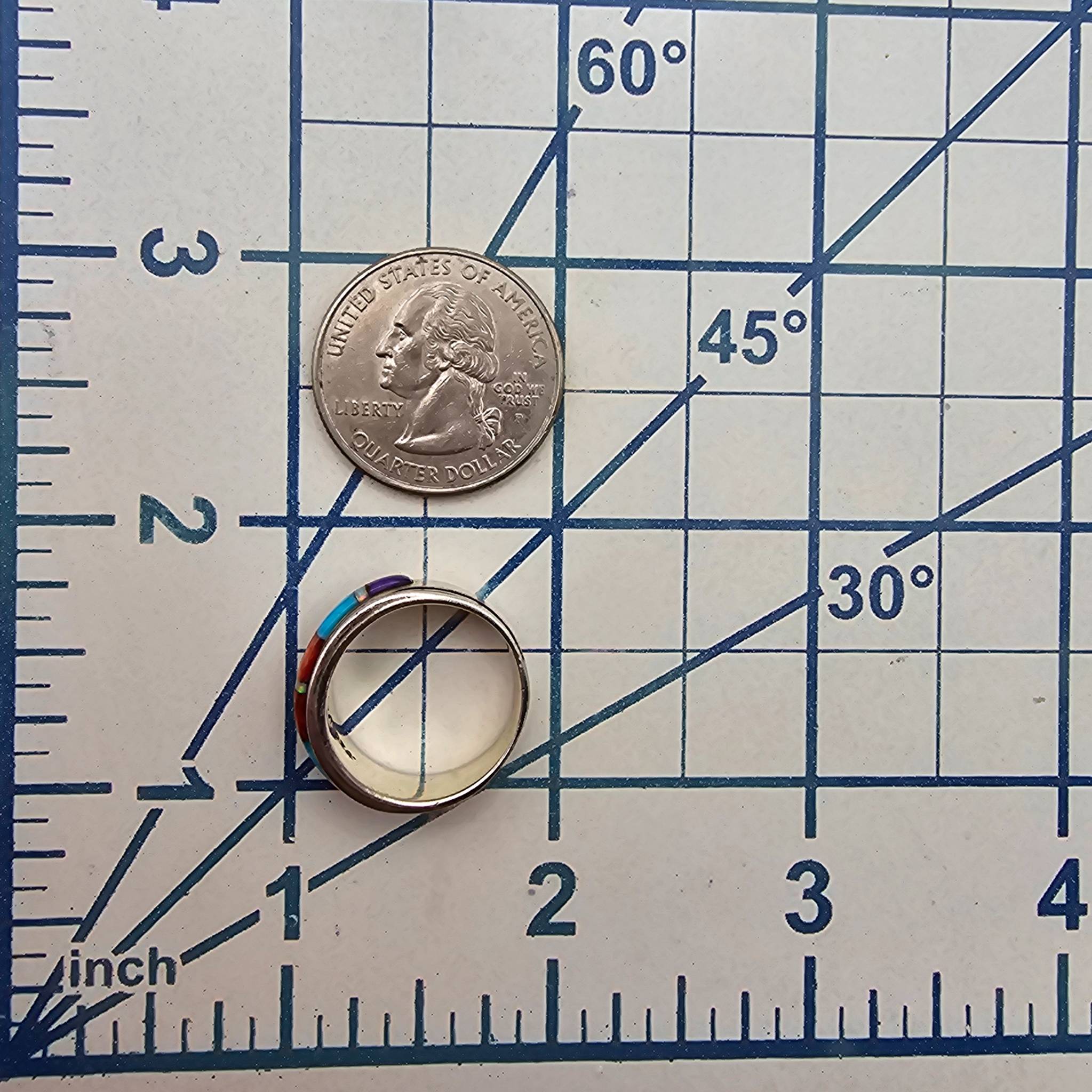 Southwestern-style ring crafted in sterling silver featuring spiny oyster and opal inlay accents. The ring is a size 6.5 and weighs 4.9 grams. The design includes multicolor inlays set in a sterling silver band and is stamped with ‘925’ along with a maker’s mark. Ideal for collectors of Southwestern jewelry.