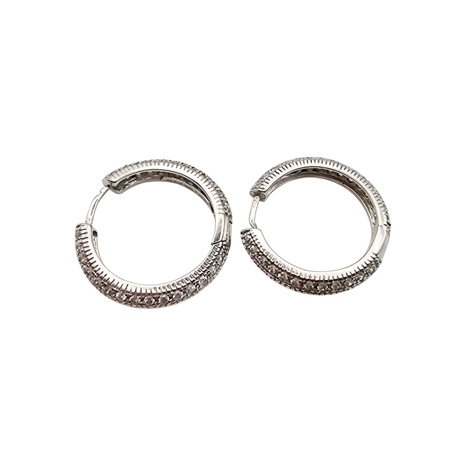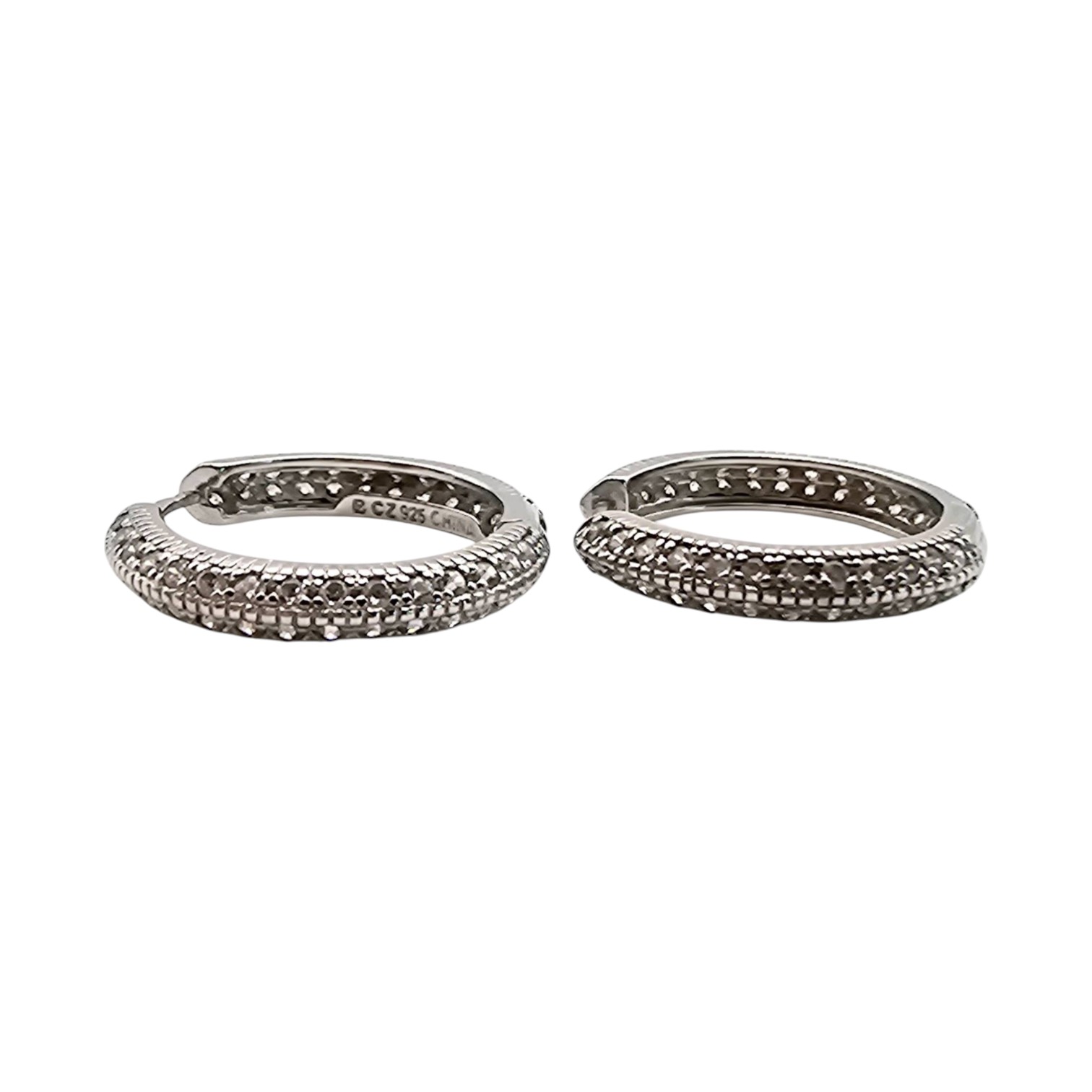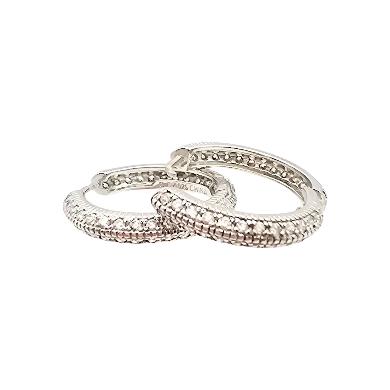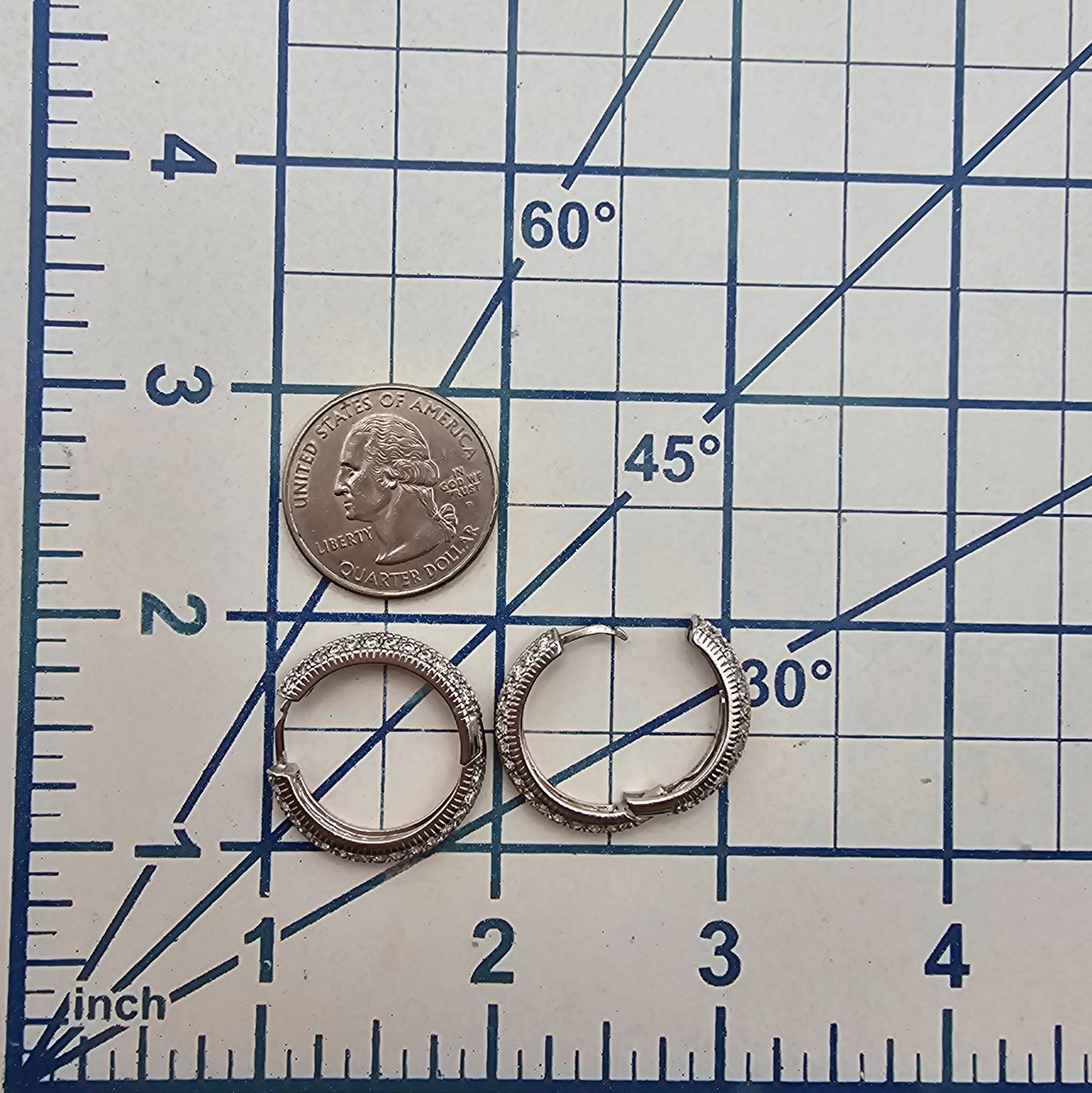 Ross-Simons hoop earrings crafted from sterling silver with cubic zirconia embellishments. Weighing approximately 7.2 grams, these earrings feature an intricate design and high polish finish. Marked ‘925’ on the inner band, confirming material and origin. Diameter measures approximately 1 inch.